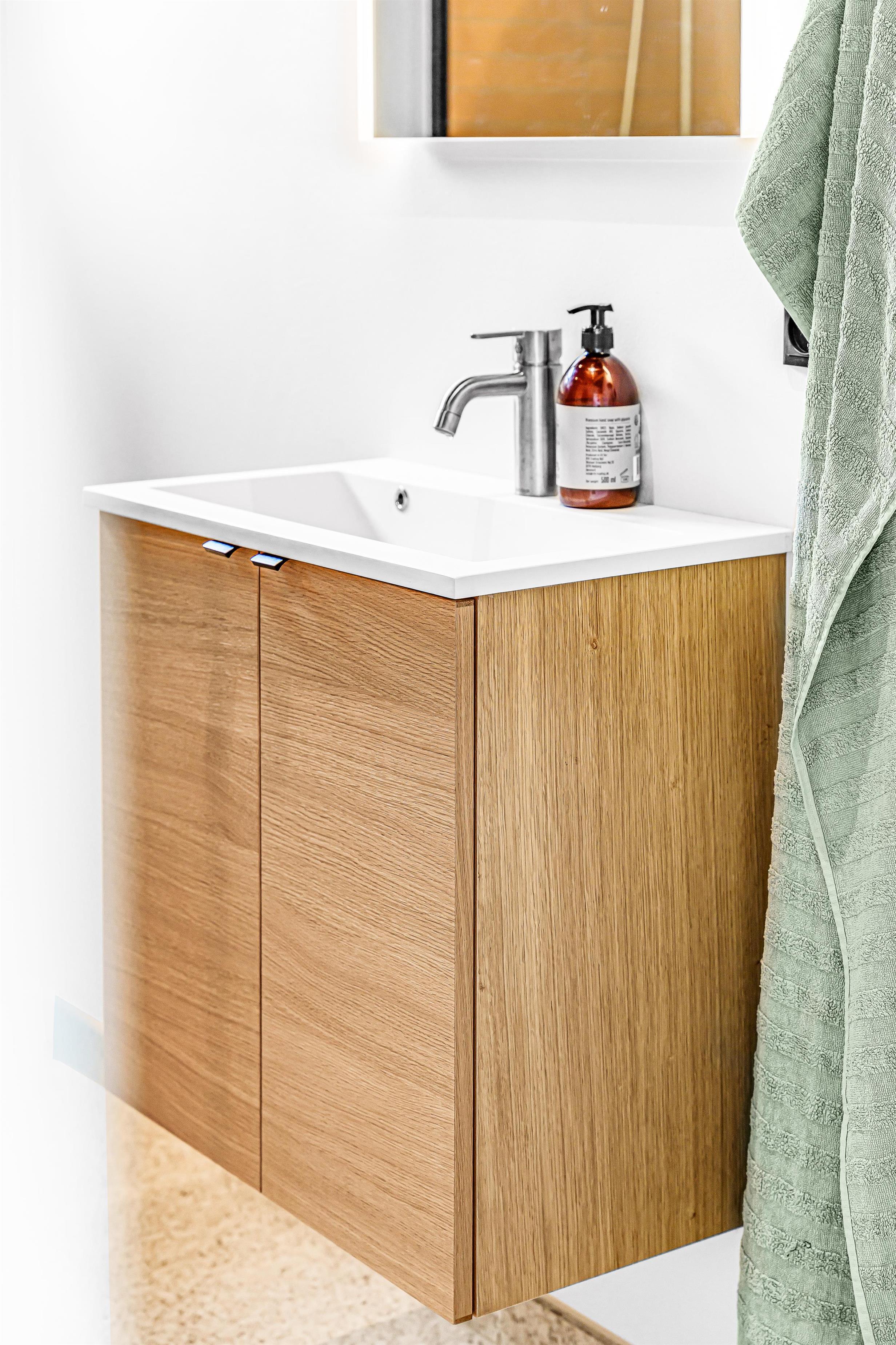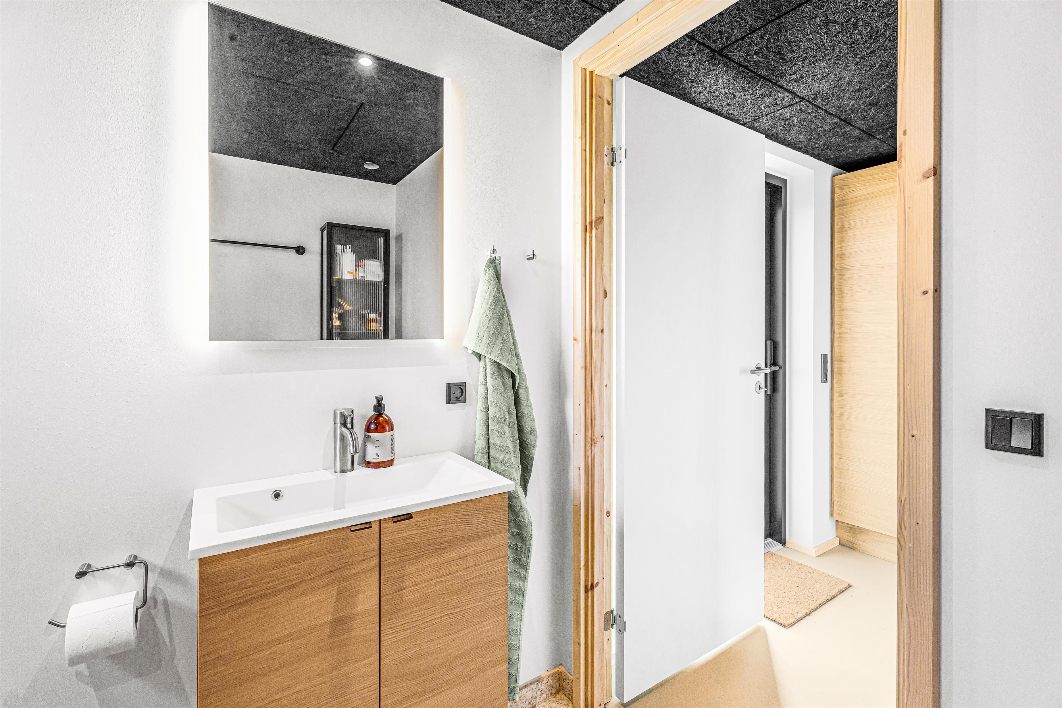 Huset har et lækkert badeværelse med toilet, håndvask, bruser og opvarmes med gulvvarme.
