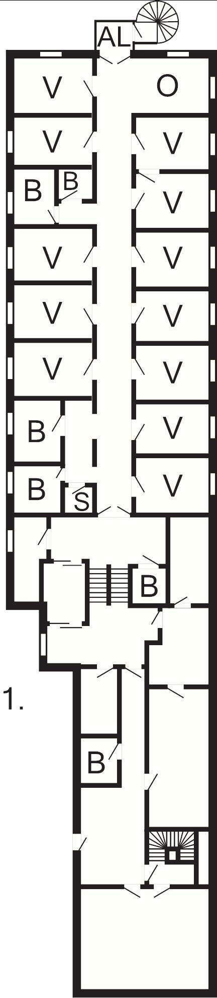 · Standard enkeltværelse – 12 m², en kompakt løsning med vask på værelset og adgang til fælles toilet og bad.