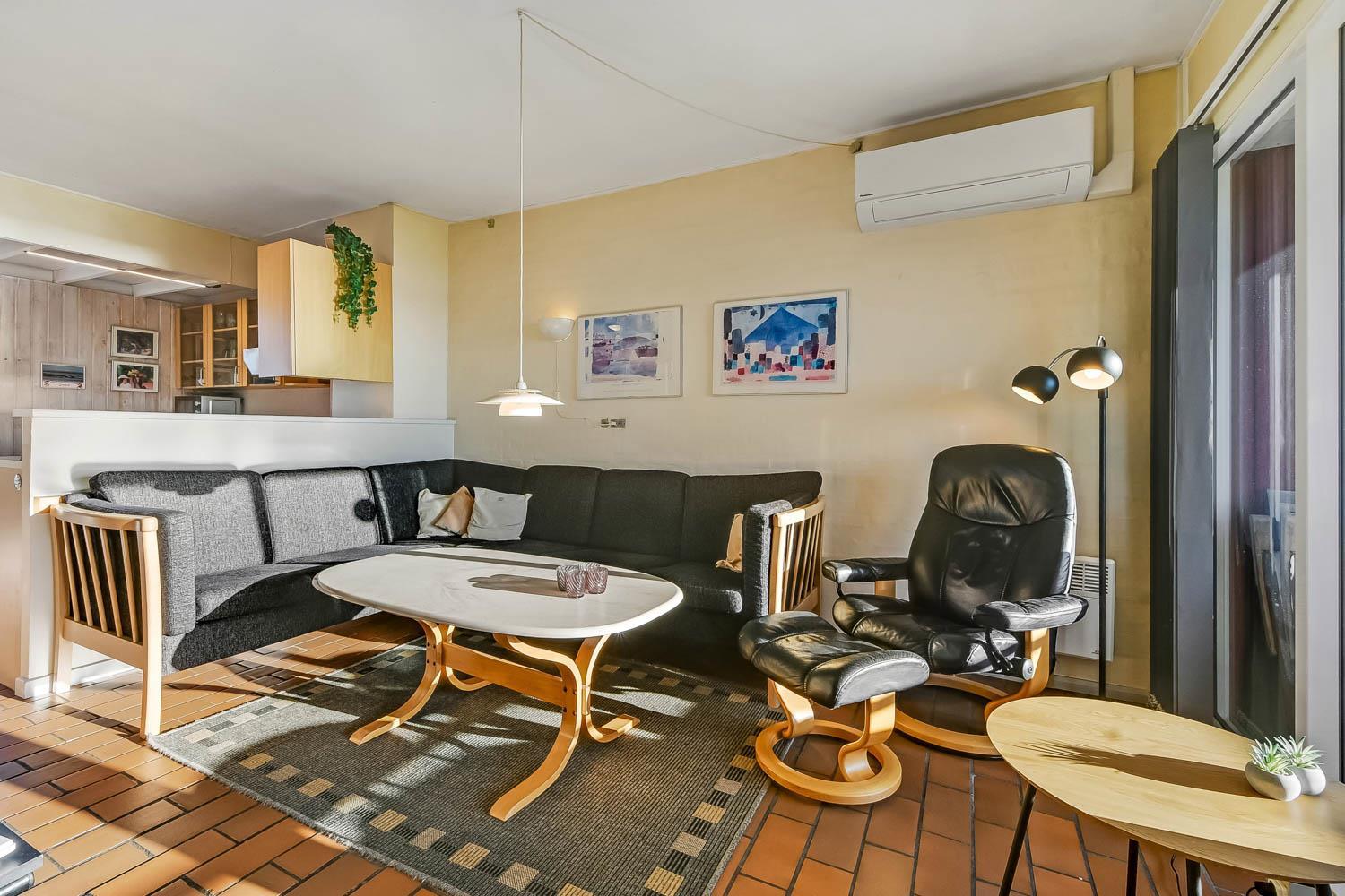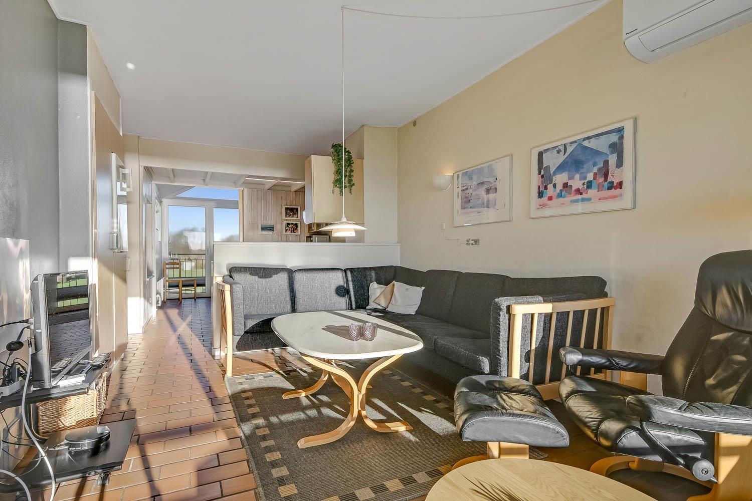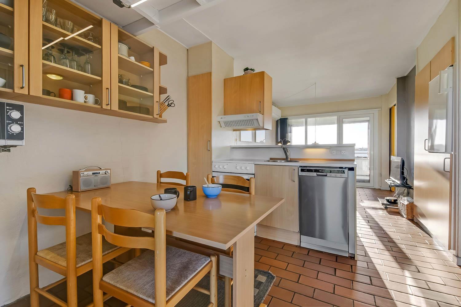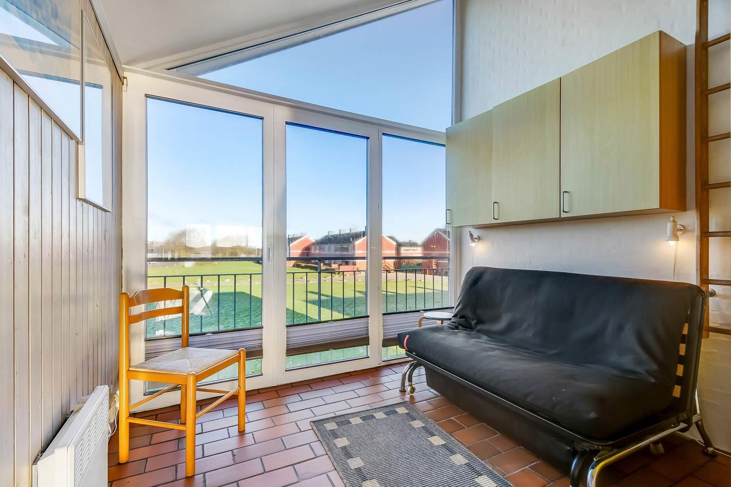 Køkkenet og stuen er i samme rum. Køkkenet har glaskeramisk komfur. køle-/fryseskab, mikrobølgeovn og opvaskemaskine. I selve opholdstuen er der varmepumpe samt cd- og DVD-afspiller. Hertil kommer der et Smart-TV med DR, TV2 og tysk EUROSPORT1 og RTL. Badeværelset har både bruser, toilet og håndvask, så her er hvad man har brug for. Der er to soveværelser i lejligheden. I det ene soveværelse er der en dobbeltseng og i det andet rum er der en sovesofa, som kan slås ud som dobbeltseng. I rummet med sovesofaen er der også via stige adgang til en hems med en madras på 120 X 90 hvor man kan sove. Fra stuen er der direkte udgang til den sydvendte balkon med havemøbler. Her er der basis for en hyggelig stund hvorfra man kan nyde udsigten over Limfjorden og Lemvig både morgen, middag og aften. Har man el-bil eller en Plug-In hybrid, så er der 4 Ladebokse til Type 2 ladestik, der kan lade op til 11 kWh ved Feriecenteret - de er lige efter miljøstationen.