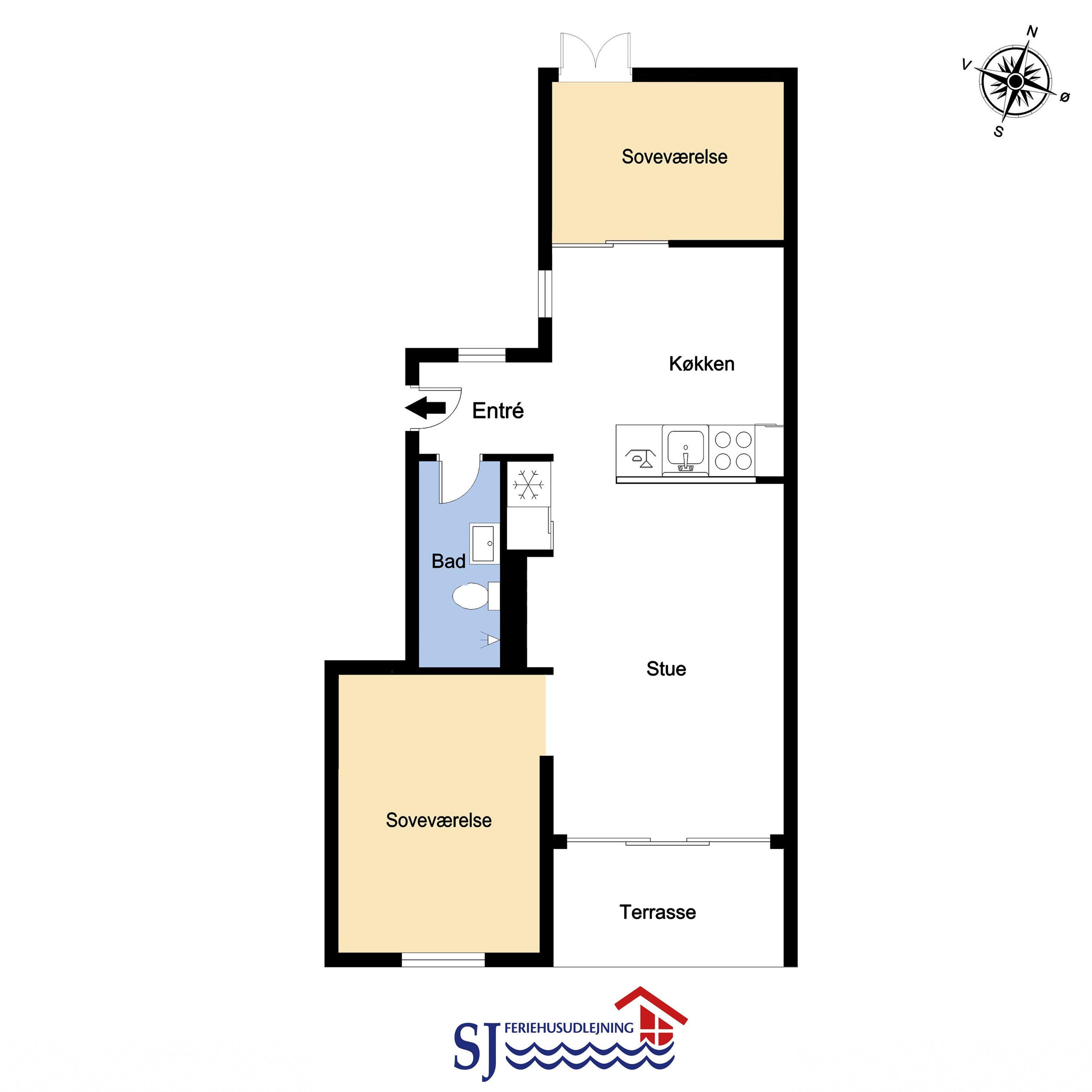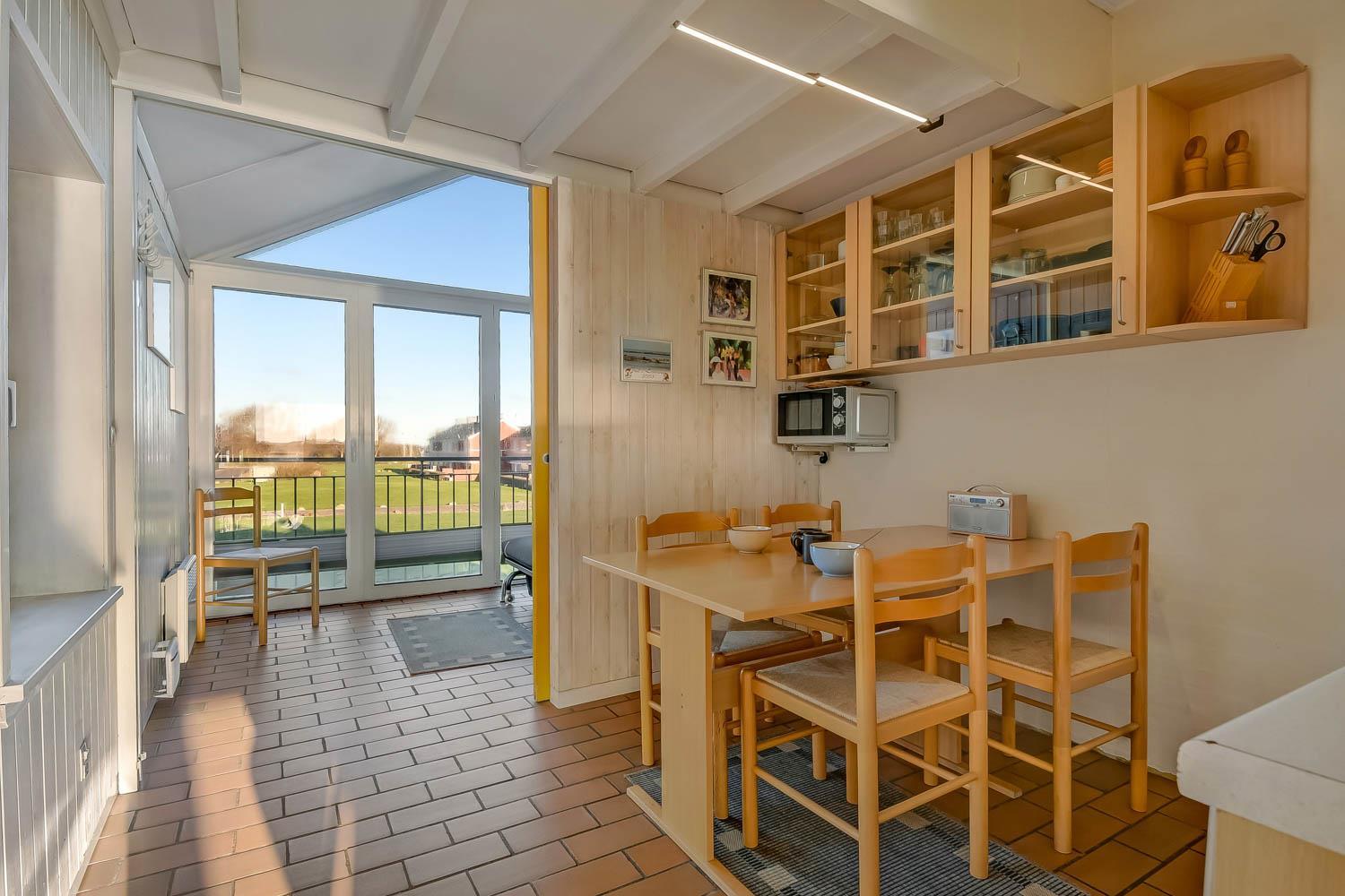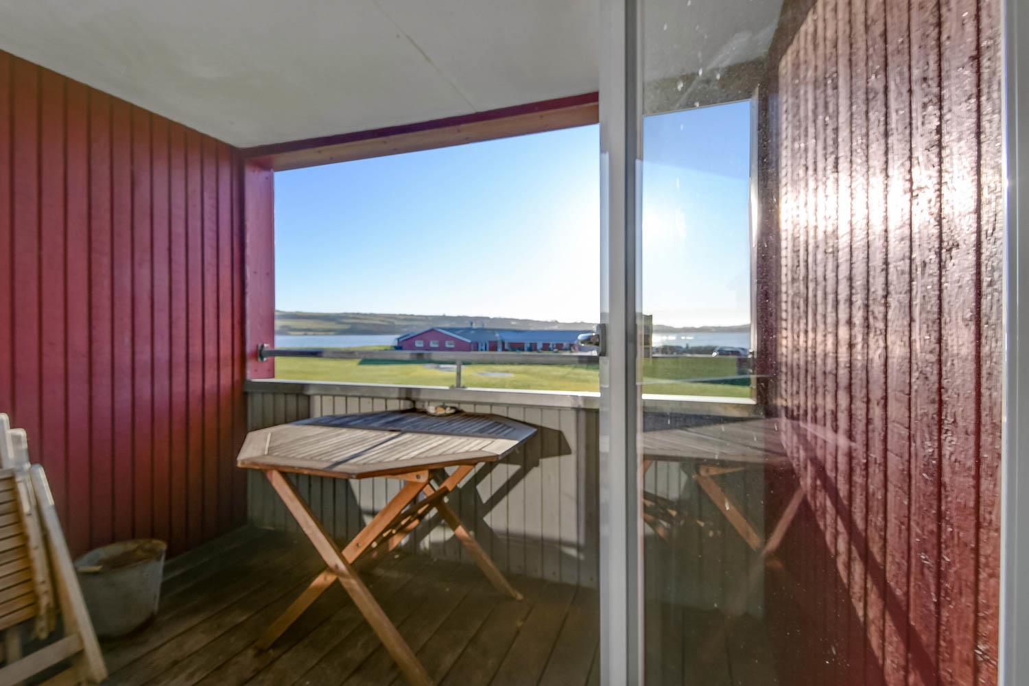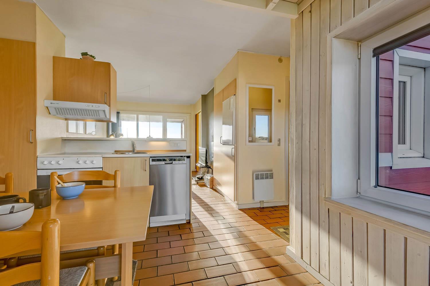 Køkkenet og stuen er i samme rum. Køkkenet har glaskeramisk komfur. køle-/fryseskab, mikrobølgeovn og opvaskemaskine. I selve opholdstuen er der varmepumpe samt cd- og DVD-afspiller. Hertil kommer der et Smart-TV med DR, TV2 og tysk EUROSPORT1 og RTL. Badeværelset har både bruser, toilet og håndvask, så her er hvad man har brug for. Der er to soveværelser i lejligheden. I det ene soveværelse er der en dobbeltseng og i det andet rum er der en sovesofa, som kan slås ud som dobbeltseng. I rummet med sovesofaen er der også via stige adgang til en hems med en madras på 120 X 90 hvor man kan sove. Fra stuen er der direkte udgang til den sydvendte balkon med havemøbler. Her er der basis for en hyggelig stund hvorfra man kan nyde udsigten over Limfjorden og Lemvig både morgen, middag og aften. Har man el-bil eller en Plug-In hybrid, så er der 4 Ladebokse til Type 2 ladestik, der kan lade op til 11 kWh ved Feriecenteret - de er lige efter miljøstationen.