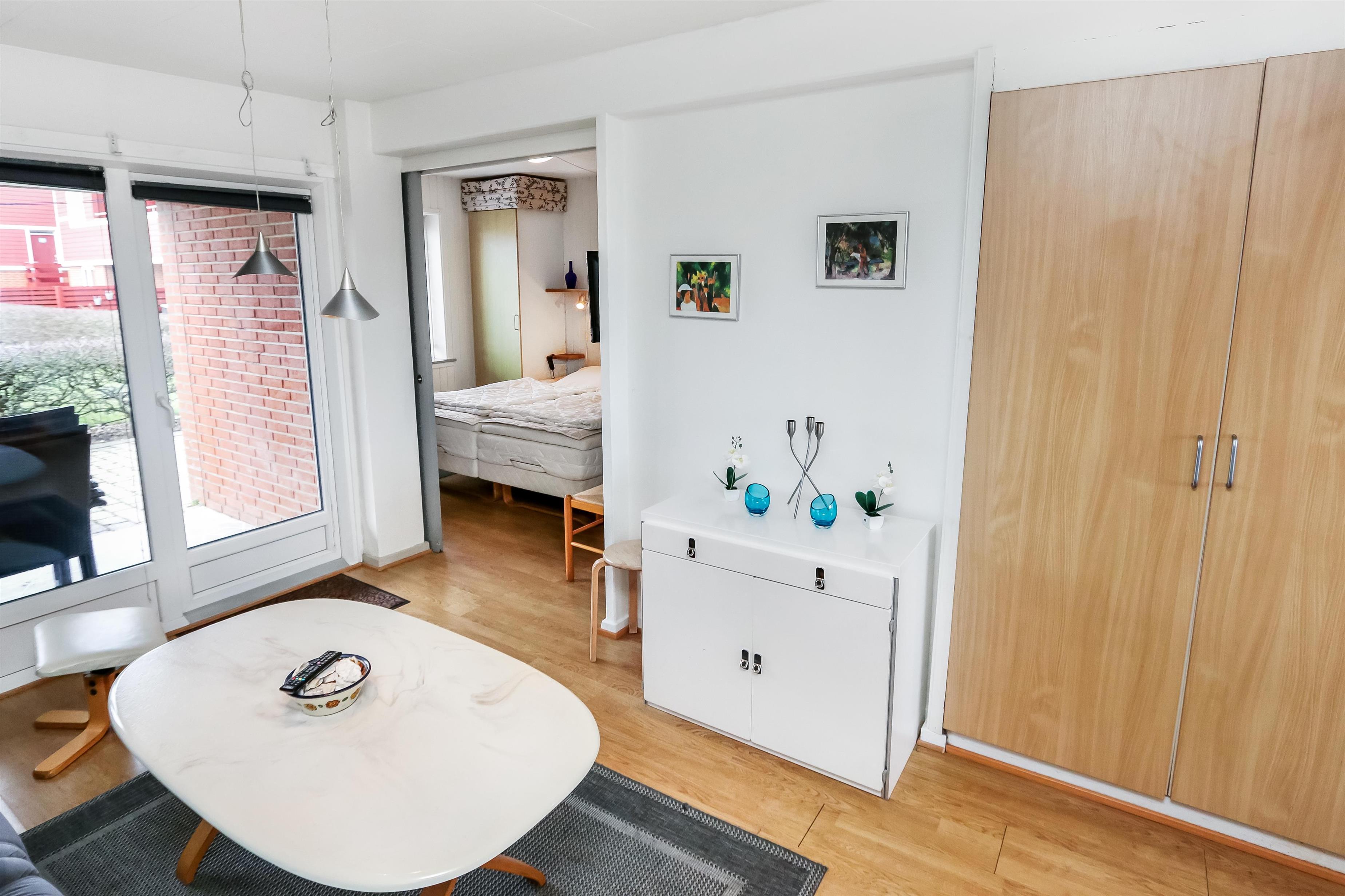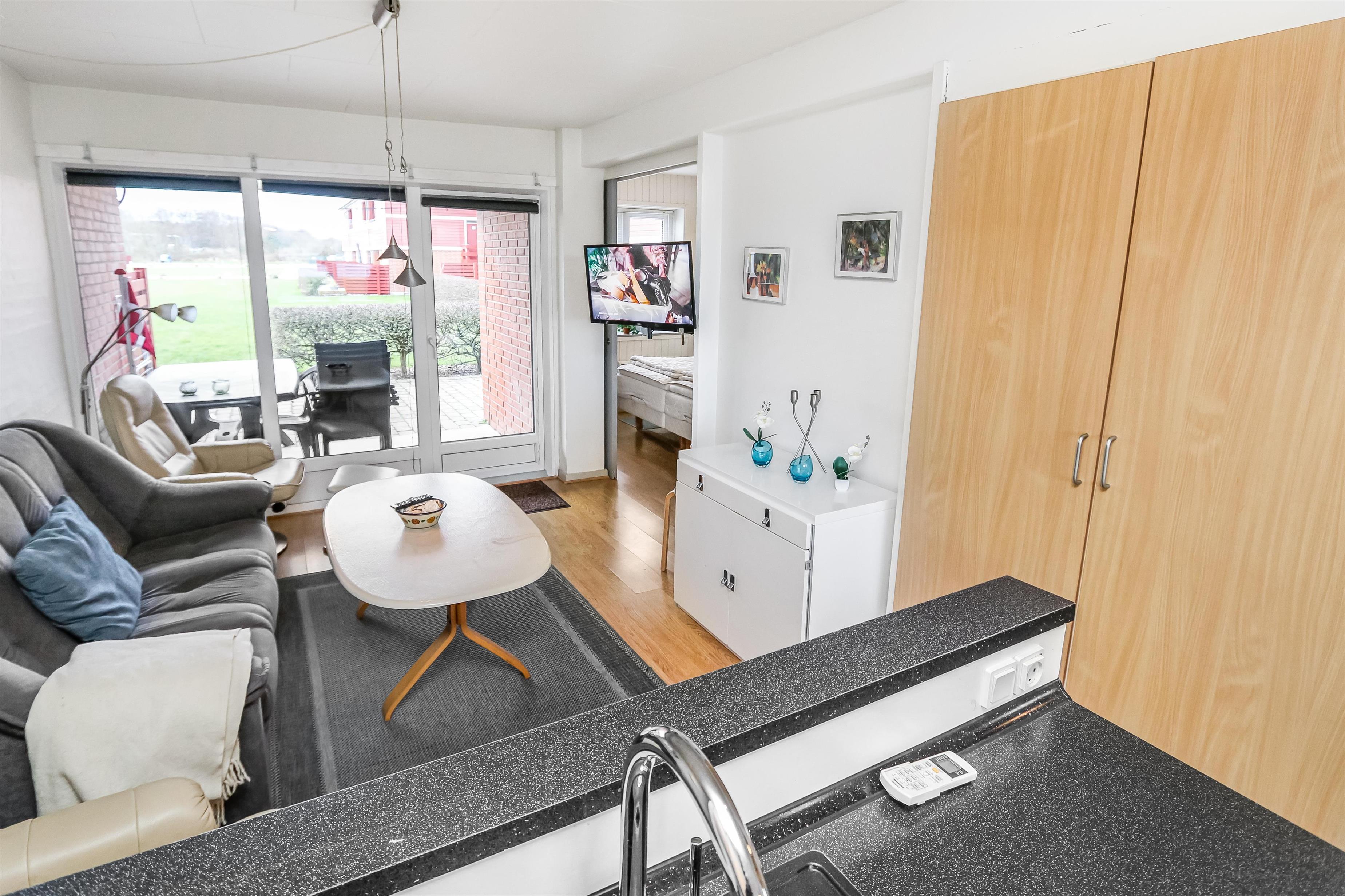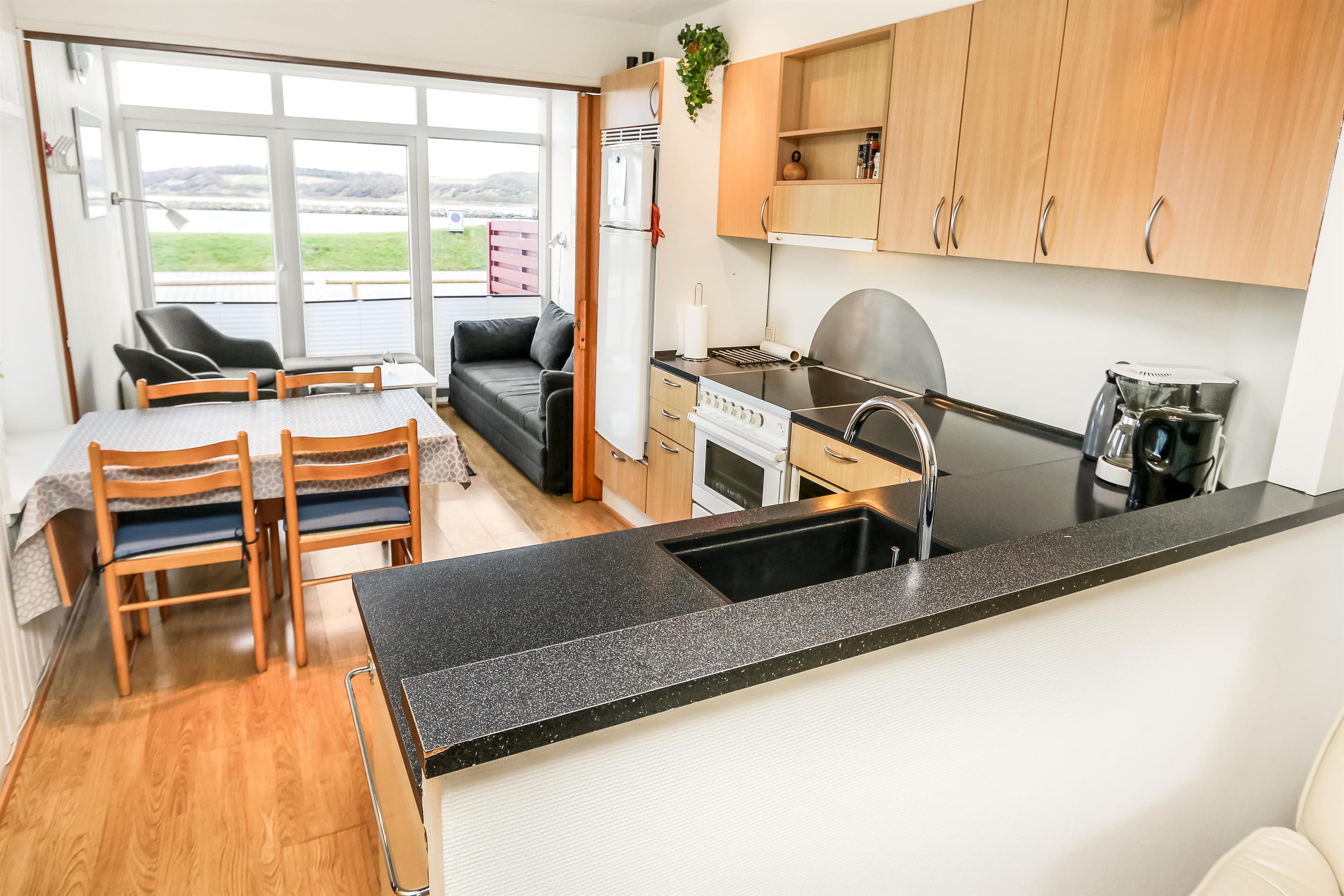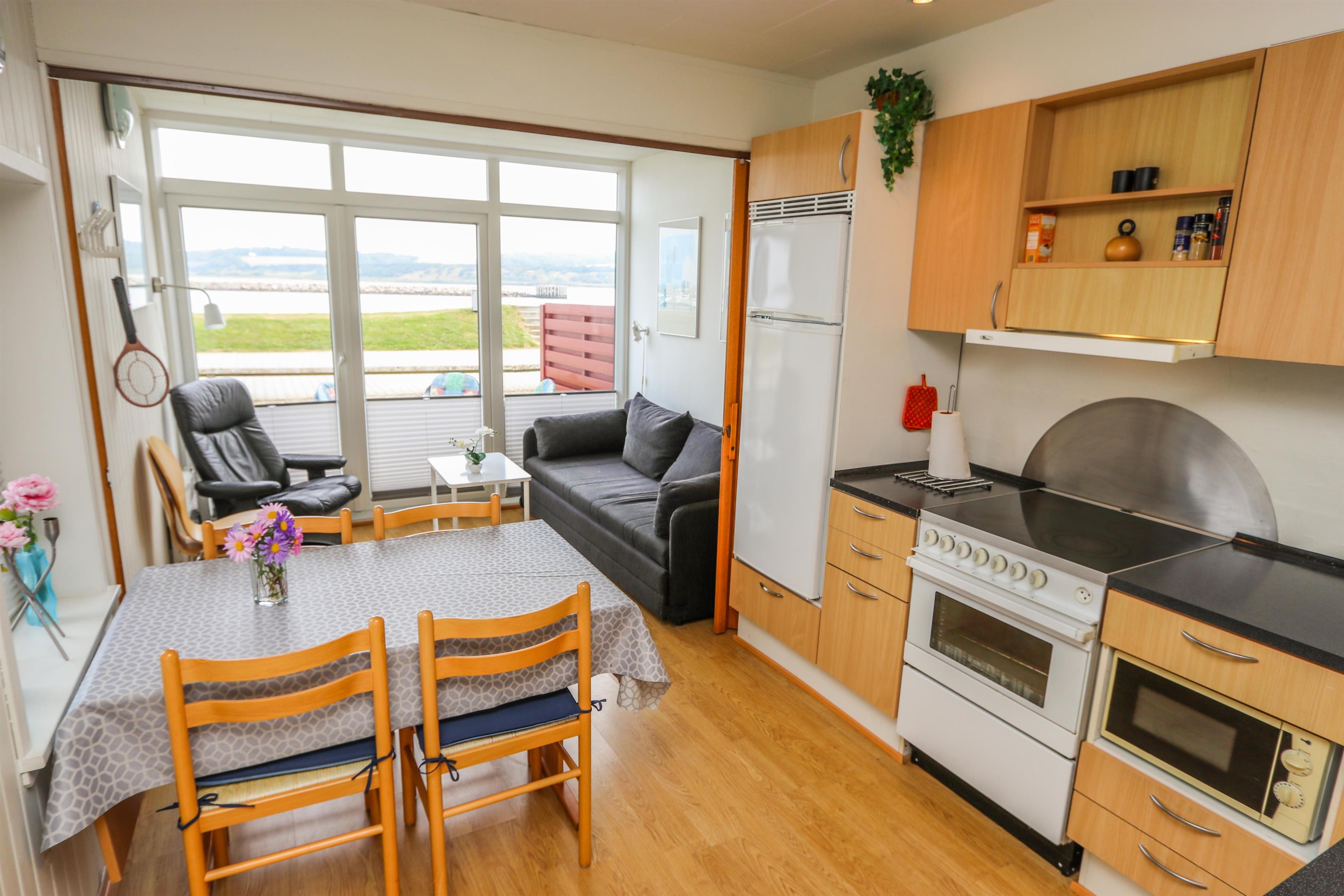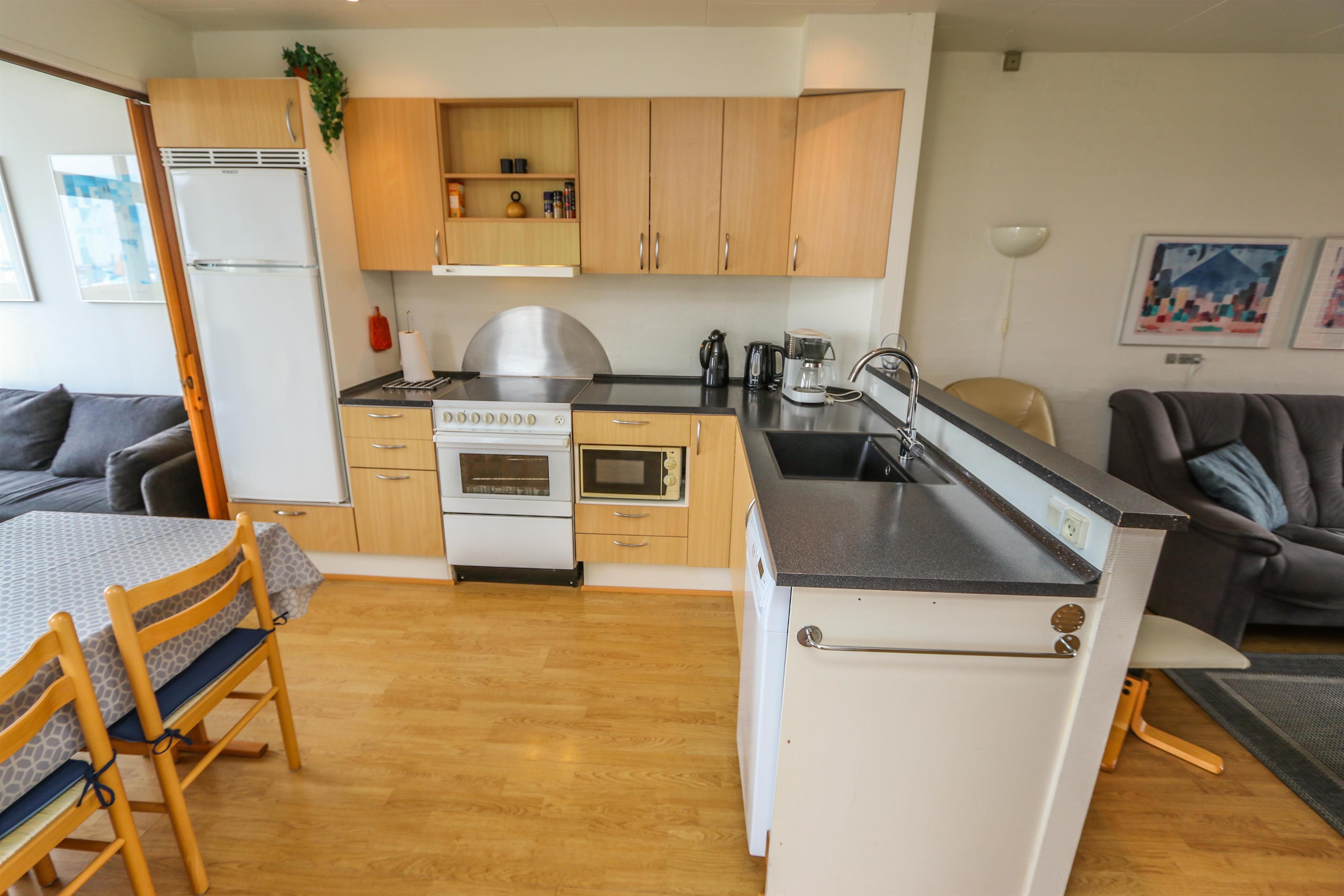 Stue og køkken i et. Køkkenhjørne med emhætte, glaskeramisk komfur, mikrobølgeovn, opvaskemaskine og køle/fryseskab. Der er naturligvis også et spisebord med stole. Opholdsstuen er hyggelig indrettet med fladskærm hvorfra man kan se følgende kanaler: DR, TV2 samt tysk EUROSPORT1 og RTL. Badeværelset har det man skal bruge - toilet, håndvask, bruser og klinkegulv med gulvvarme som gør det meget behageligt at benytte. Der findes også varmepumpe som er med til at spare på varmen. Udnyt også gerne lejlighedens terrasser som har både havemøbler og grill. Der er pænt badeværelse med toilet, håndvask og bruserniece. Har man el-bil eller en Plug-In hybrid, så er der 4 Ladebokse til Type 2 ladestik, der kan lade op til 11 kWh ved Feriecenteret - de er lige efter miljøstationen.