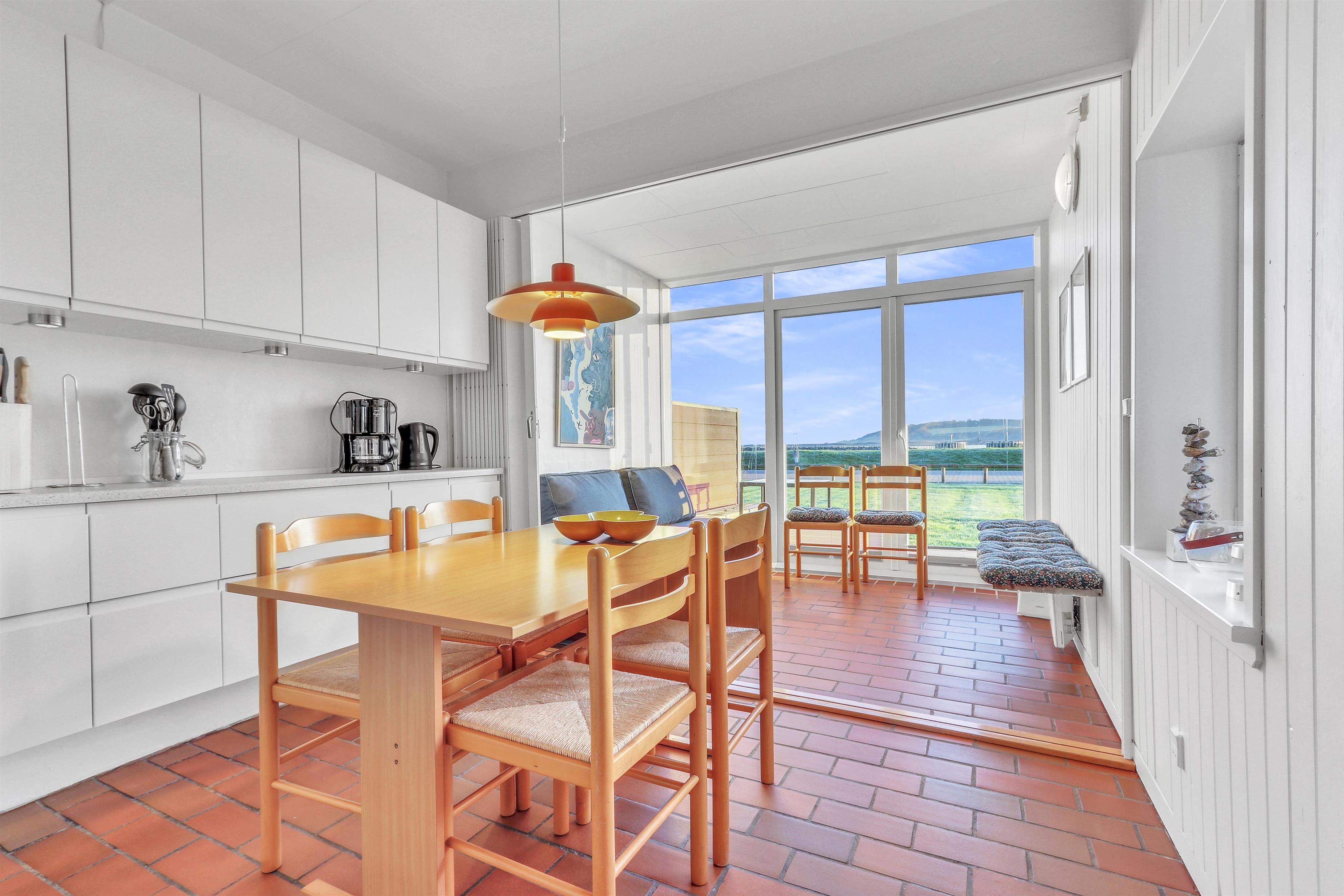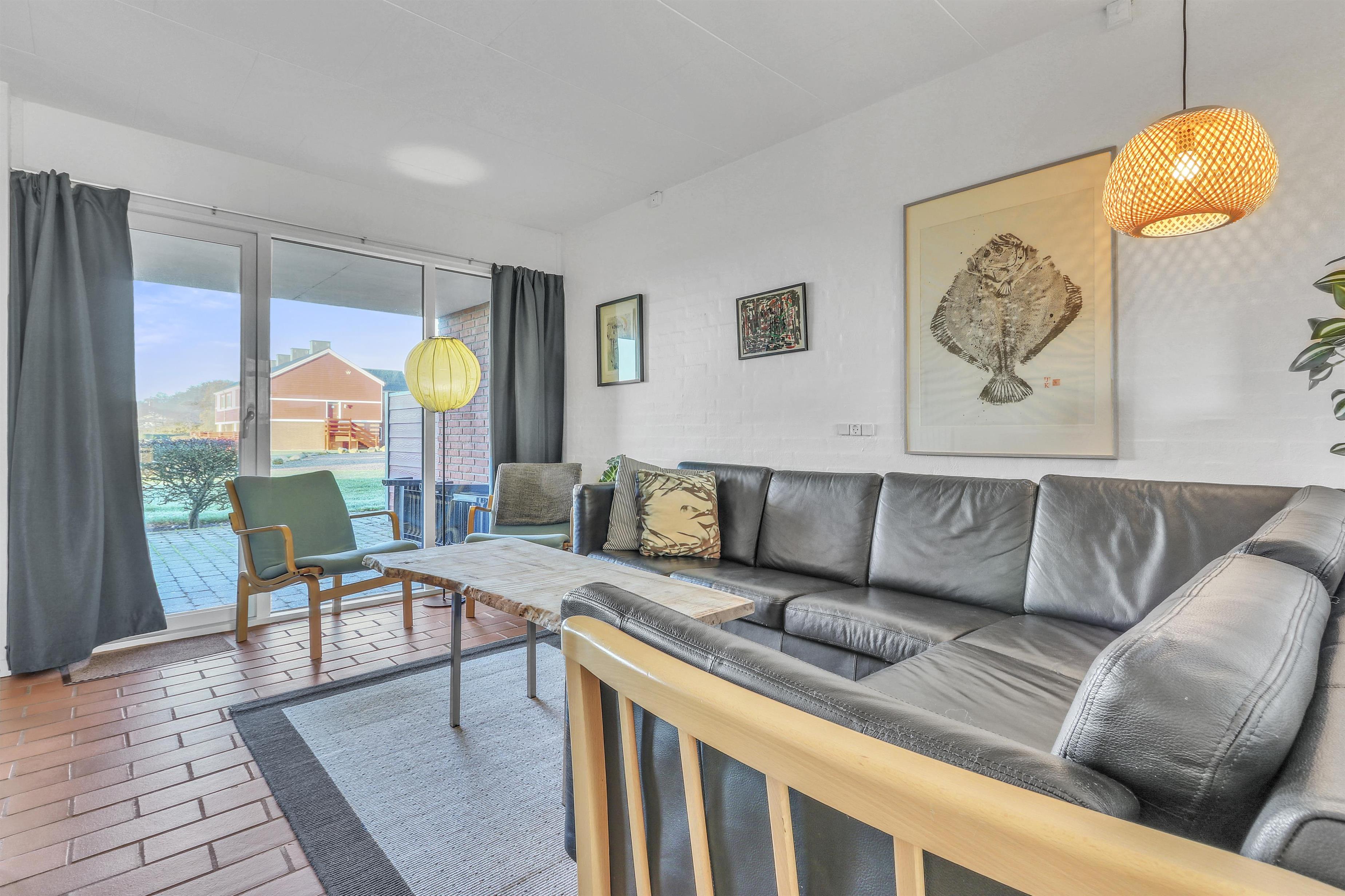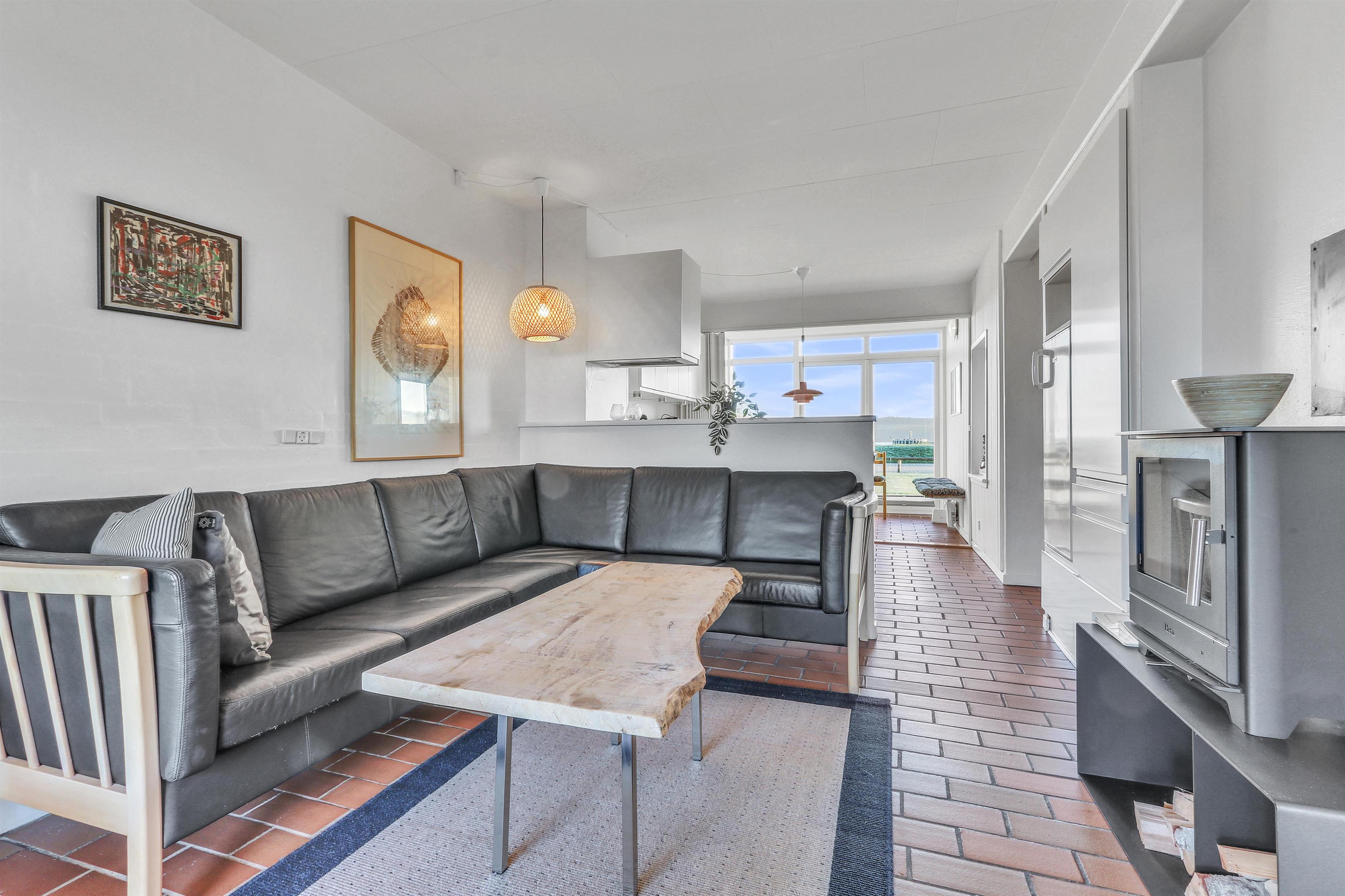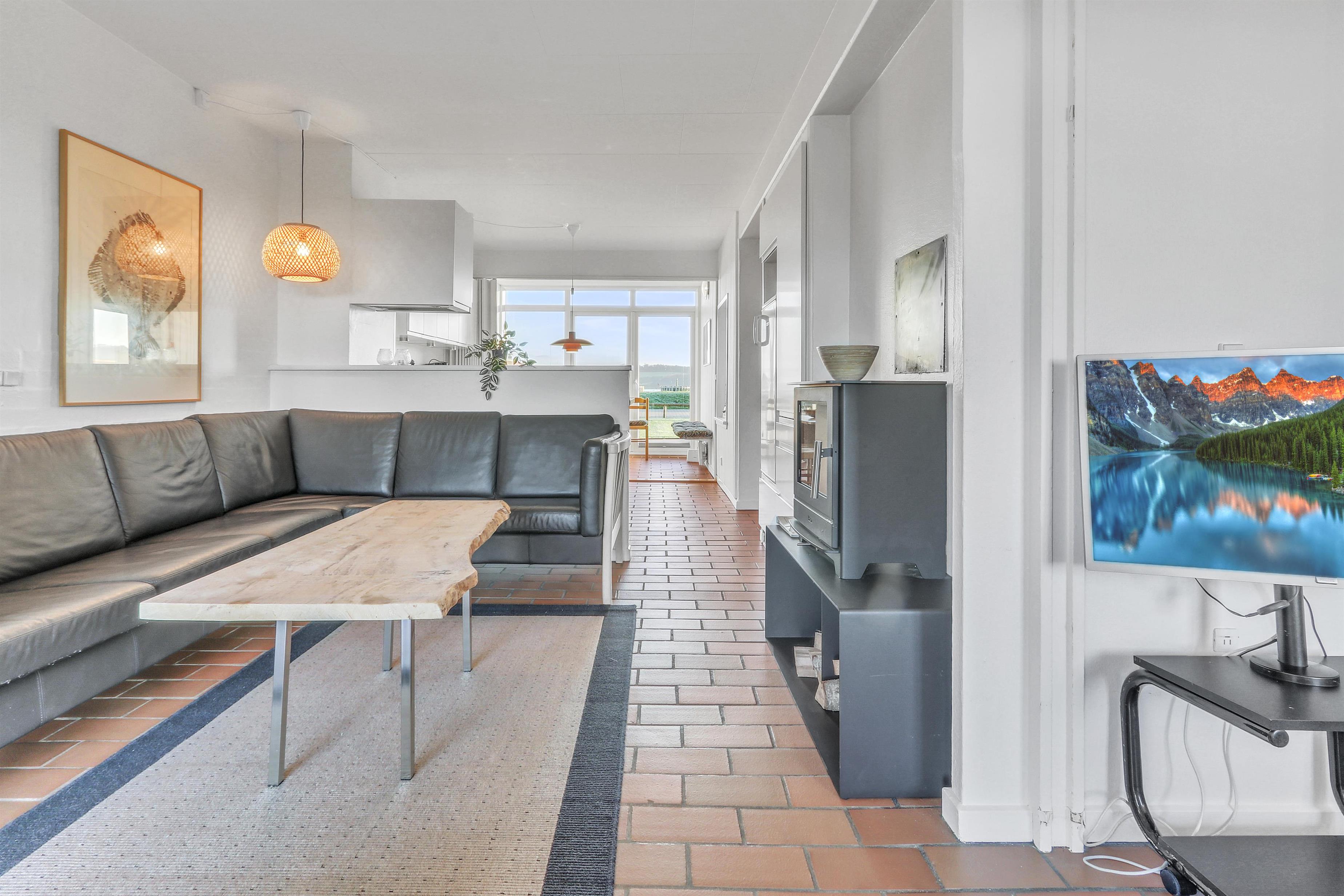 Hovedopholdsrummet er stuen og køkkenet som er ud i et. I køkkenet er der et elektrisk komfur, køle-fryseskab, opvaskemaskine og mikrobølgeovn. Her kan man lave maden, mens de andre beboere hygger i den store sofagruppe foran brændeovnen. Der er ligeledes et fjernsyn med DR og TV2 samt tysk EUROSPORT og RTL. Fra stuen og køkkenet er der adgang til de 2 soveværelser via skydedøre. Hovedsoveværelset har en dobbeltseng, mens det andet soveværelse har en sovesofa til to. Det andet soveværelse har dog den fordel at den har udgang til en østvendt terrasse ud mod Limfjorden og lystbådehavnen, så på gode morgener kan man sagtens nyde kaffen og solen på sengen samtidig så at sige. Badeværelset indeholder bruser, håndvask og toilet. Har man el-bil eller en Plug-In hybrid, så er der 4 Ladebokse til Type 2 ladestik, der kan lade op til 11 kWh ved Feriecenteret - de er lige efter miljøstationen.