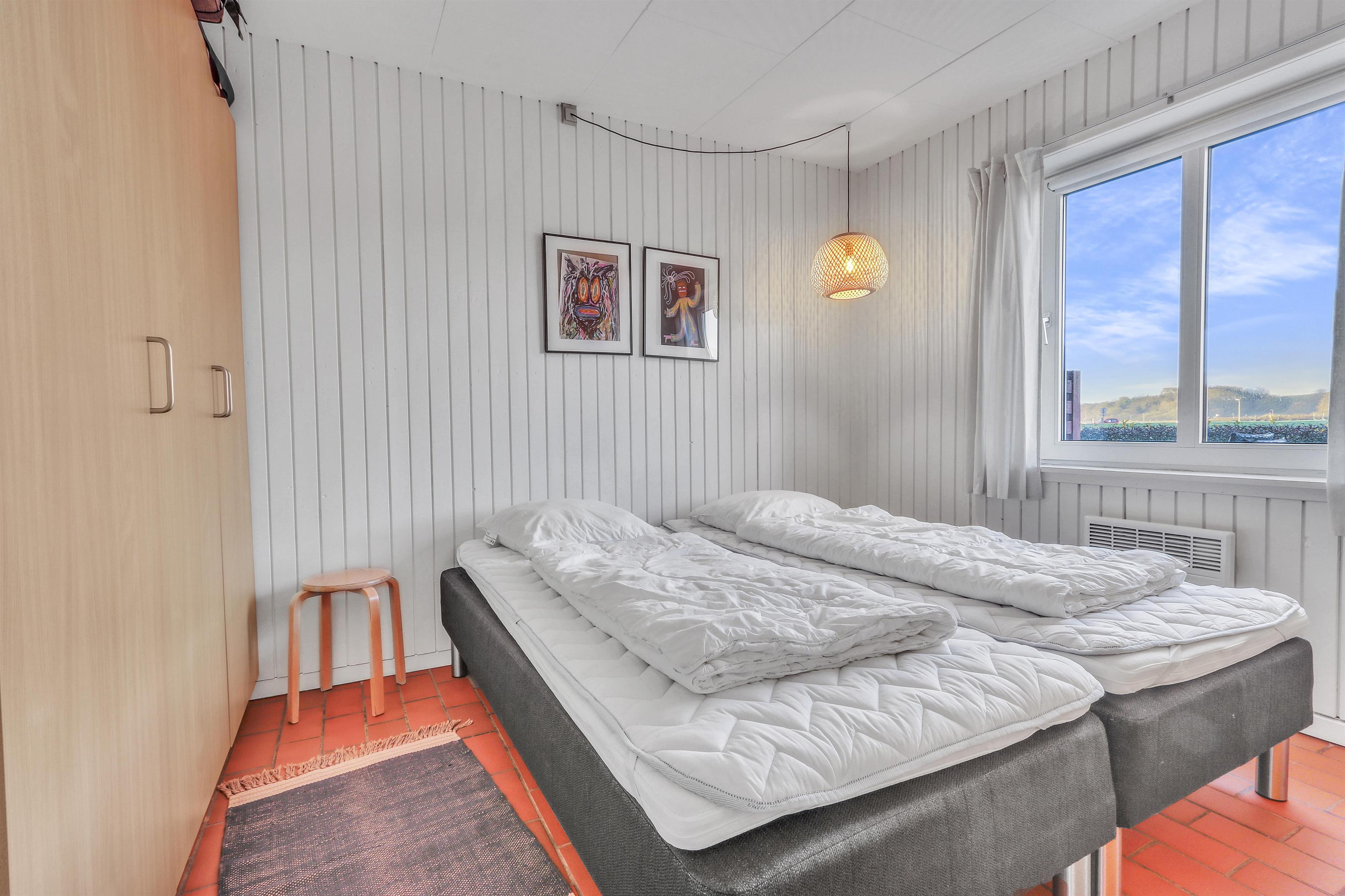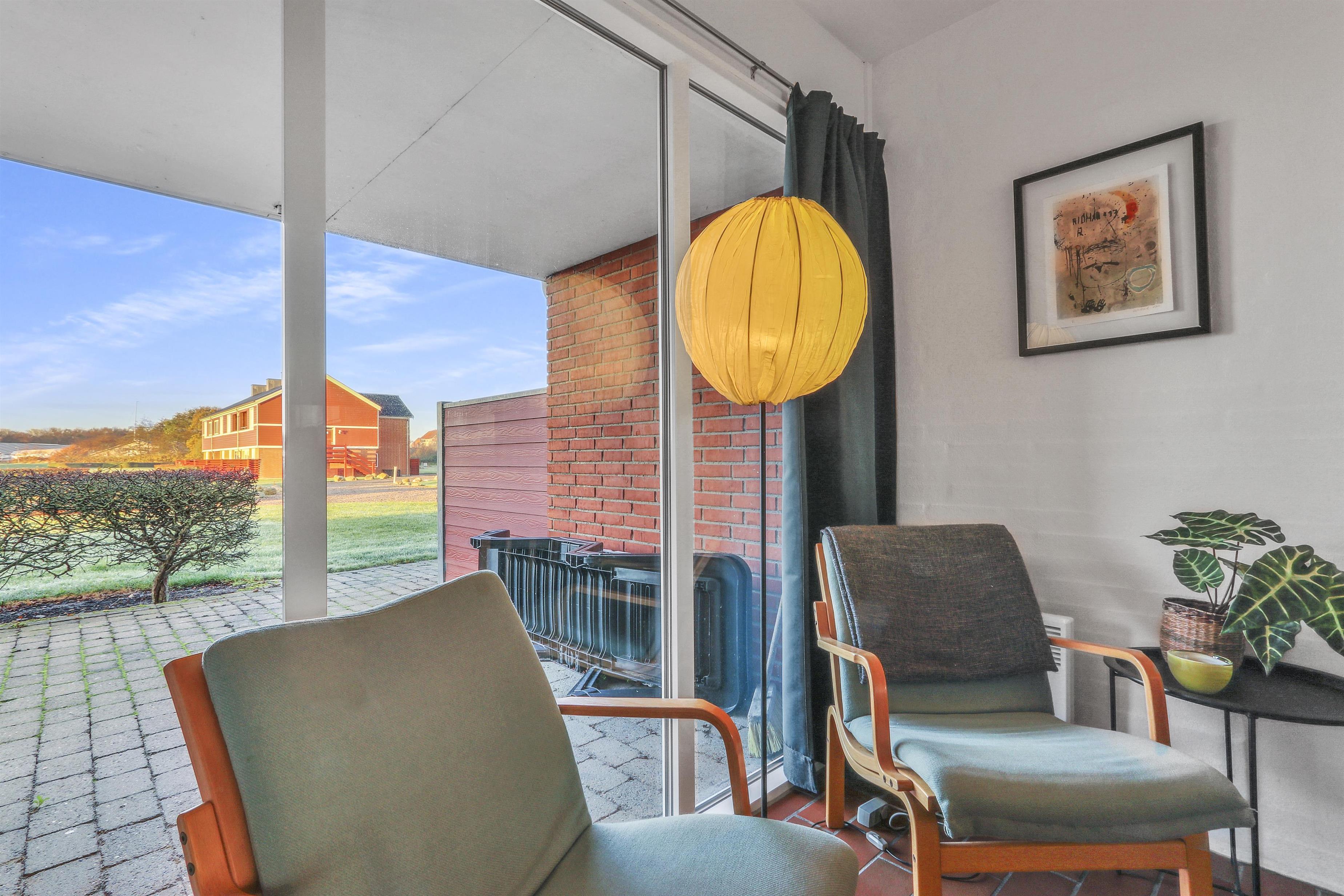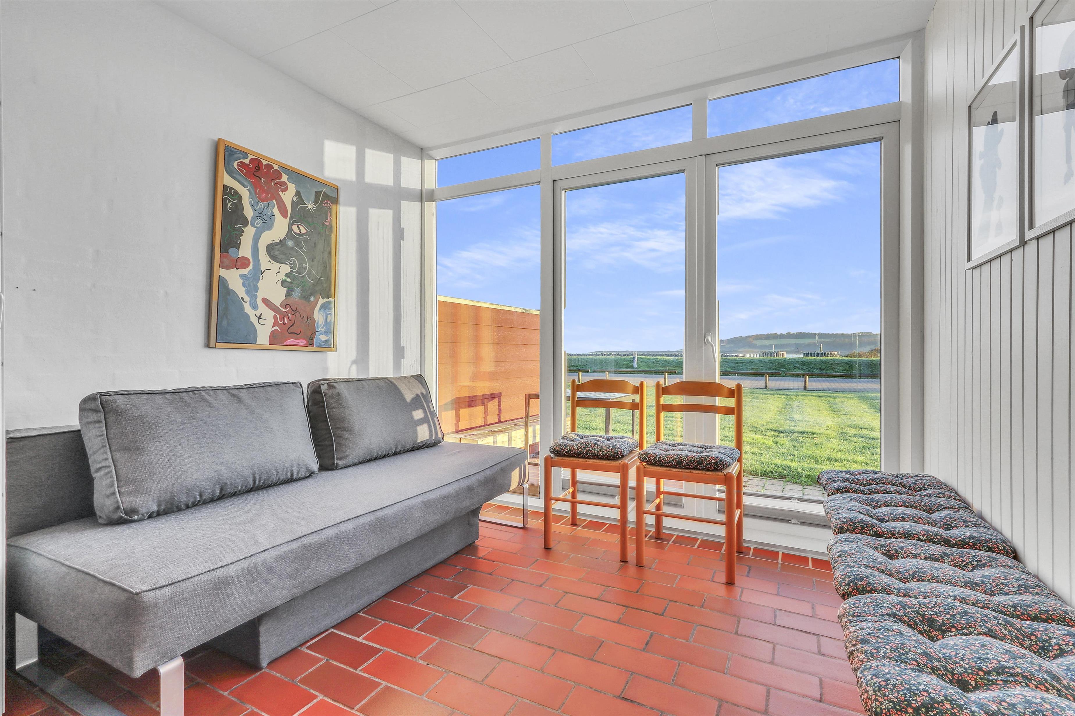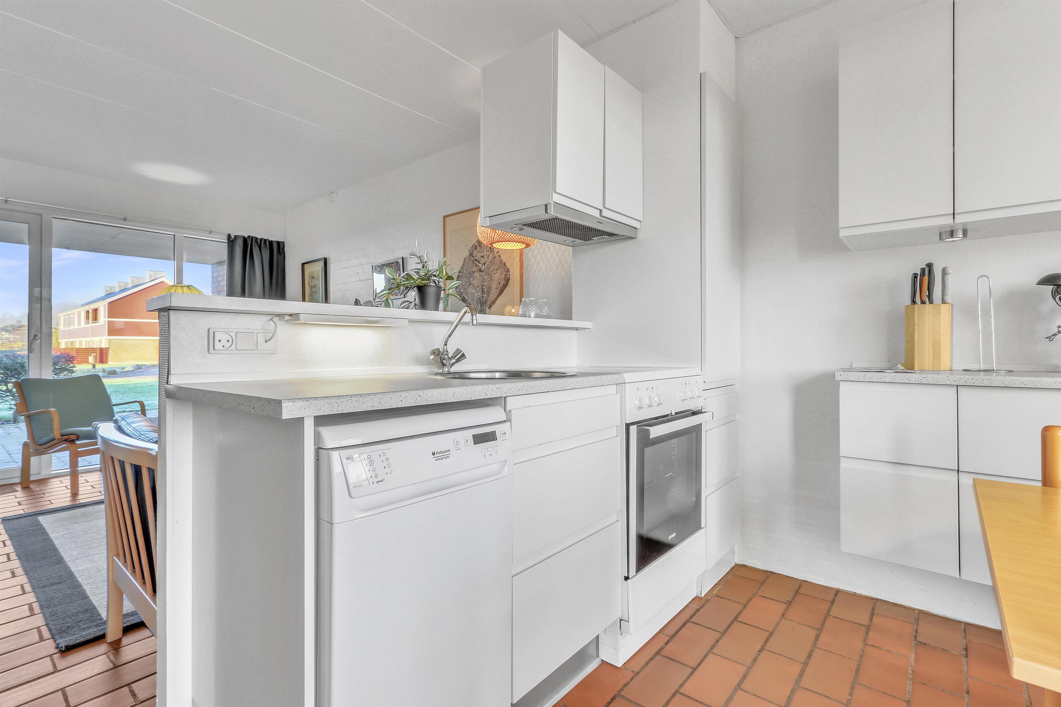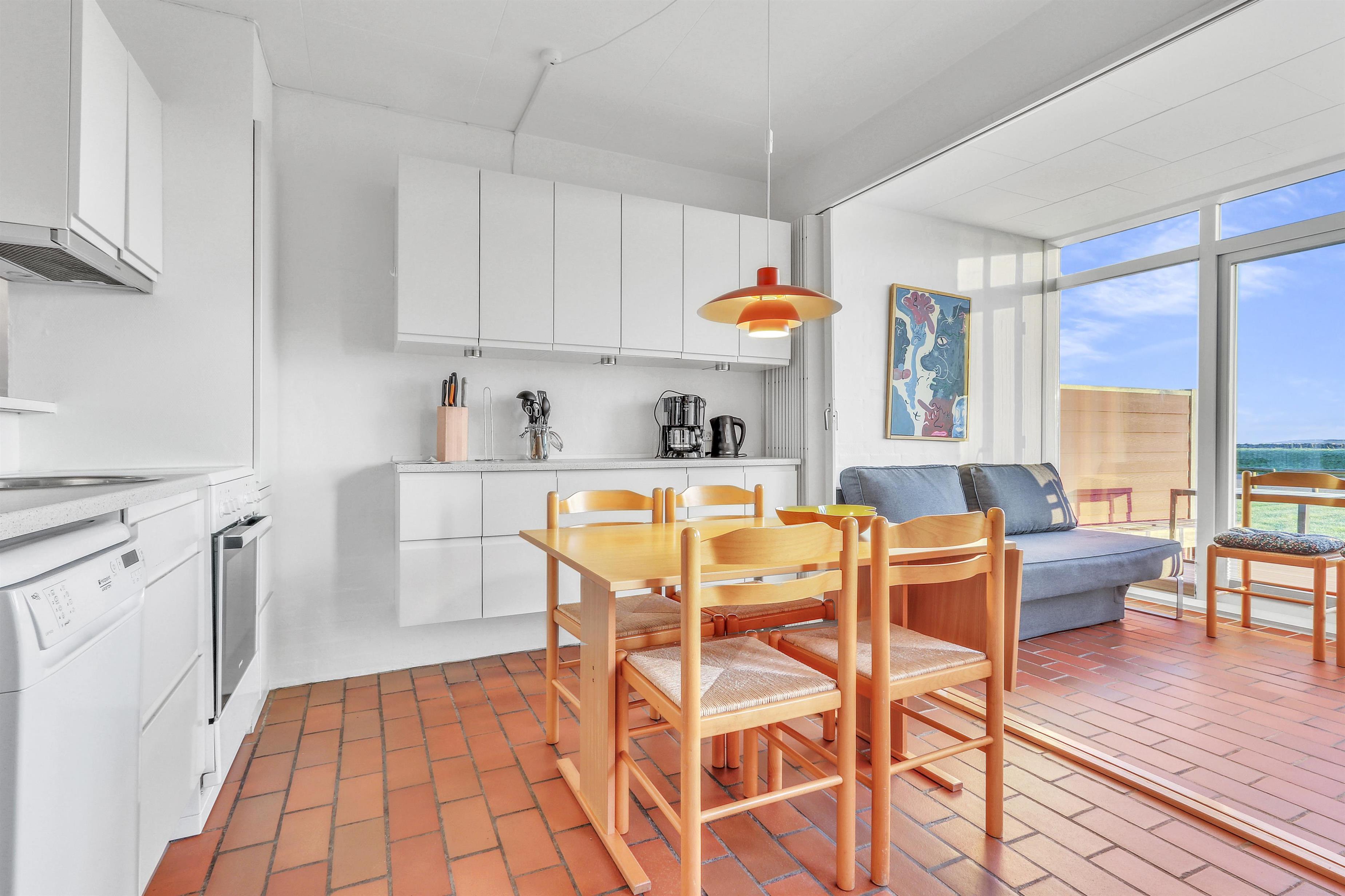 Hovedopholdsrummet er stuen og køkkenet som er ud i et. I køkkenet er der et elektrisk komfur, køle-fryseskab, opvaskemaskine og mikrobølgeovn. Her kan man lave maden, mens de andre beboere hygger i den store sofagruppe foran brændeovnen. Der er ligeledes et fjernsyn med DR og TV2 samt tysk EUROSPORT og RTL. Fra stuen og køkkenet er der adgang til de 2 soveværelser via skydedøre. Hovedsoveværelset har en dobbeltseng, mens det andet soveværelse har en sovesofa til to. Det andet soveværelse har dog den fordel at den har udgang til en østvendt terrasse ud mod Limfjorden og lystbådehavnen, så på gode morgener kan man sagtens nyde kaffen og solen på sengen samtidig så at sige. Badeværelset indeholder bruser, håndvask og toilet. Har man el-bil eller en Plug-In hybrid, så er der 4 Ladebokse til Type 2 ladestik, der kan lade op til 11 kWh ved Feriecenteret - de er lige efter miljøstationen.