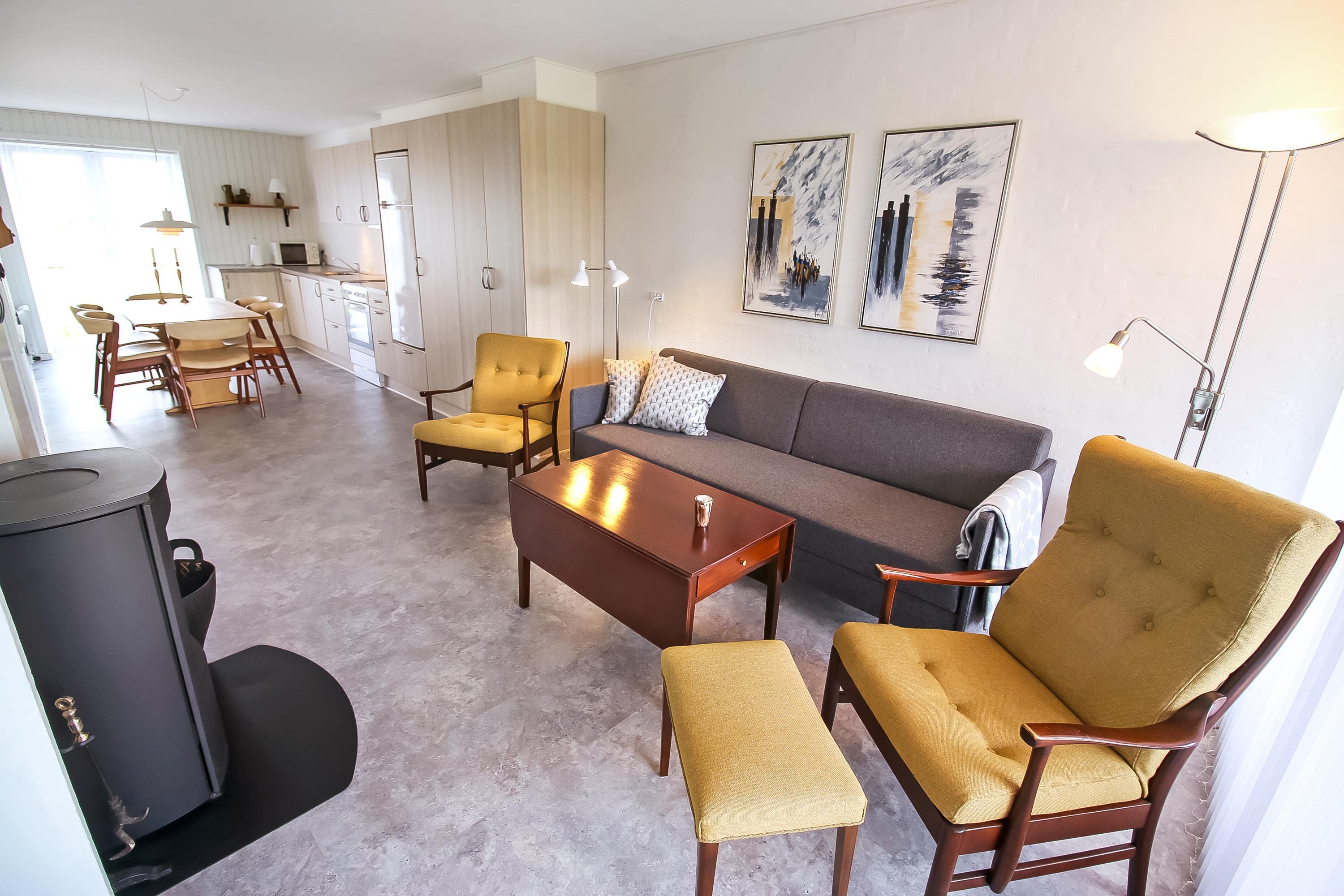 Køkkenet er udstyret med glaskeramisk komfur, et køleskab med separat fryser på liter. Herudover er der en opvaskemaskine samt mikrobølgeovn. Stuen er indrettet med sofa, brændeovn, varmepumpe og har ydermere CD-afspiller og kabel-TV med DR, TV2, tysk EUROSPORT1 og RTL.