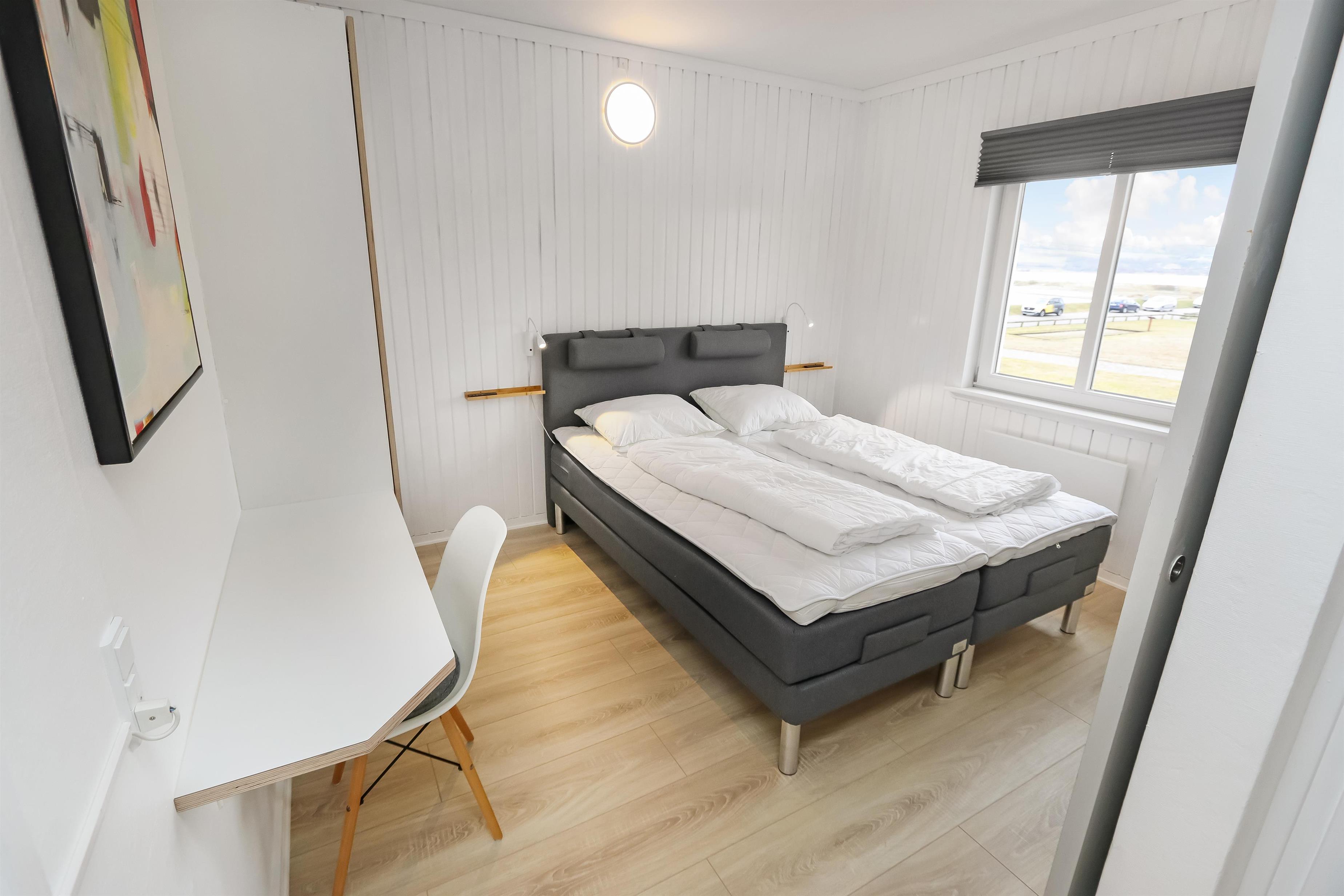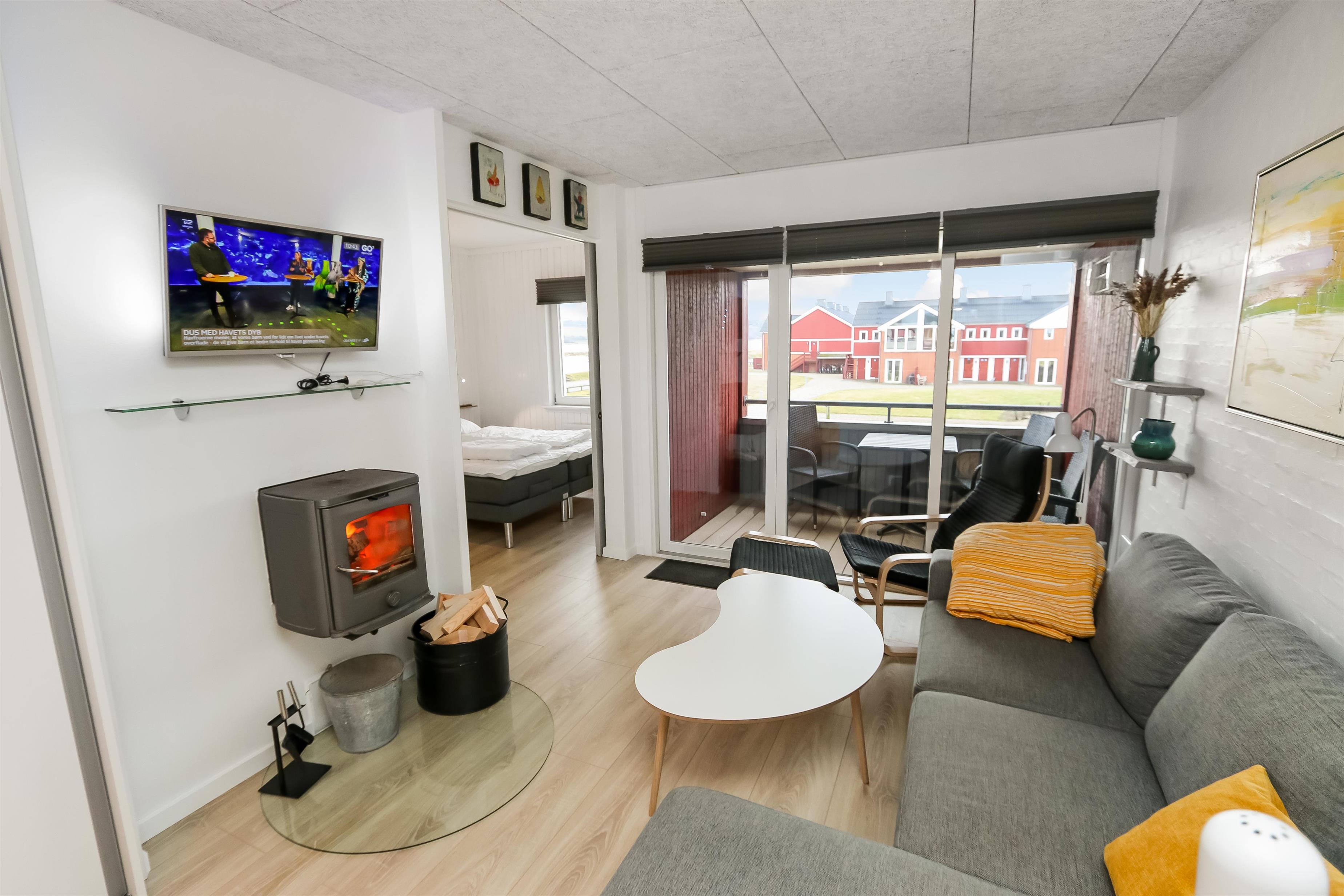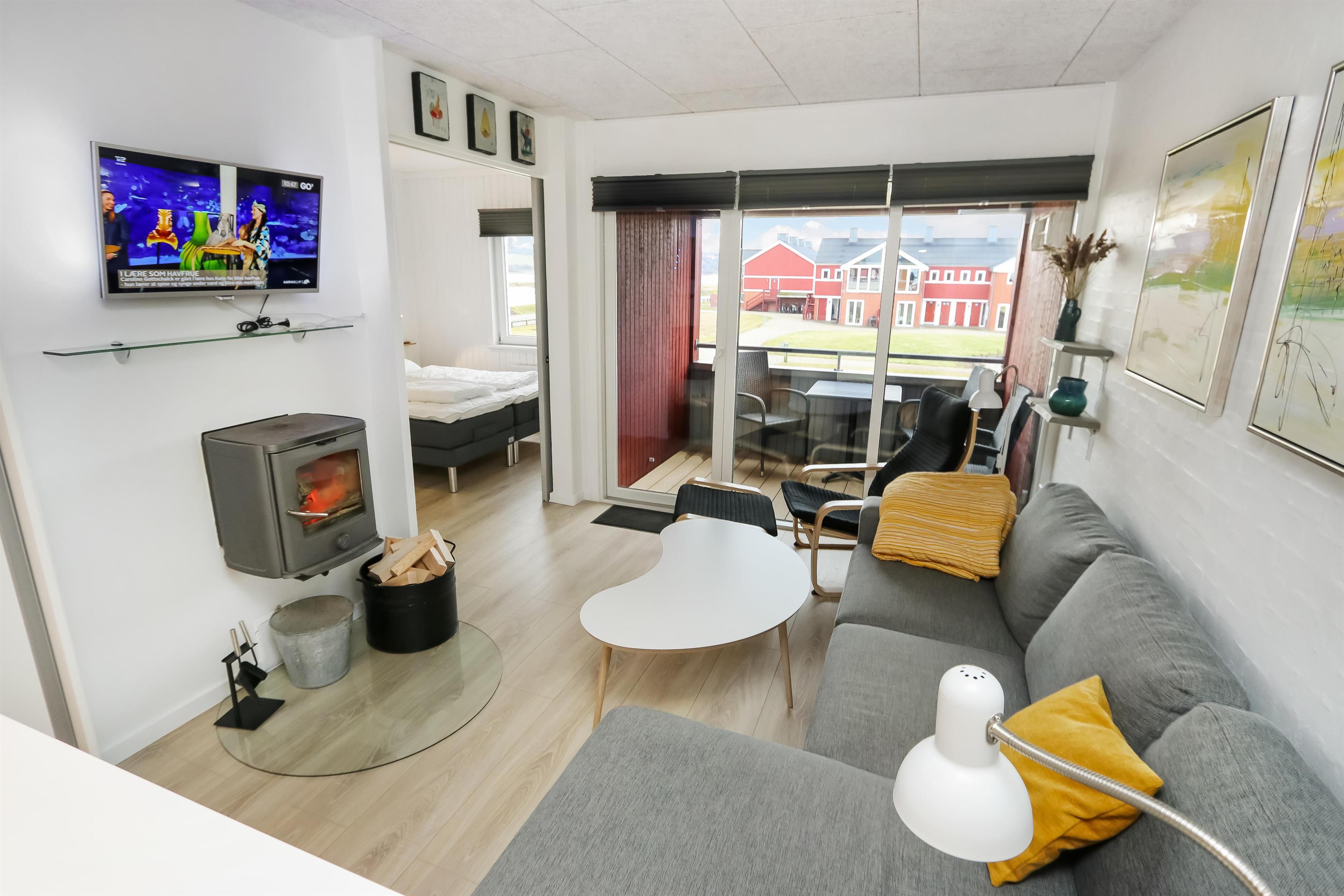 Lejligheden har egen privat indgang. Køkkenet har glaskeramisk komfur, køle/fryseskab med separat fryser på 10 liter. Hertil er der også et spisebord. Stuen byder også på komfort med hyggelige møbler og sofabord, varmepumpe samt brændeovn. Fra stuen er der udgang til den sydvendte balkon. Herudover er der fladskærm med DR, TV2, tysk EUROSPORT1 og RTL. Der er to soveværelser med en dobbeltseng i hvert værelse. Badeværelset indeholder et brusebad, håndvask og toilet. Har man el-bil eller en Plug-In hybrid, så er der 4 Ladebokse til Type 2 ladestik, der kan lade op til 11 kWh ved Feriecenteret - de er lige efter miljøstationen.