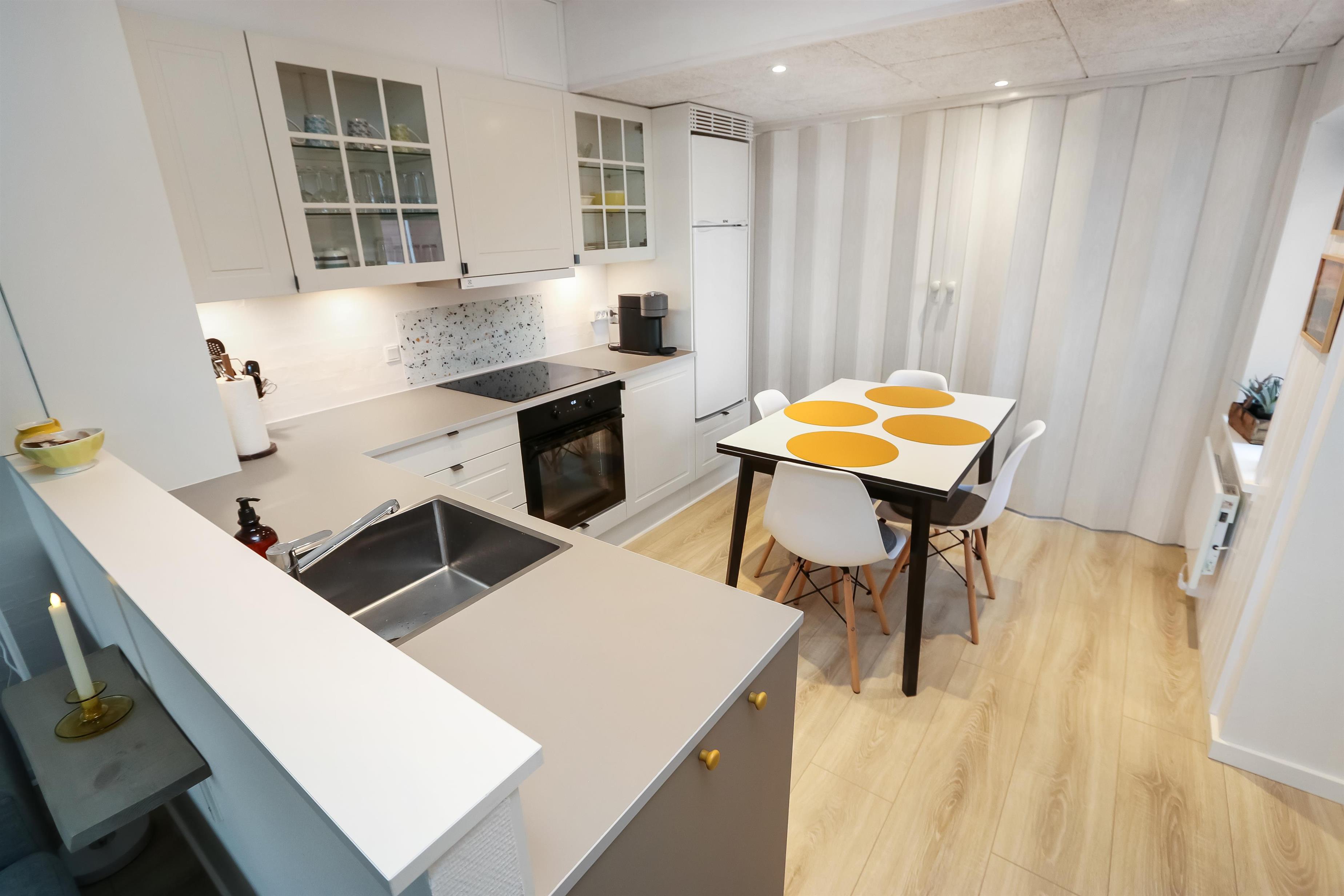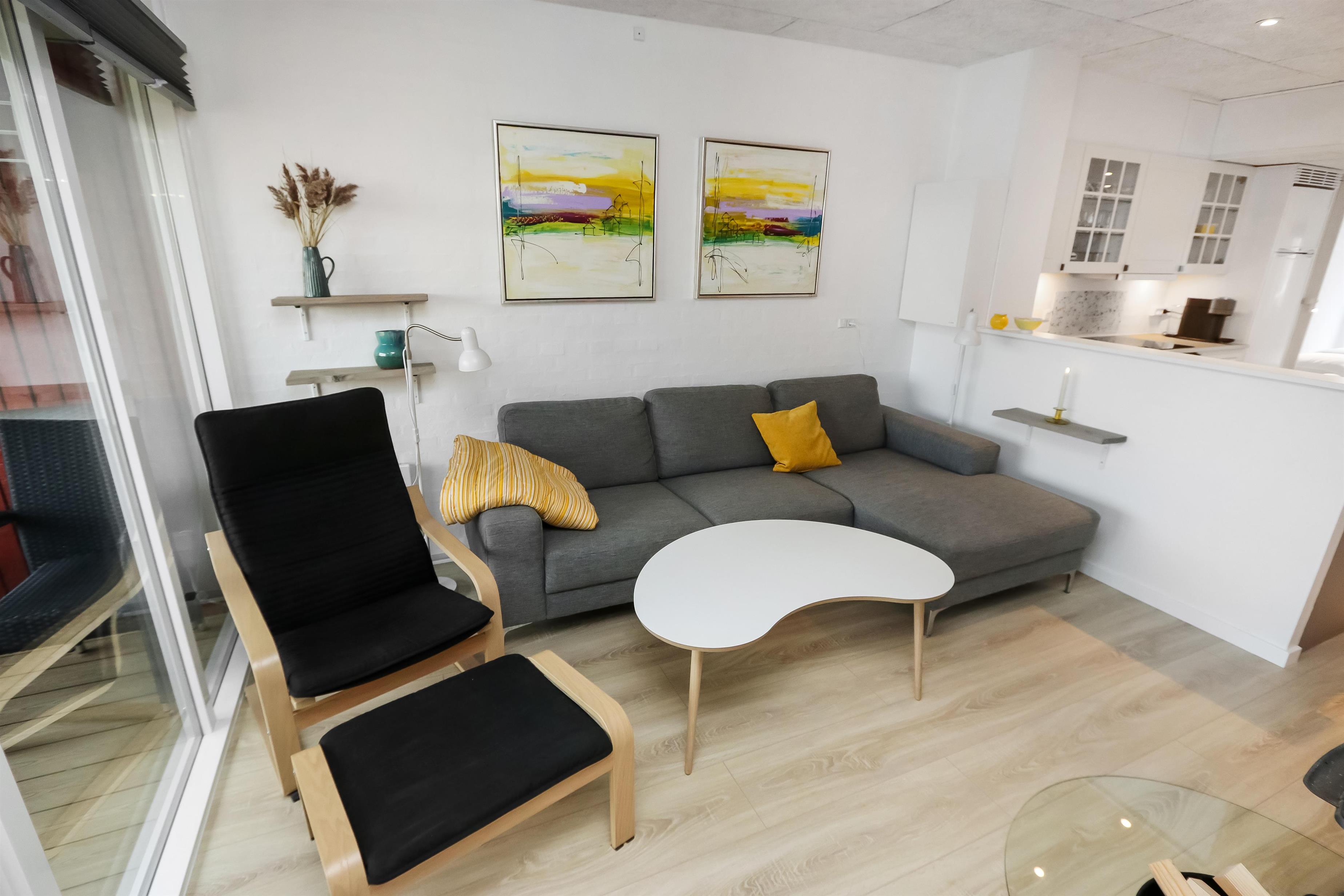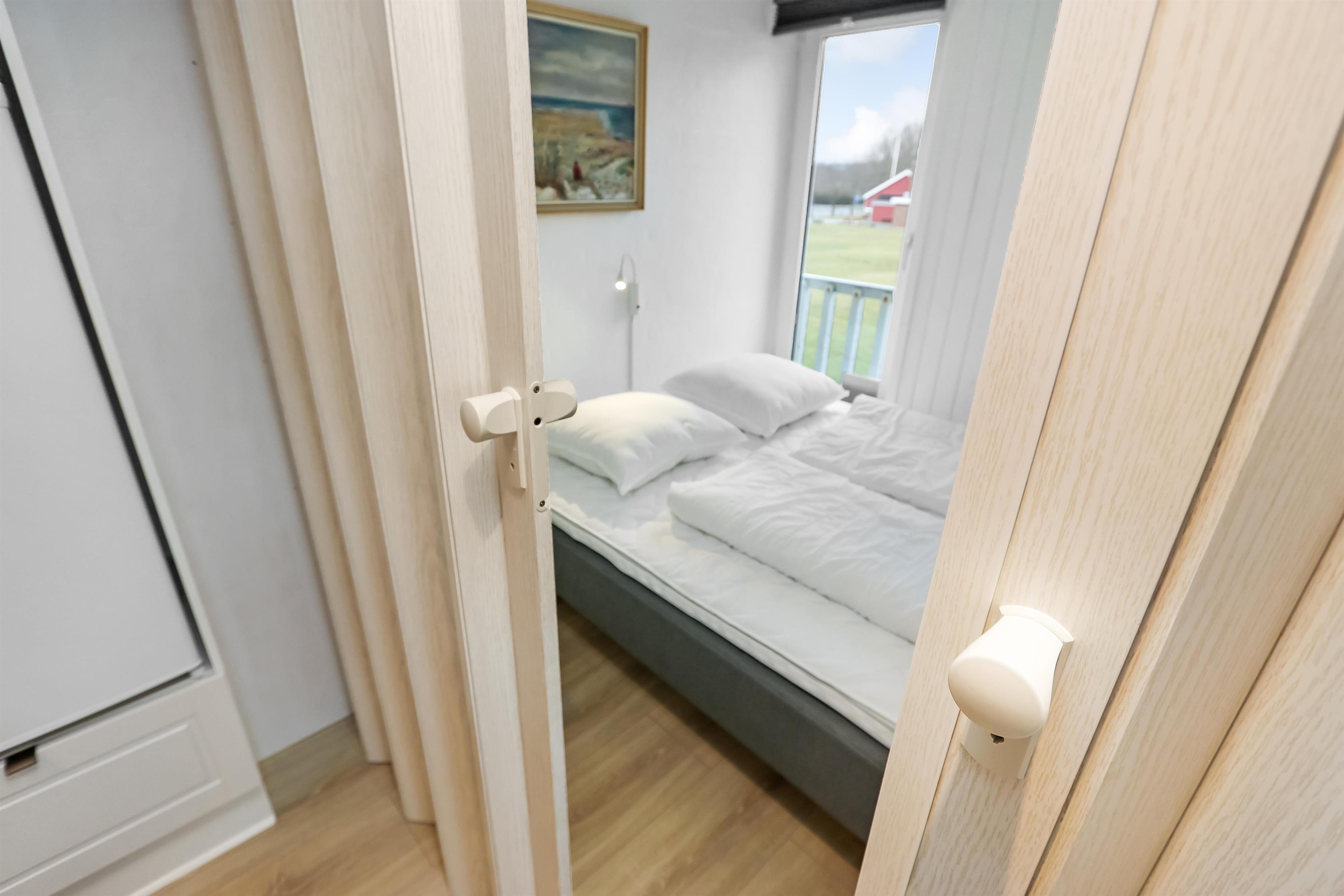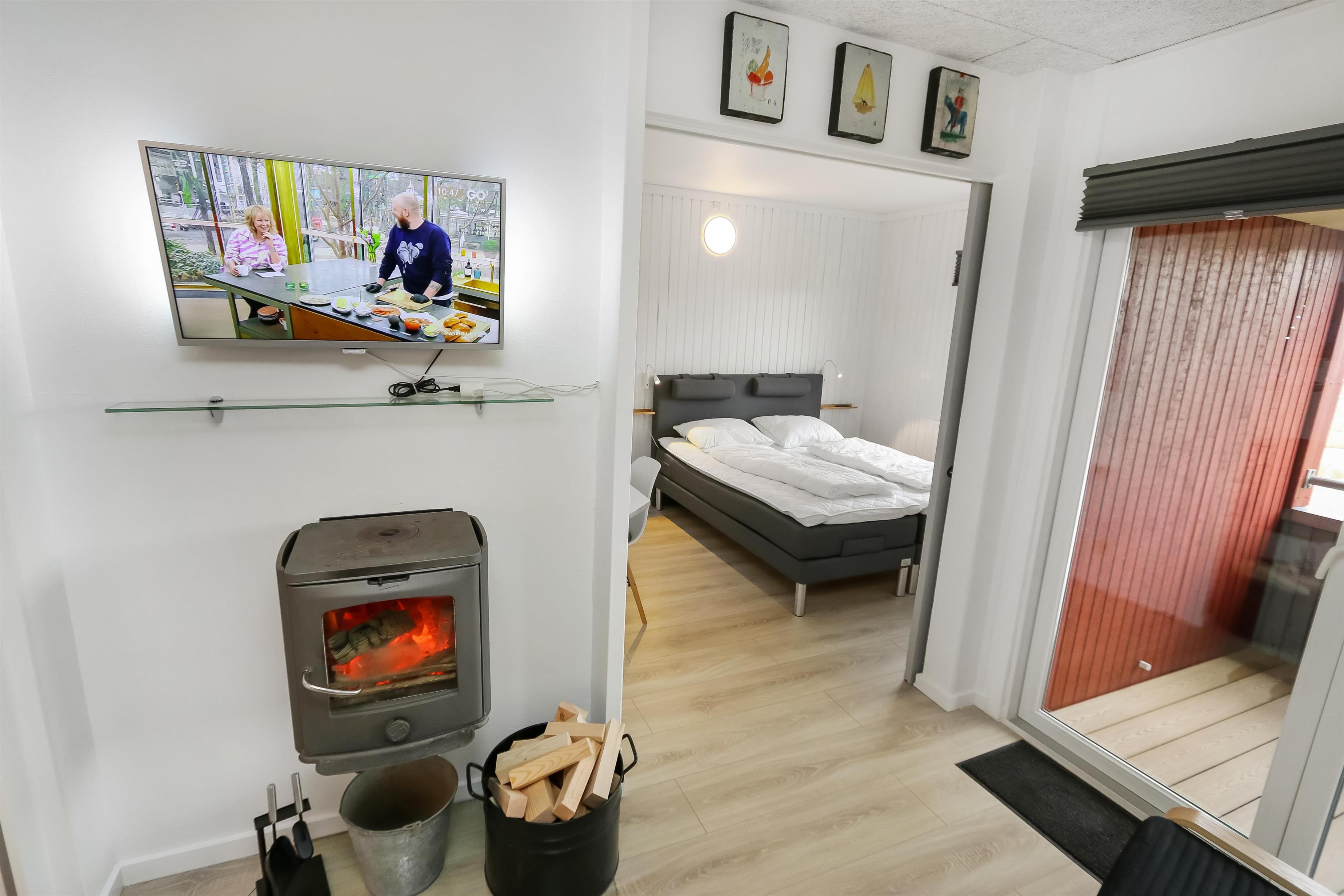 Lejligheden har egen privat indgang. Køkkenet har glaskeramisk komfur, køle/fryseskab med separat fryser på 10 liter. Hertil er der også et spisebord. Stuen byder også på komfort med hyggelige møbler og sofabord, varmepumpe samt brændeovn. Fra stuen er der udgang til den sydvendte balkon. Herudover er der fladskærm med DR, TV2, tysk EUROSPORT1 og RTL. Der er to soveværelser med en dobbeltseng i hvert værelse. Badeværelset indeholder et brusebad, håndvask og toilet. Har man el-bil eller en Plug-In hybrid, så er der 4 Ladebokse til Type 2 ladestik, der kan lade op til 11 kWh ved Feriecenteret - de er lige efter miljøstationen.