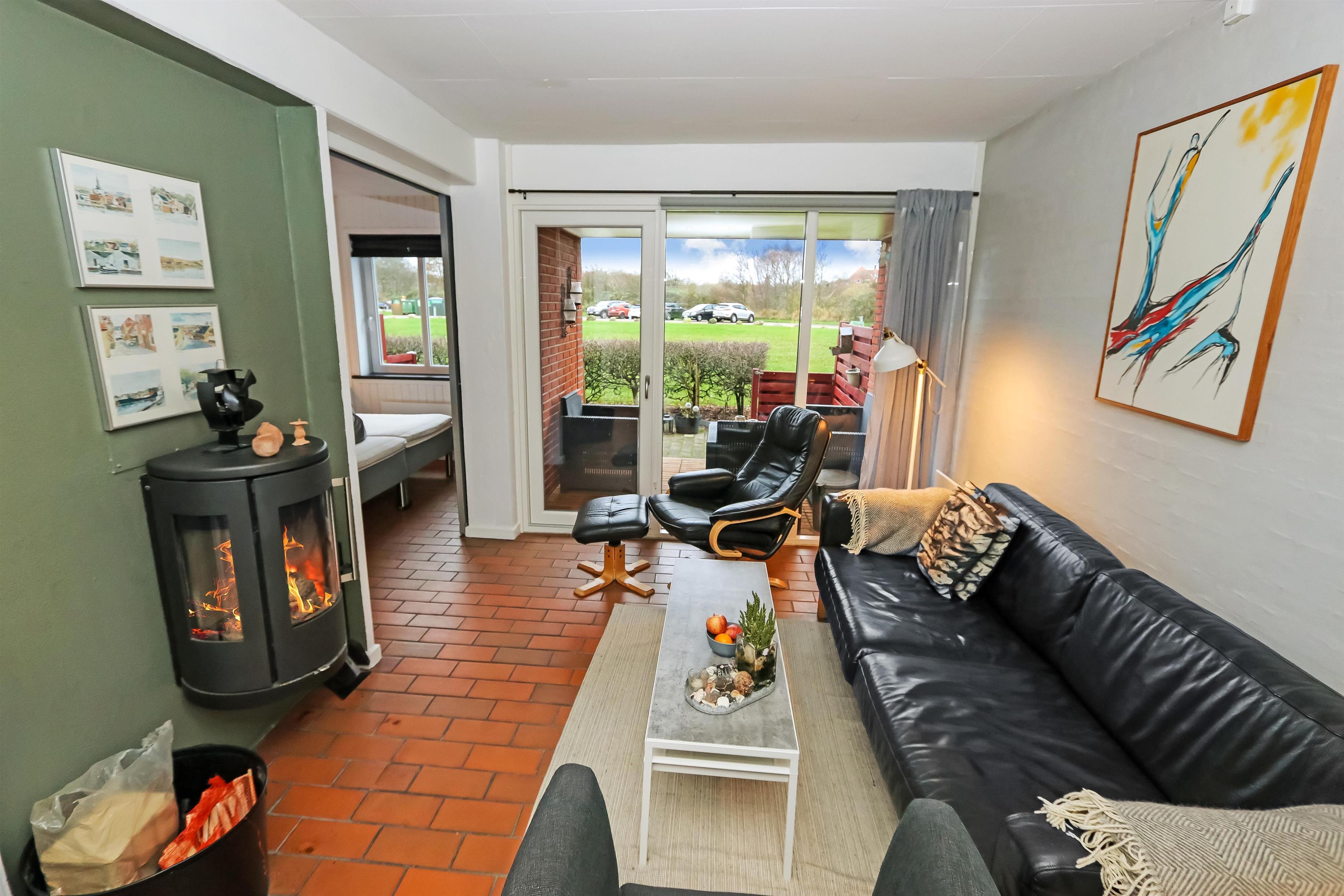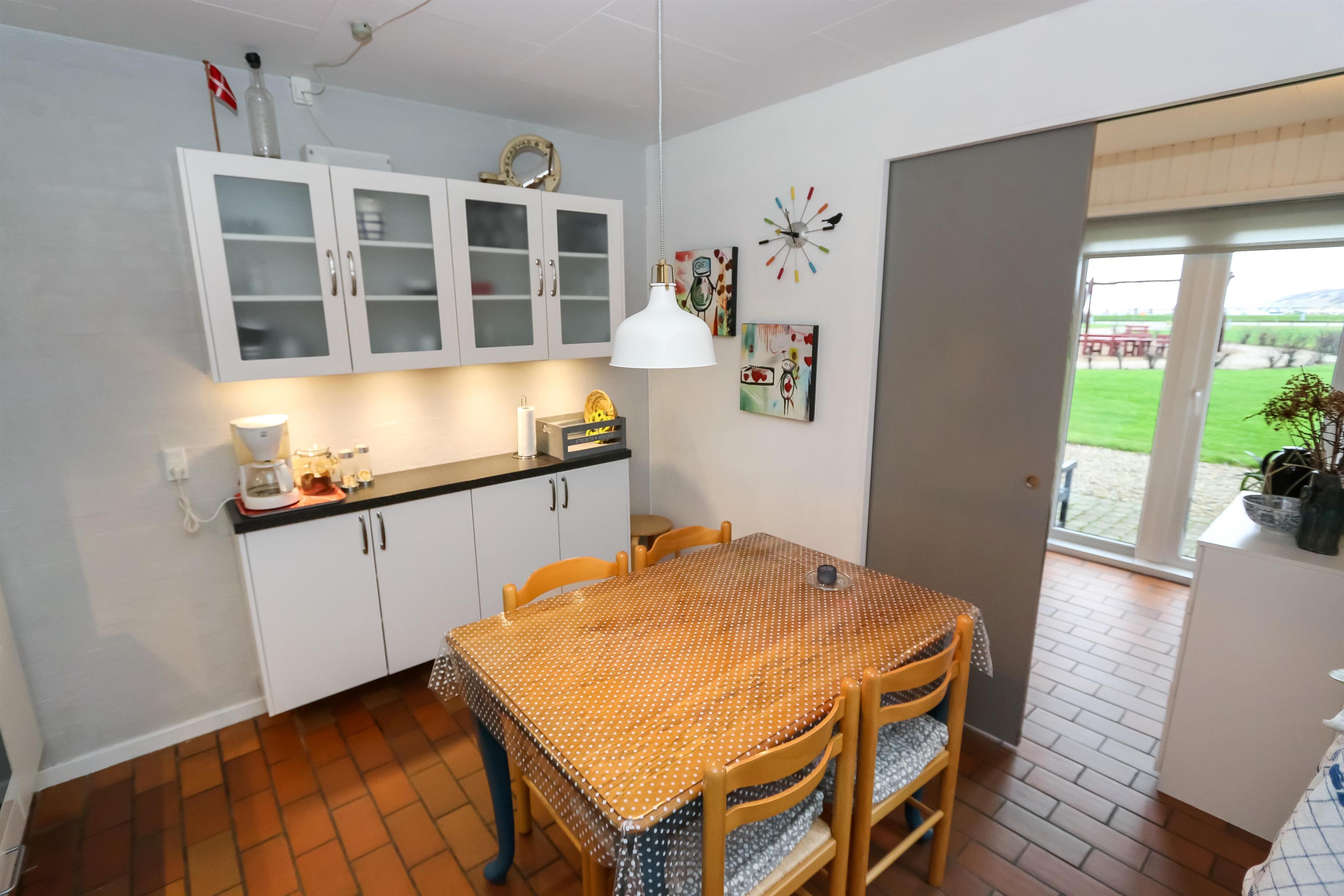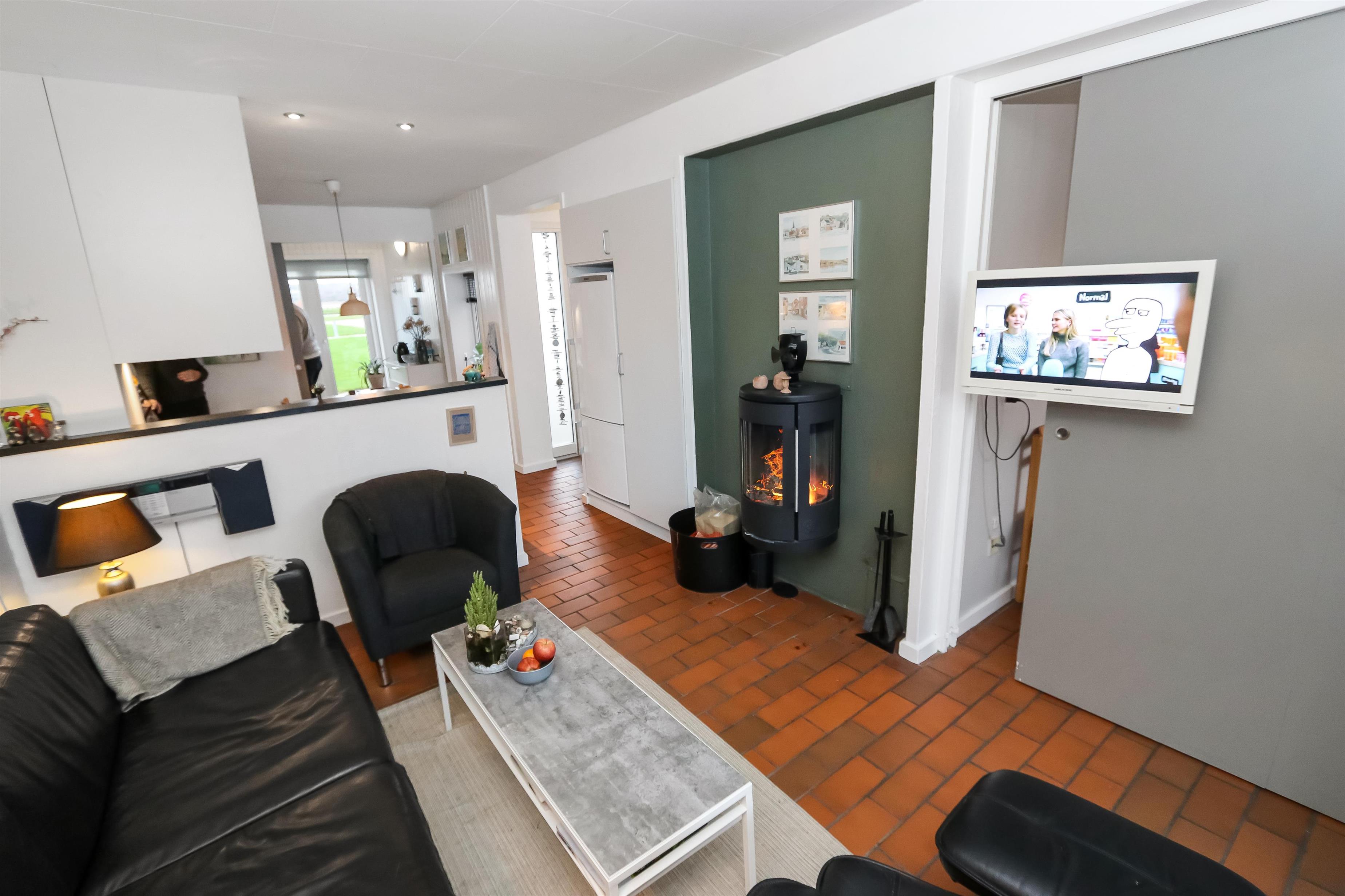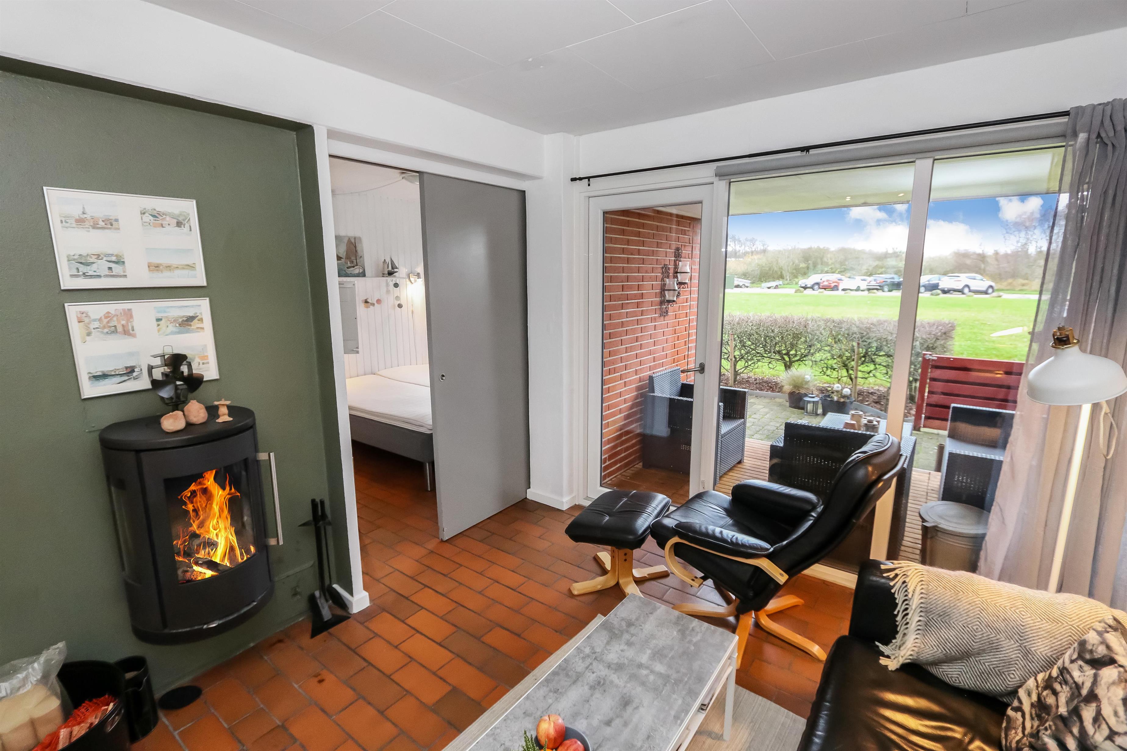 Køkkenet har glaskeramisk komfur, køleskab og en separat fryser på 40 liter.I stuen er der en stor sofagruppe med sofabord, brændeovn, samt kabel-tv med DR, TV2 tysk EUROSPORT1 og RTL, der er desuden Chromecast med mulighed for at streame egne programmer. Radioer ligeledes også inkluderet i stuen. Der er to soveværelser som er hver med en dobbeltseng. Fra det ene soveværelse er der udgang til een af husets 2 terrasser. Her kan man betragte morgensolen, mens man nyder lyden af Limfjorden. Badeværelset har en bruser, håndvask og toilet. Har man el-bil eller en Plug-In hybrid, så er der 4 Ladebokse til Type 2 ladestik, der kan lade op til 11 kWh ved Feriecenteret - de er lige efter miljøstationen.