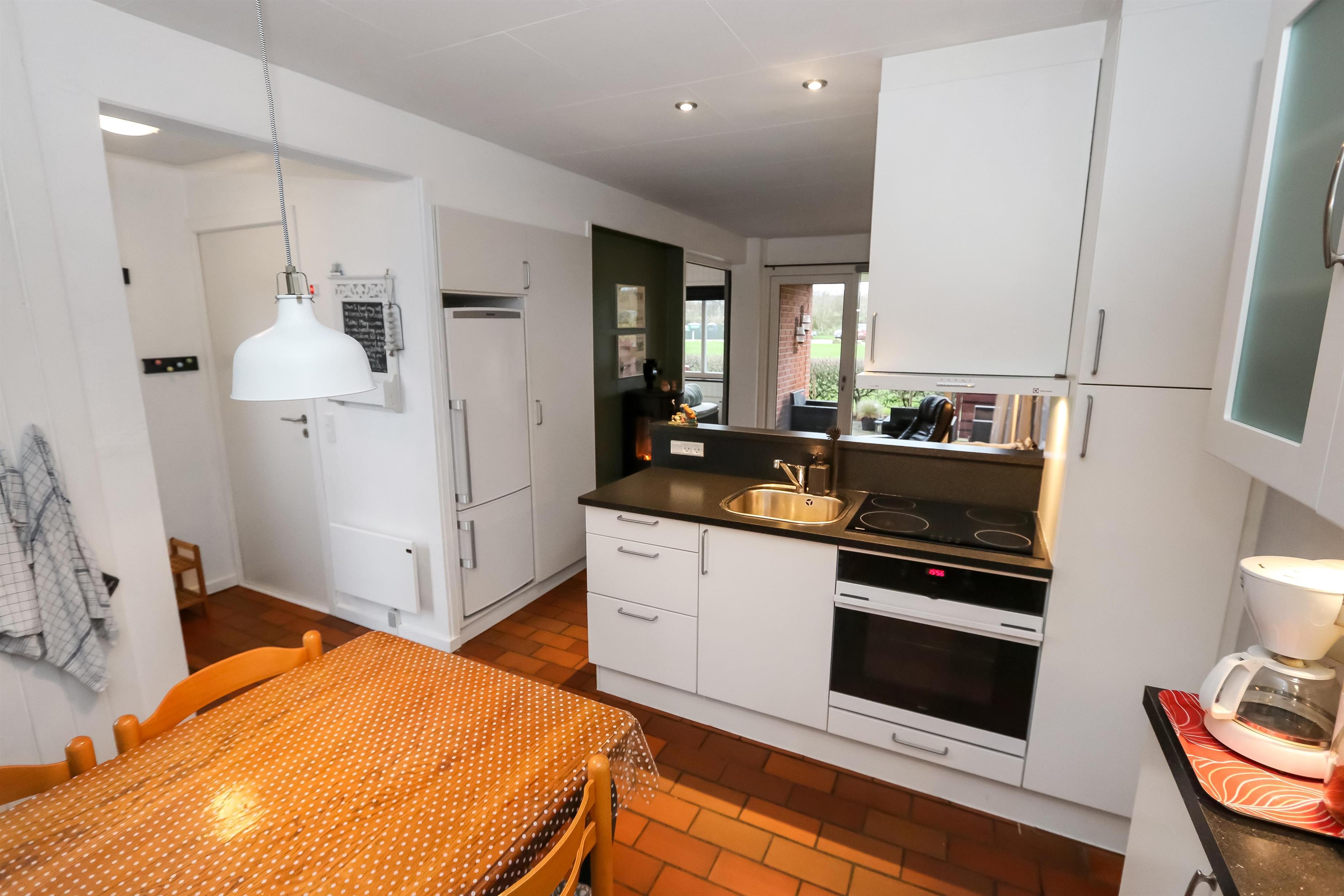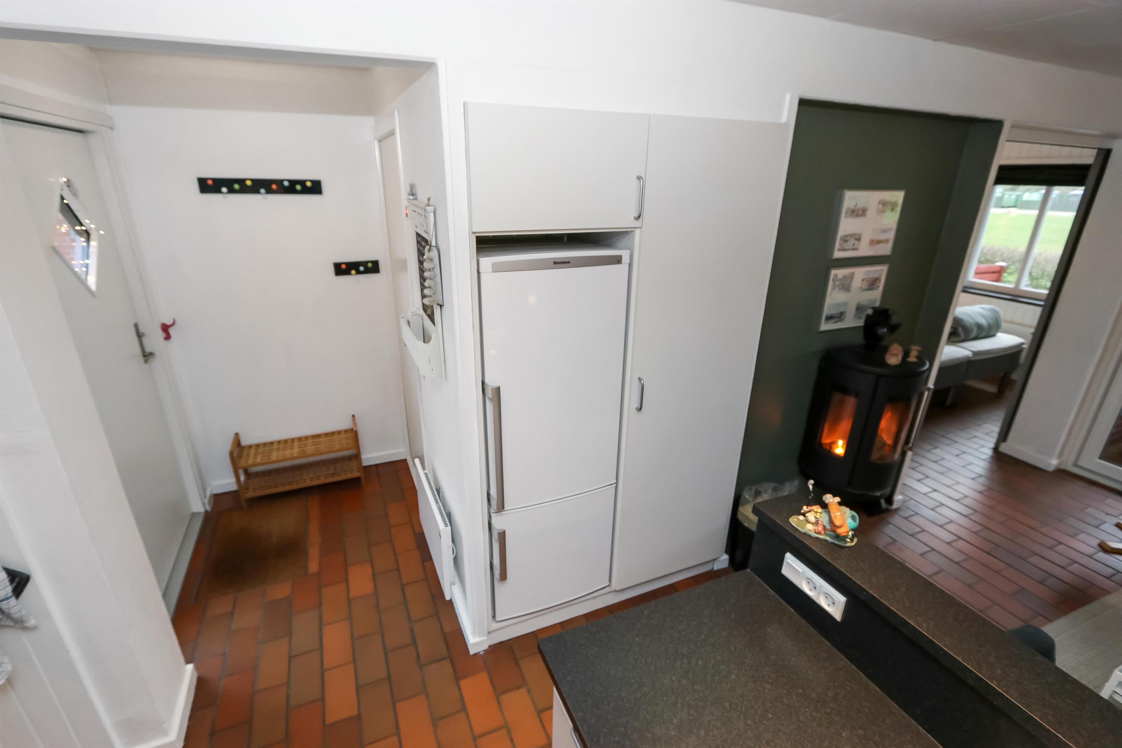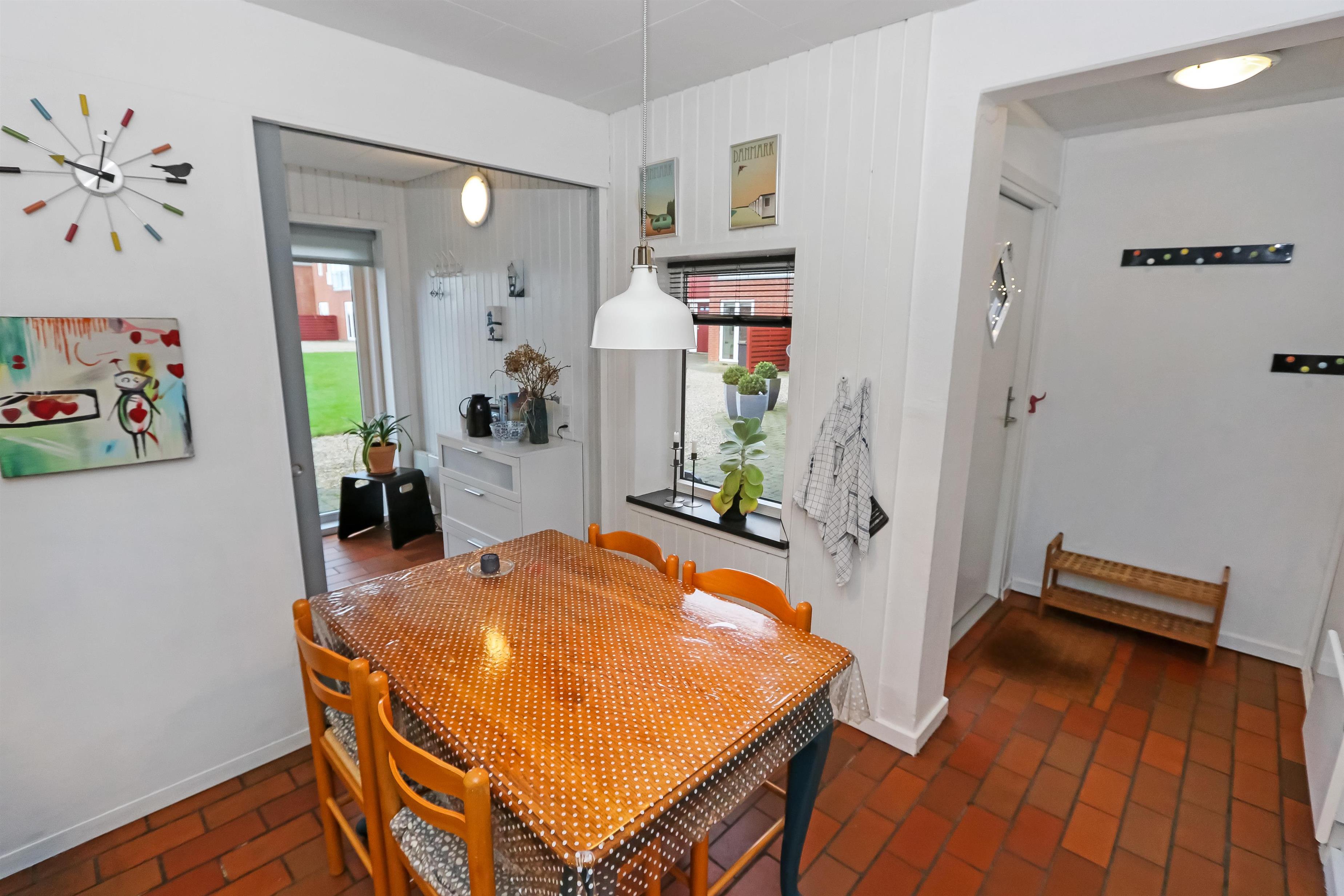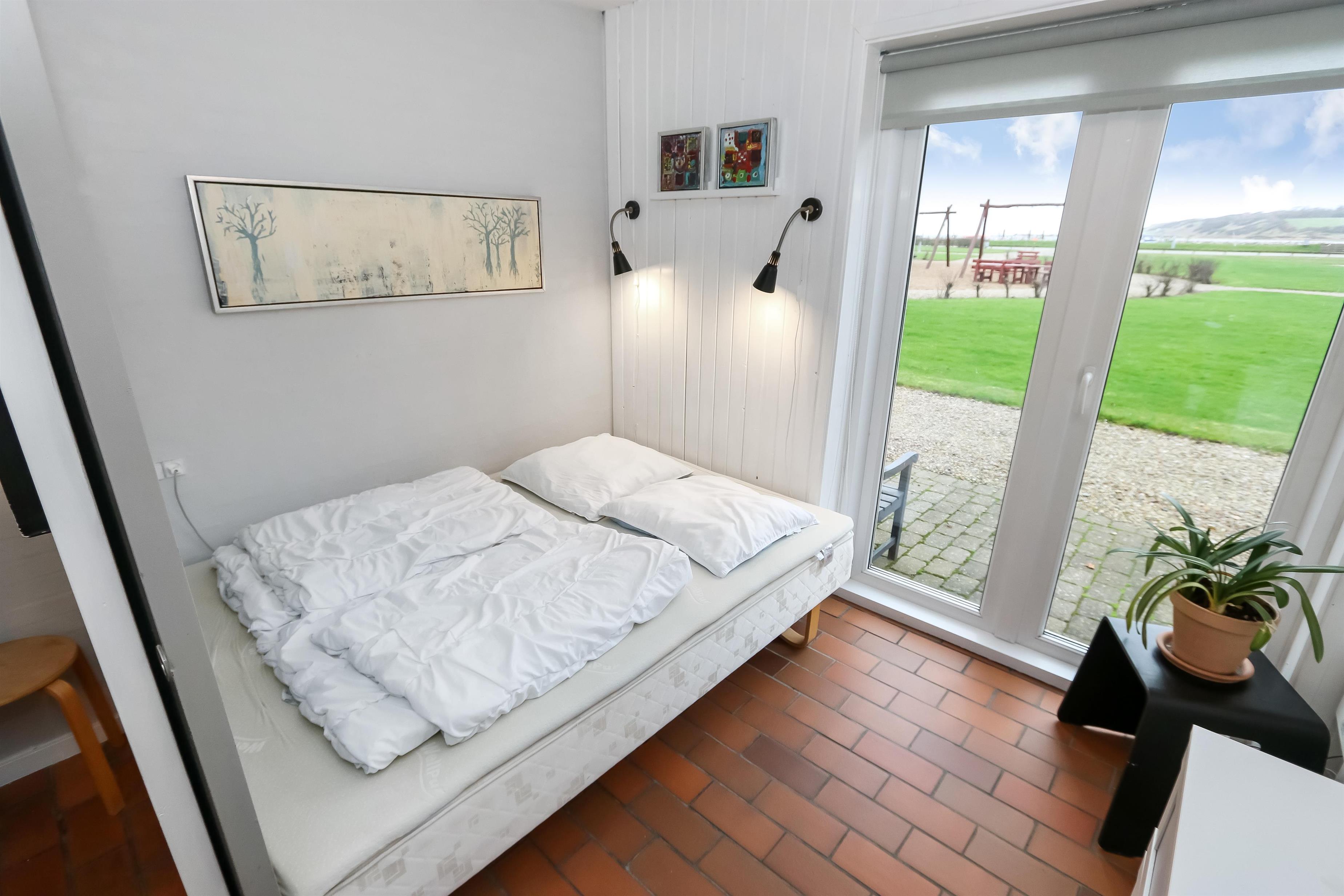 Køkkenet har glaskeramisk komfur, køleskab og en separat fryser på 40 liter.I stuen er der en stor sofagruppe med sofabord, brændeovn, samt kabel-tv med DR, TV2 tysk EUROSPORT1 og RTL, der er desuden Chromecast med mulighed for at streame egne programmer. Radioer ligeledes også inkluderet i stuen. Der er to soveværelser som er hver med en dobbeltseng. Fra det ene soveværelse er der udgang til een af husets 2 terrasser. Her kan man betragte morgensolen, mens man nyder lyden af Limfjorden. Badeværelset har en bruser, håndvask og toilet. Har man el-bil eller en Plug-In hybrid, så er der 4 Ladebokse til Type 2 ladestik, der kan lade op til 11 kWh ved Feriecenteret - de er lige efter miljøstationen.