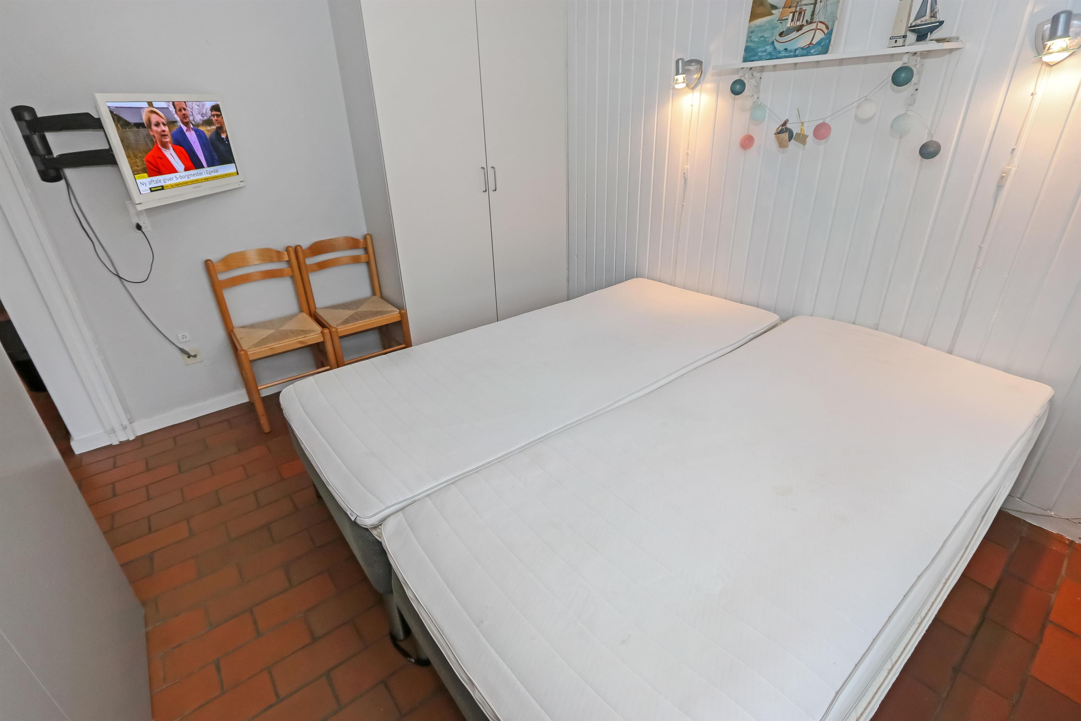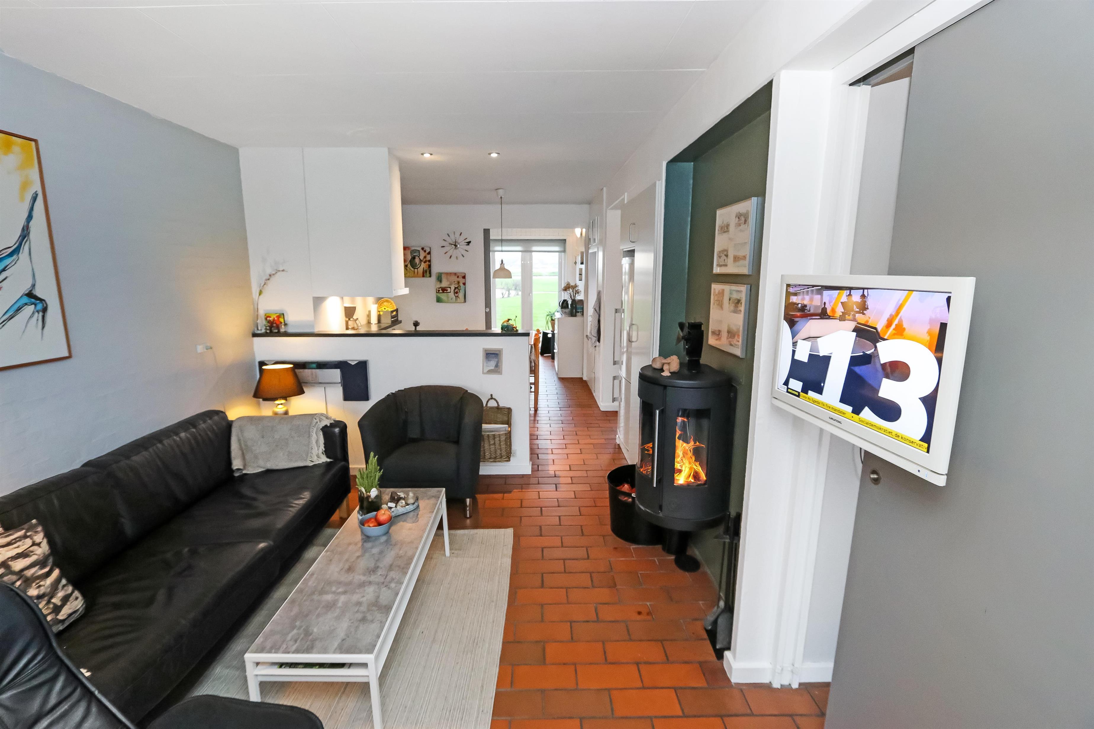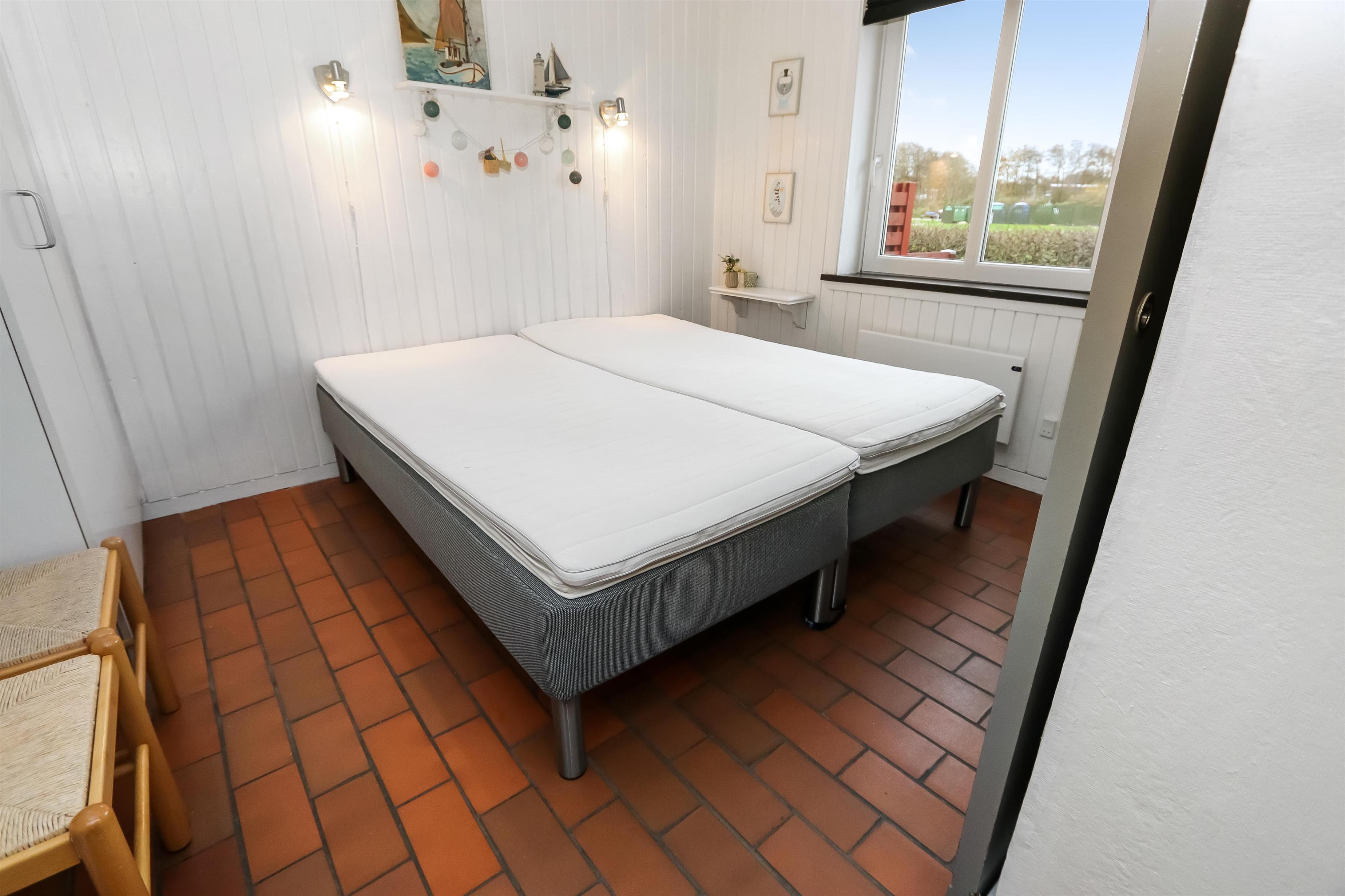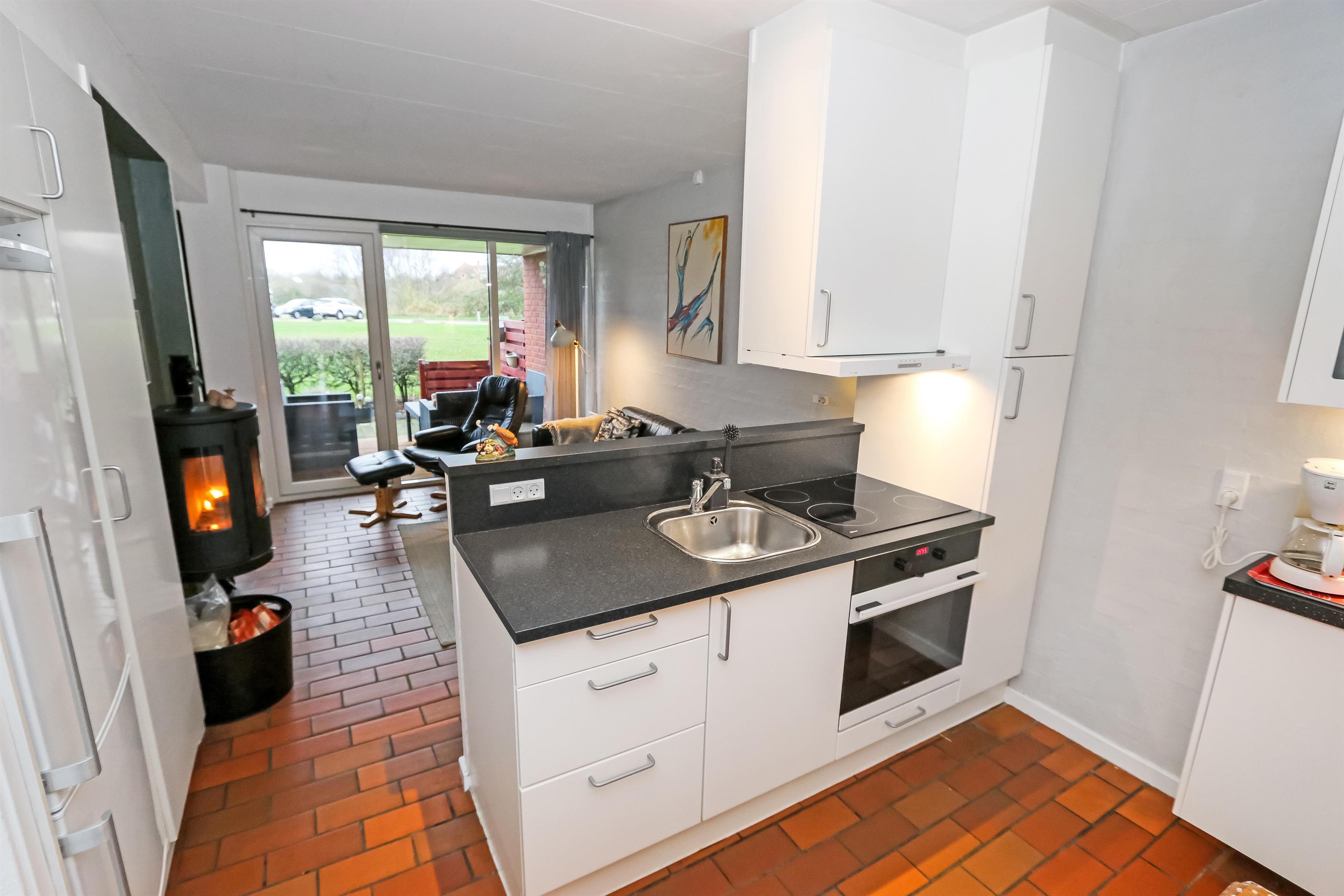 Køkkenet har glaskeramisk komfur, køleskab og en separat fryser på 40 liter.I stuen er der en stor sofagruppe med sofabord, brændeovn, samt kabel-tv med DR, TV2 tysk EUROSPORT1 og RTL, der er desuden Chromecast med mulighed for at streame egne programmer. Radioer ligeledes også inkluderet i stuen. Der er to soveværelser som er hver med en dobbeltseng. Fra det ene soveværelse er der udgang til een af husets 2 terrasser. Her kan man betragte morgensolen, mens man nyder lyden af Limfjorden. Badeværelset har en bruser, håndvask og toilet. Har man el-bil eller en Plug-In hybrid, så er der 4 Ladebokse til Type 2 ladestik, der kan lade op til 11 kWh ved Feriecenteret - de er lige efter miljøstationen.