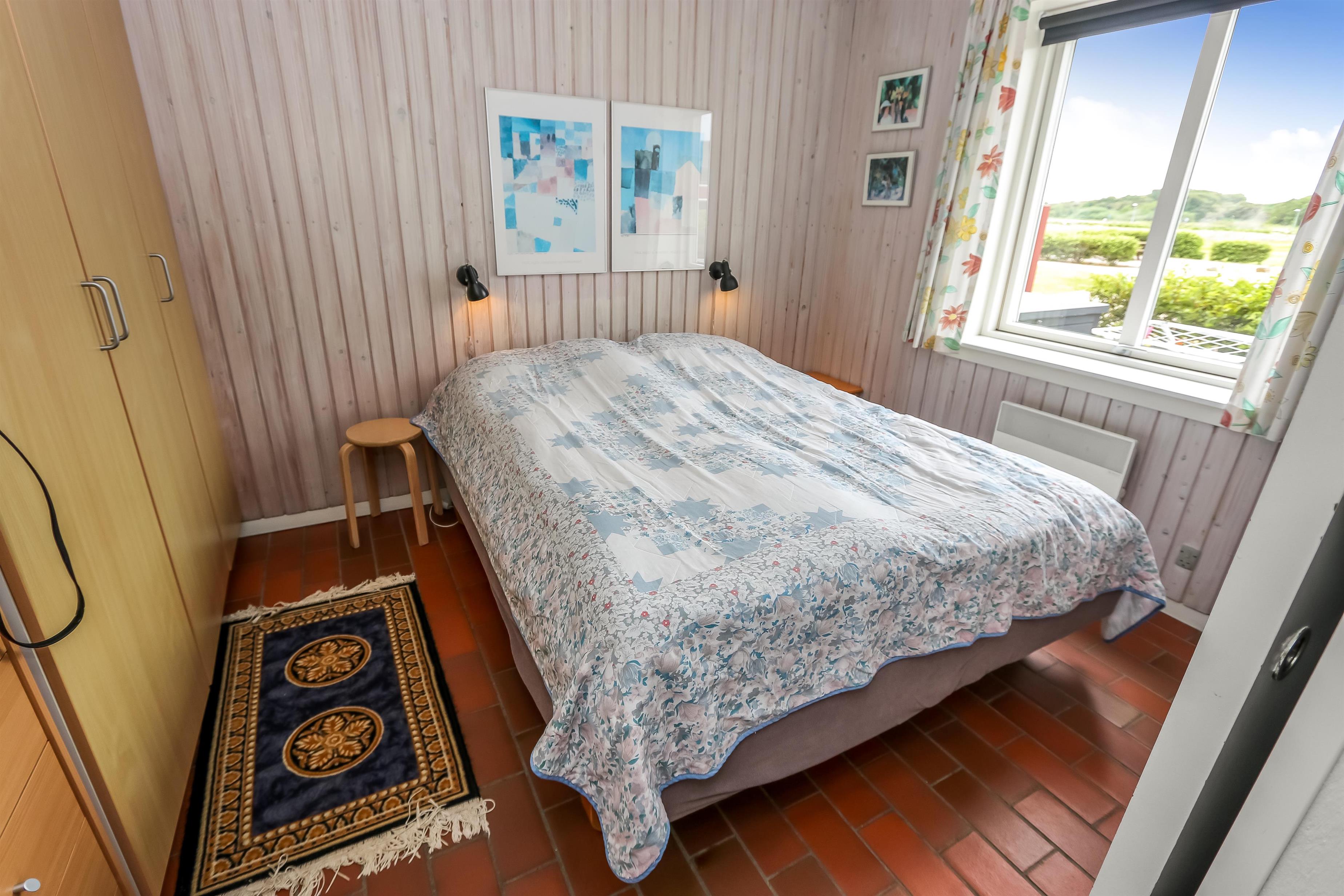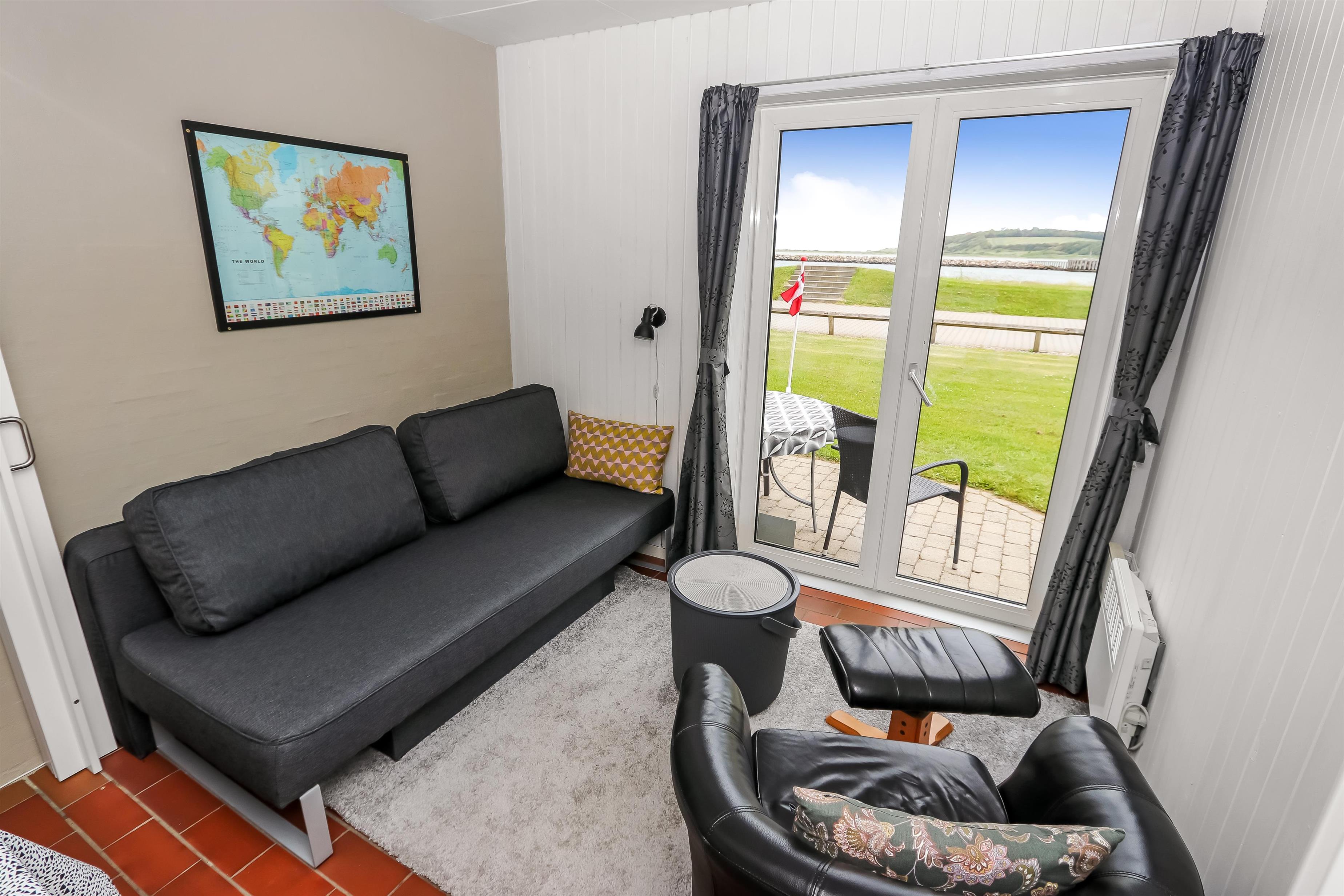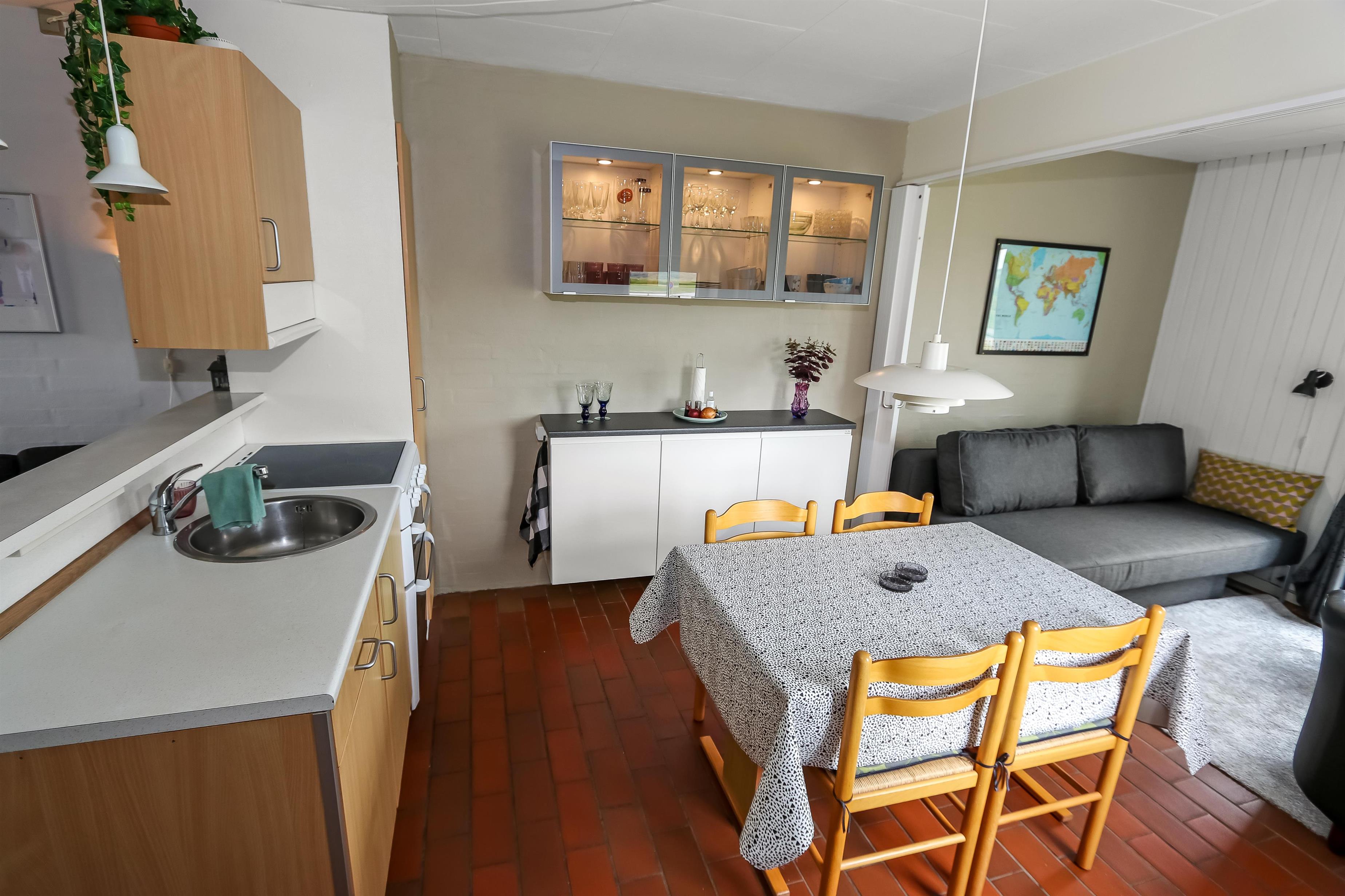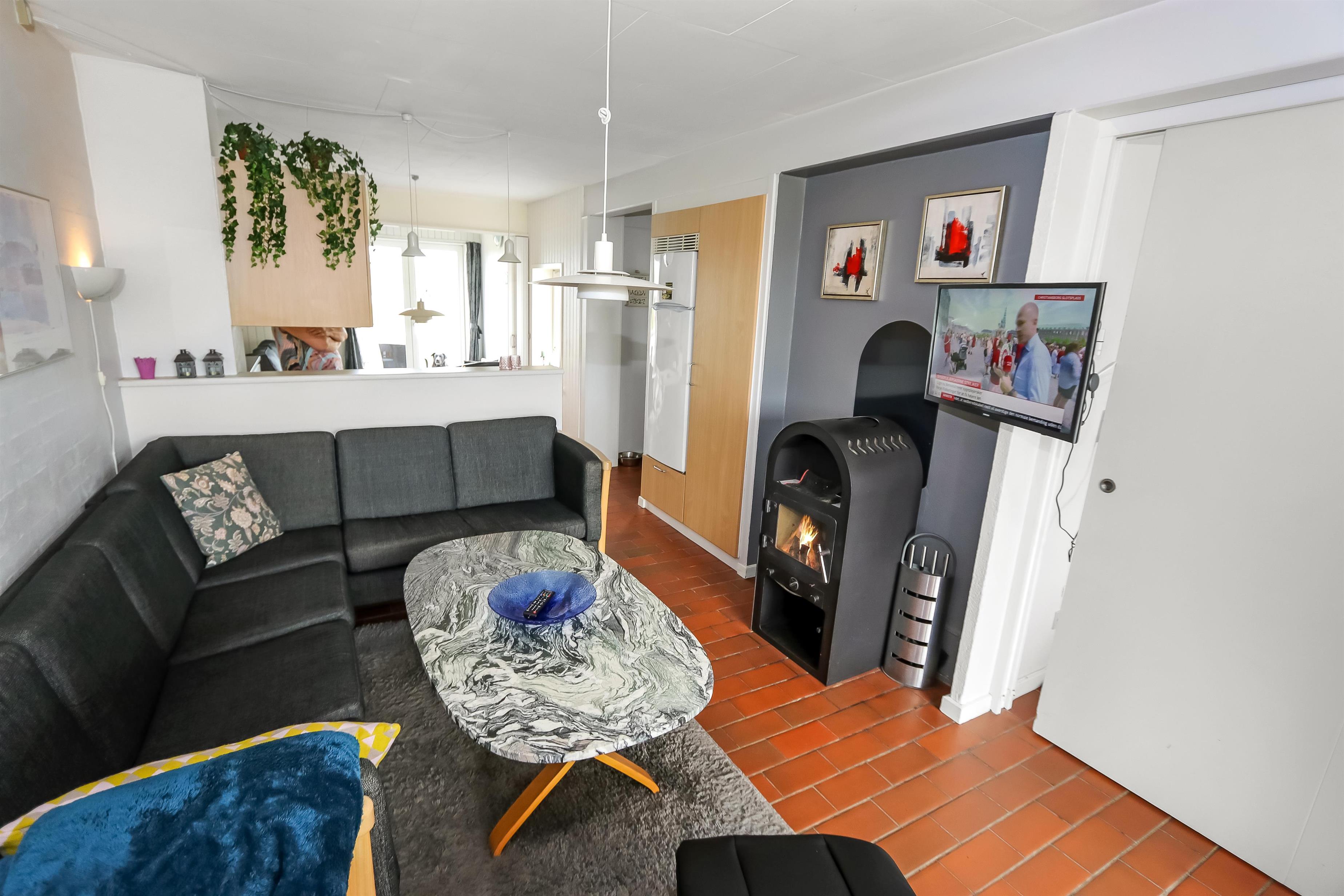 Køkkenet har glaskeramisk komfur, køleskab og en separat fryser på 40 liter. Hertil er der også en mikrobølgeovn. I stuen er der en stor sofagruppe med sofabord, brændeovn, samt kabel-tv med DR, TV2 tysk EUROSPORT1 og RTL. Radio, DVD og CD er ligeledes også inkluderet i stuen. Der er 1 soveværelse som er med en dobbeltseng og der er også mulighed for at afskærme endnu et værelse, hvor der kan reddes op på dobbelt sovesofa. Fra soveværelset er der udgang til en af husets 2 terrasser. Her kan man betragte morgensolen, mens man nyder lyden af Limfjorden. Badeværelset har en bruser, håndvask og toilet. Har man el-bil eller en Plug-In hybrid, så er der 4 Ladebokse til Type 2 ladestik, der kan lade op til 11 kWh ved Feriecenteret - de er lige efter miljøstationen.