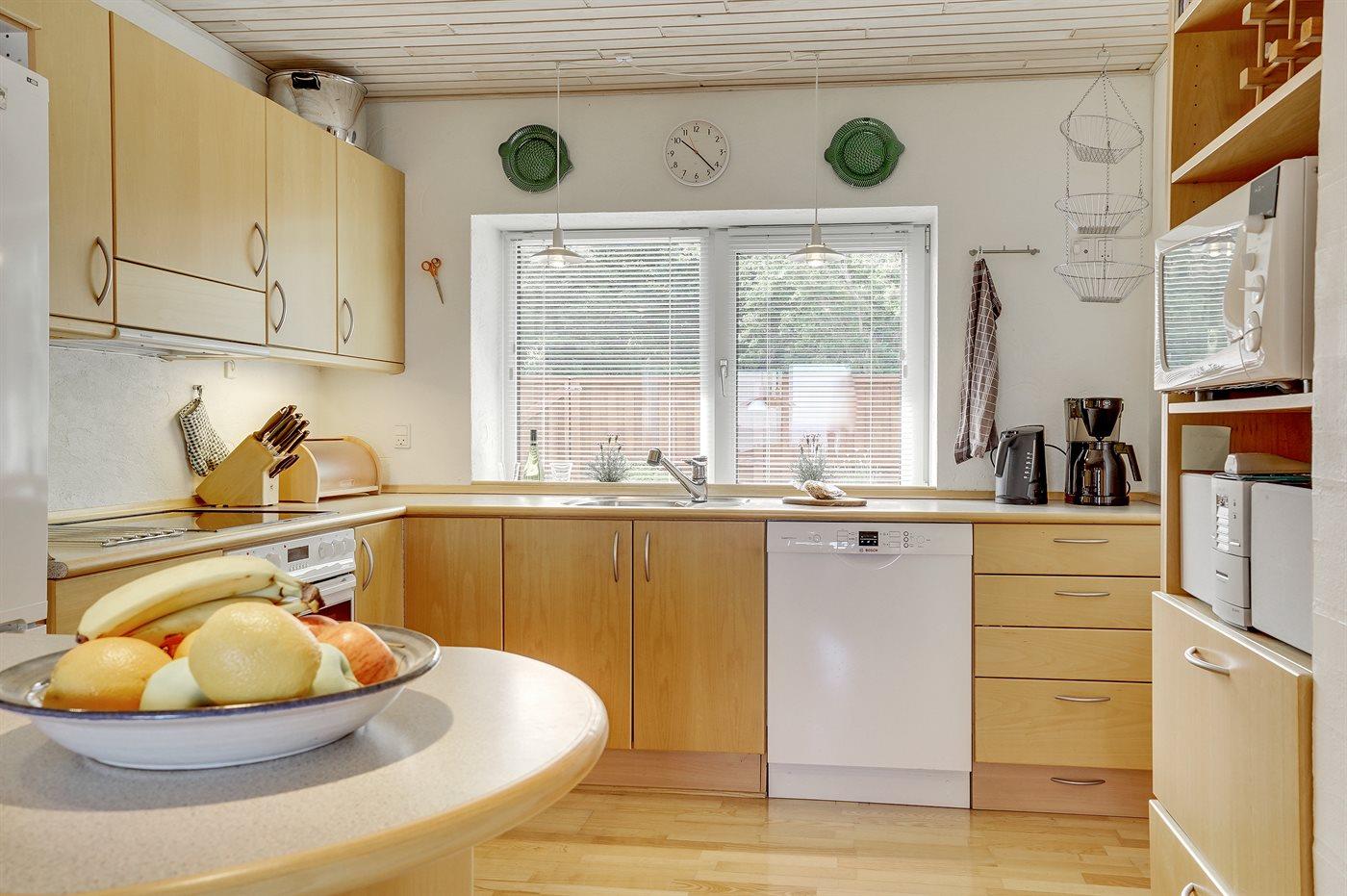 Køkkenet er udstyret med 1 køleskab. Der er 4 keramiske kogeplader, varmluftovn, mikrobølgeovn samt opvaskemaskine Der er gulvvarme i køkkenet.