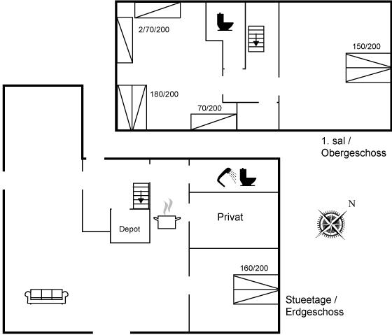 Der er i alt 3 soveværelser. Sovepladserne fordeler sig på: 6 sovepladser i dobbeltsenge. 3 sovepladser i enkeltsenge.