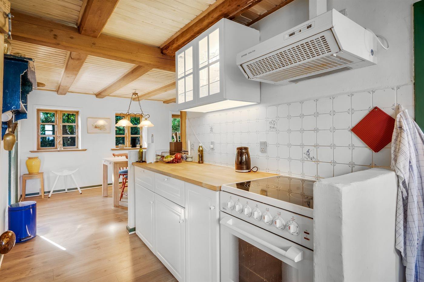 Køkkenet er udstyret med 1 køleskab. Der er 4 keramiske kogeplader, varmluftovn, mikrobølgeovn samt opvaskemaskine.