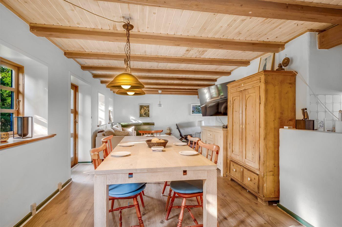 Huset er renoveret, men bevaret i den oprindelige stil. Der er kombineret stue og køkken med tv og brændeovn til at sprede hygge og varme til en kølig sommeraften eller efterårsaften med regn og rusk. Fra stuen er der panoramaudsigt over vandet. Køkkenet har bl.a. keramisk kogeplade, køleskab med frostboks, fryser på 160 liter og opvaskemaskine. Et soveværelse i stueetagen og to på 1. sal. Åben terrasse, hvor I kan tilberede aftensmaden på grillen og nyde de lyse sommeraftner og den smukke solnedgang over Limfjorden. Der er en stor grund med mange frugttræer, som I er velkomne til at plukke til eget brug.