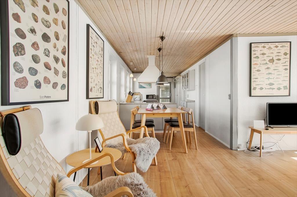 Sommerhuset har en enkel og praktisk indretning, hvor alle kvadratmeter udnyttes optimalt. Soveværelser er der to af, som i alt giver plads til seks overnattende gæster. Et badeværelse byder planløsningen også på, foruden et opholdsrum med integreret køkken og stue. Det er husets største rum, som i den ene ende endda er forlænget af en lille udestue - det er et skønt sted at nyde solen, hvis vejret er for koldt til at rykke helt ud under åben himmel. Stuen byder også på en brændeovn, så ferieaftnerne kan bruges på brætspil og krimilæsning nær den knitrende varme.