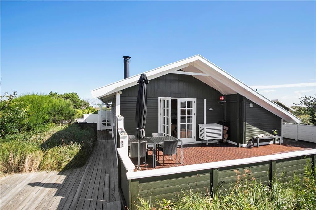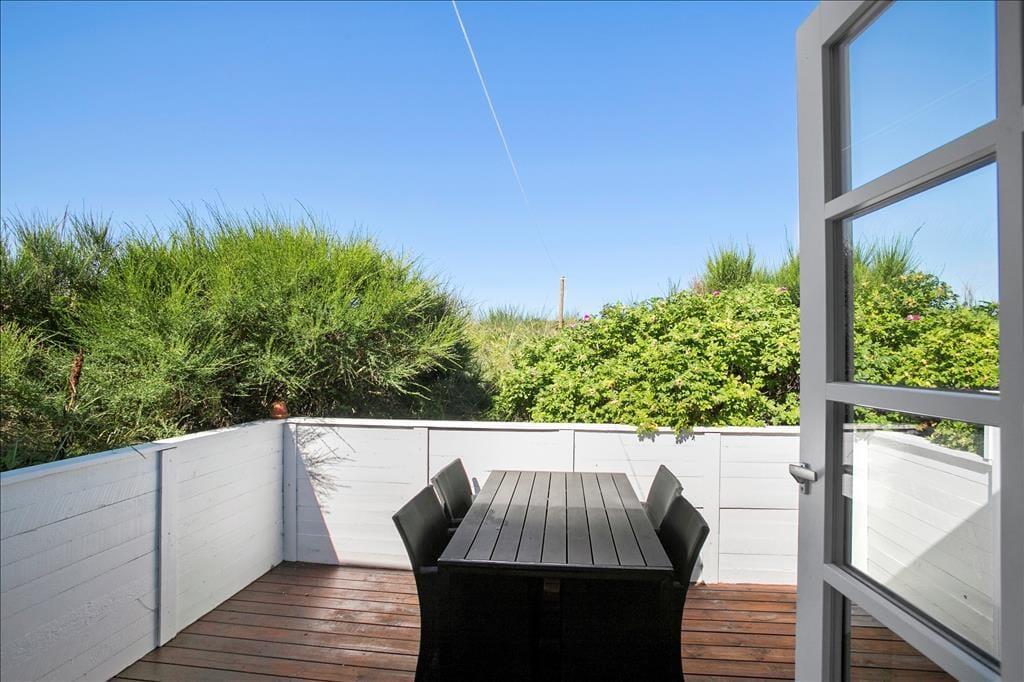 Selvom huset er et skønt sted at være, vil I formentlig flytte ud på terrassen, når sommersolen skinner. Det er nemlig en herlig oase, der ligger midt i Lild Strands flotte, let kuperede klitlandskab. En del af terrassen er helt lukket og afskærmet af plankeværk, og et andet område ligger nedsænket i forhold til klitterne, så det er en dejligt læfyldt lomme at nyde driverlivet på.