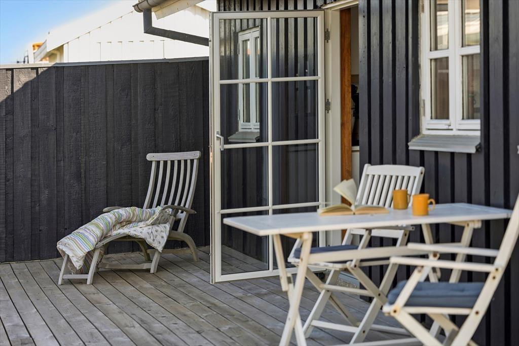 Sommerhuset og annekset forbindes af et herligt terrassemiljø: Her er der både afskærmede solkroge, overdækkede arealer og helt åbne områder, og uanset hvor I sætter jer, kan I nyde udsigten over naturgrunden og det spektakulære hedelandskab. Skal aftensmaden tilberedes ude i det fri, kan I ryge friskfangede fisk i røgeovnen eller stege pølser over bål – og ved bålpladsen ligger der for øvrigt bøjer og andet fiskeudstyr, for at skabe en autentisk stemning. Bemærk venligst, at der ikke er en grill til rådighed ved sommerhuset.