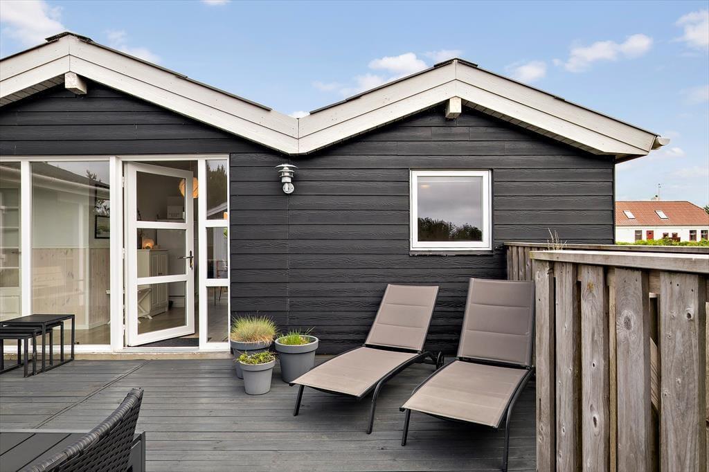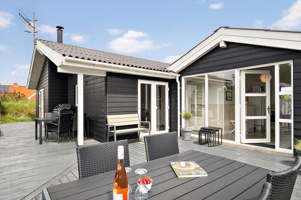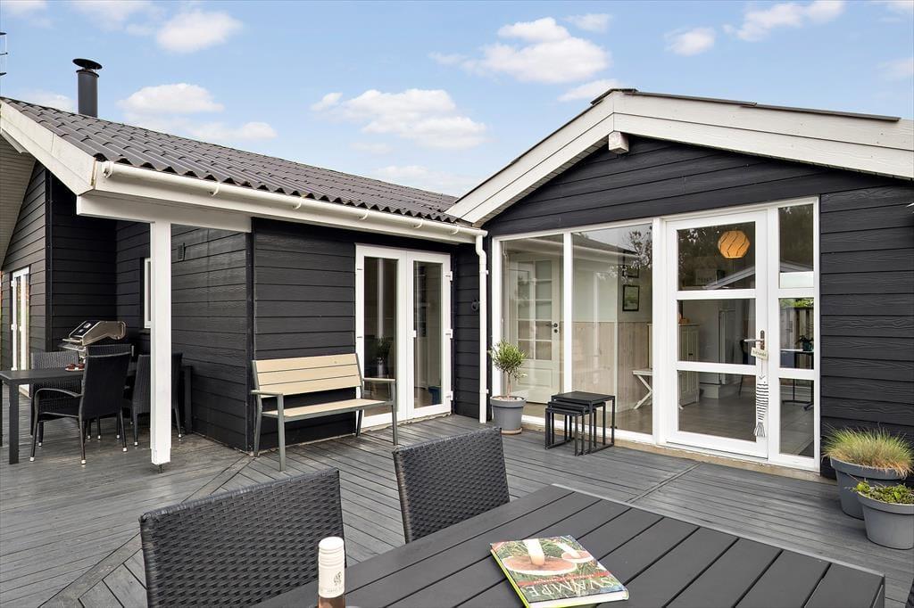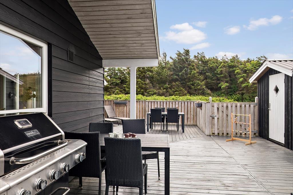 Den store naturgrund skærmes af hybenbuske ud mod Strandvejen, og på den vestlige side af sommerhuset breder et skønt og delvist overdækket terrassemiljø sig. Et træhegn skærmer opholdsarealet af, og der er flere gode solkroge at vælge imellem, når du får lyst til at slænge dig i en god liggestol eller dække op til en lækker frokost under åbne himmel. En del af træterrassen hæver sig op som en udsigtsplatform, og her er der særligt godt at være, hvis du gerne vil skue ud over Lild Strands bylandskab og nyde synet af havet i horisonten. Terrassen og grunden er indhegnet så familiens hund kan færdes sikkert og frit på ferien.