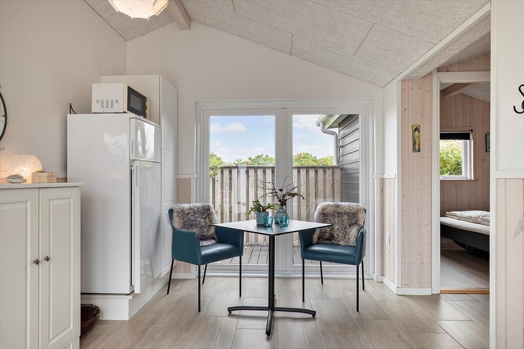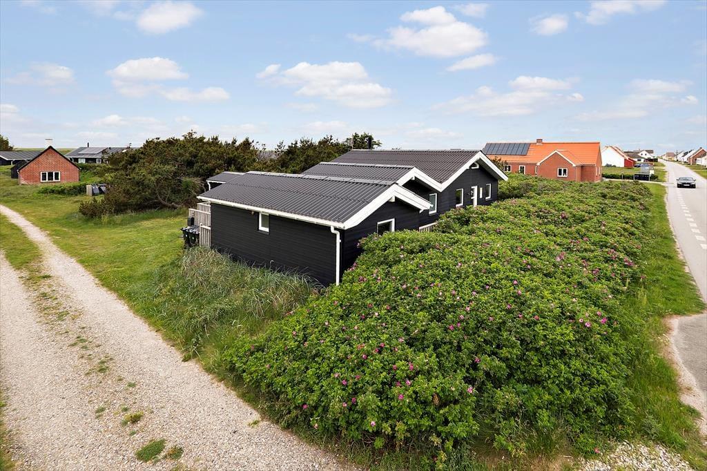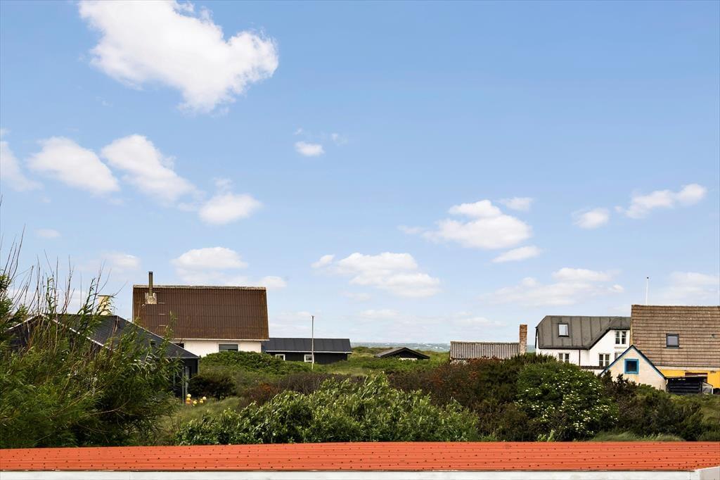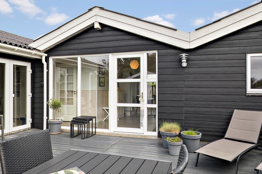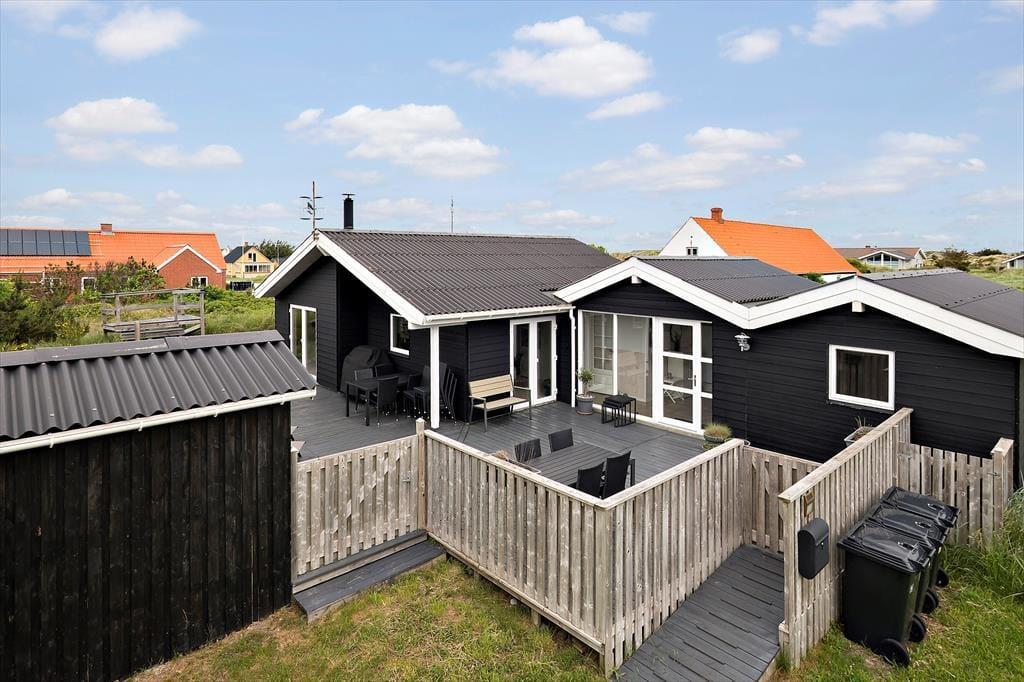 Den store naturgrund skærmes af hybenbuske ud mod Strandvejen, og på den vestlige side af sommerhuset breder et skønt og delvist overdækket terrassemiljø sig. Et træhegn skærmer opholdsarealet af, og der er flere gode solkroge at vælge imellem, når du får lyst til at slænge dig i en god liggestol eller dække op til en lækker frokost under åbne himmel. En del af træterrassen hæver sig op som en udsigtsplatform, og her er der særligt godt at være, hvis du gerne vil skue ud over Lild Strands bylandskab og nyde synet af havet i horisonten. Terrassen og grunden er indhegnet så familiens hund kan færdes sikkert og frit på ferien.