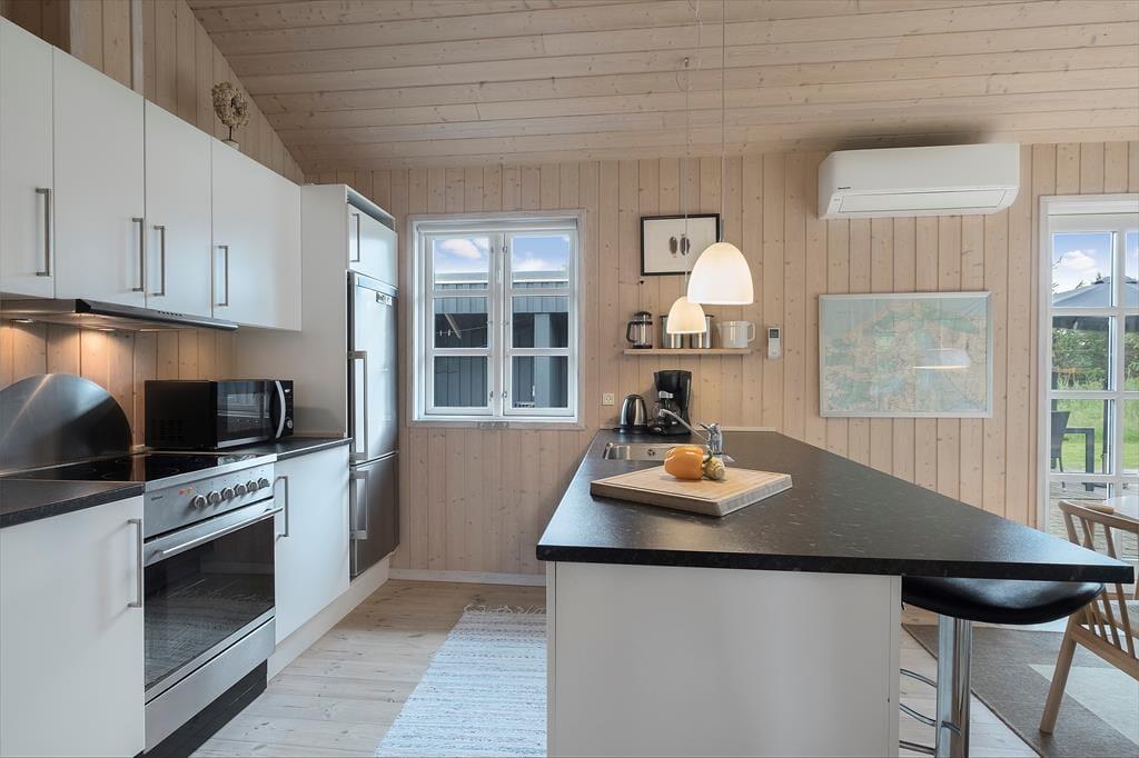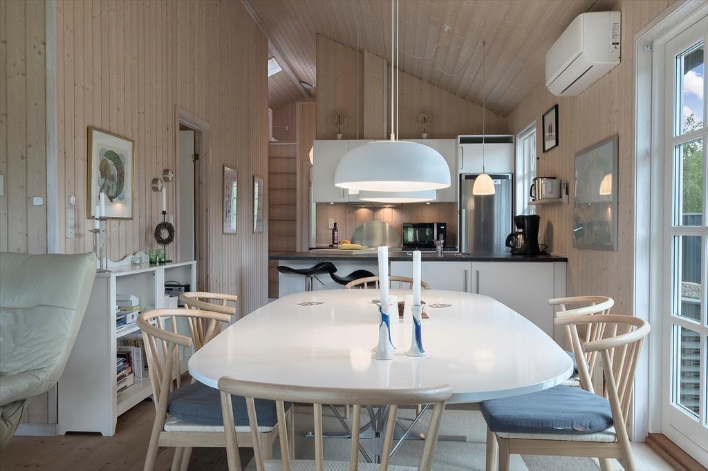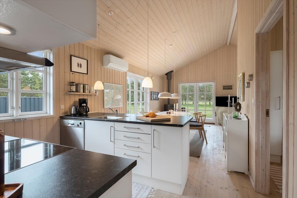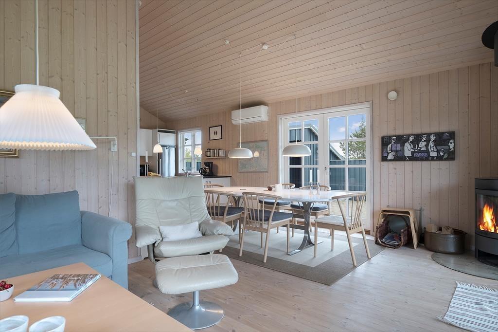 Dette lyse, imødekommende og meget flotte sommerhus er velholdt og moderne indrettet med et stort og centralt opholdsrum, hvor hele familien kan mødes til madlavning, måltider, hygge, spil og afslapning. Holder man ferie i de kolde måneder, er det ekstra dejligt at tænde op i brændeovnen i stuen eller fylde det indendørs spabad op med varmt vand og lade sig synke ned til en times luksus i fred og ro. Sommerhuset har plads til en hel familie, og er der mindre børn i familien, kan man bruge den ekstra barnestol og den lille seng, mens de større børn vil sætte pris på at kunne benytte det trådløse internet. Hele sommerhuset er godt udstyret og har bl.a. vaskemaskine, tørretumbler og en ekstra fryser, hvis man har heldet med sig på fisketurene i lokalområdet. Sommerhuset er en god kombination af funktionalitet, hygge og gode faciliteter.