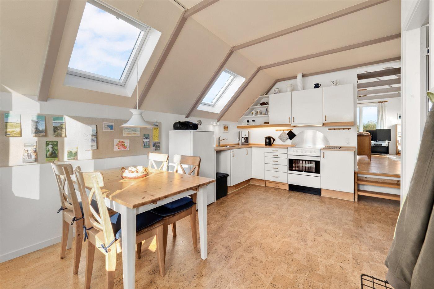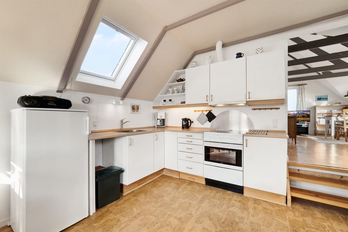 Køkkenet er udstyret med 1 køleskab. Der er 4 keramiske kogeplader, varmluftovn, mikrobølgeovn.