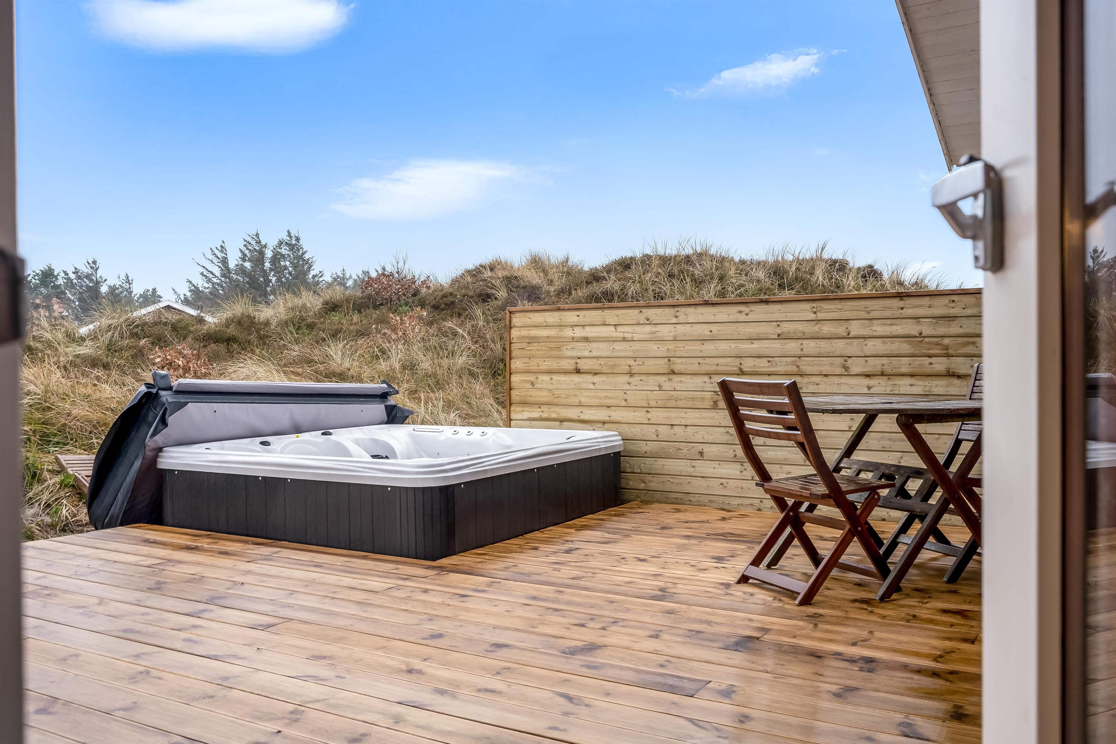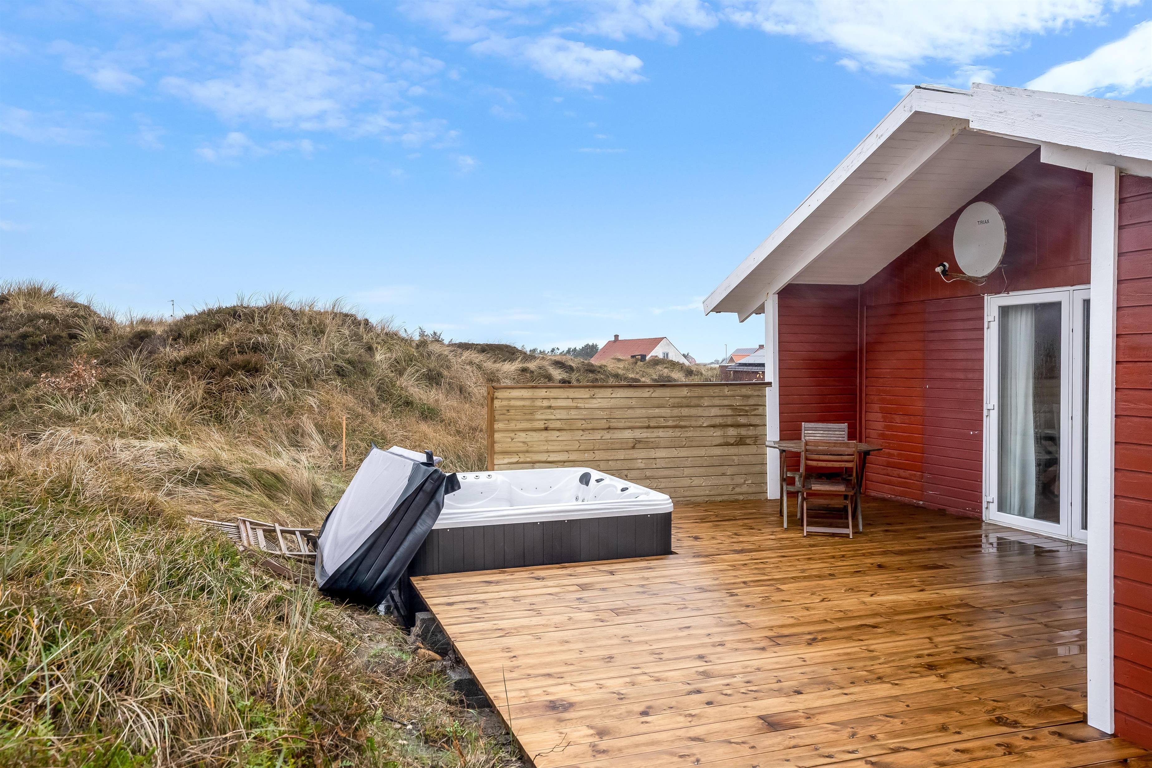 Der er ét badeværelse med bruser og toilet, hvilket gør det både praktisk og funktionelt for alle gæster. Huset er også udstyret med en energibesparende varmepumpe, der også kan fungere som aircondition, så du kan holde dig kølig på varme sommerdage. Den store træterrasse med det store udespa, giver mulighed for at nyde de udendørs omgivelser og den friske luft, mens du slapper af med en god bog eller et glas vin.