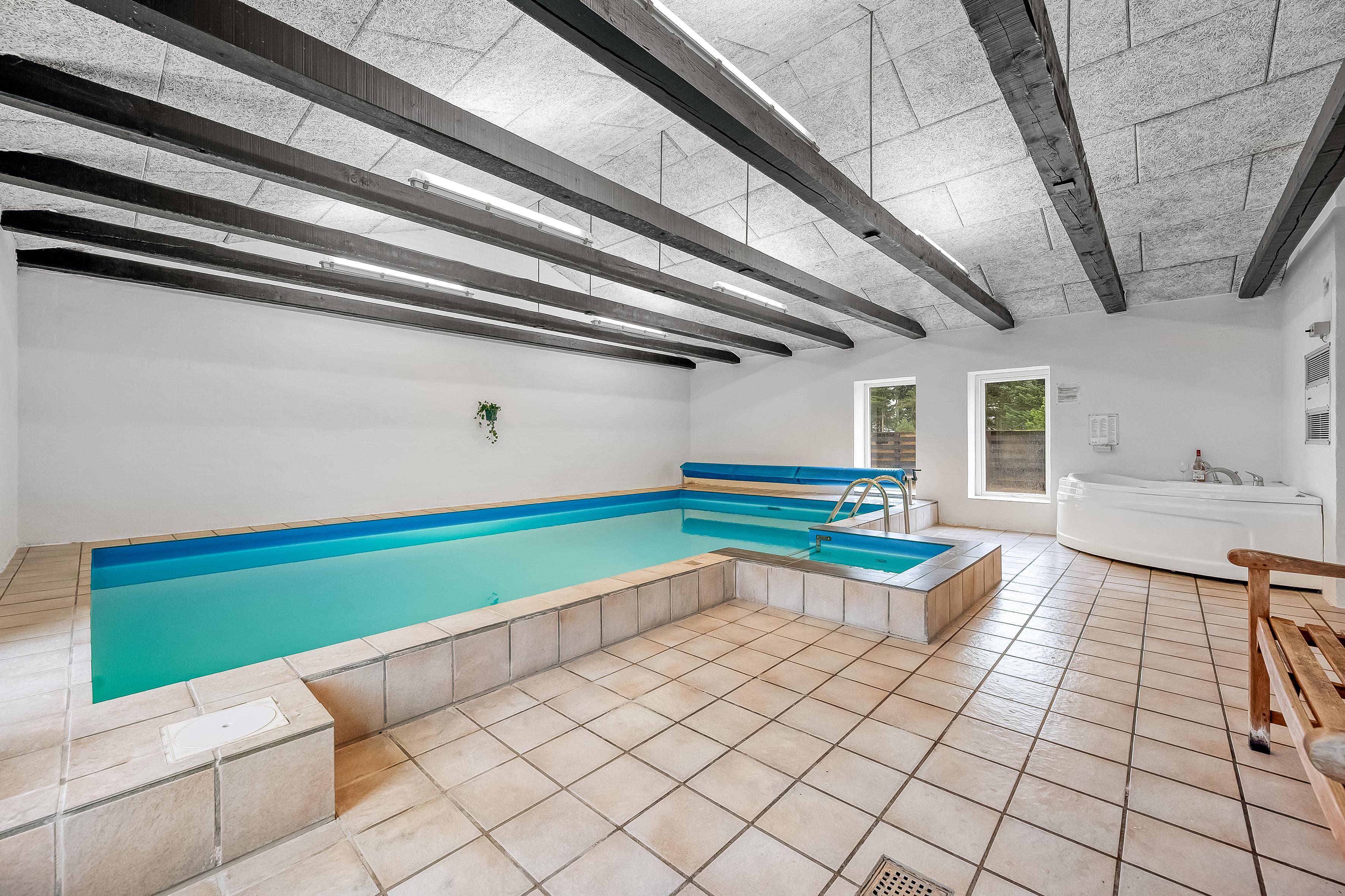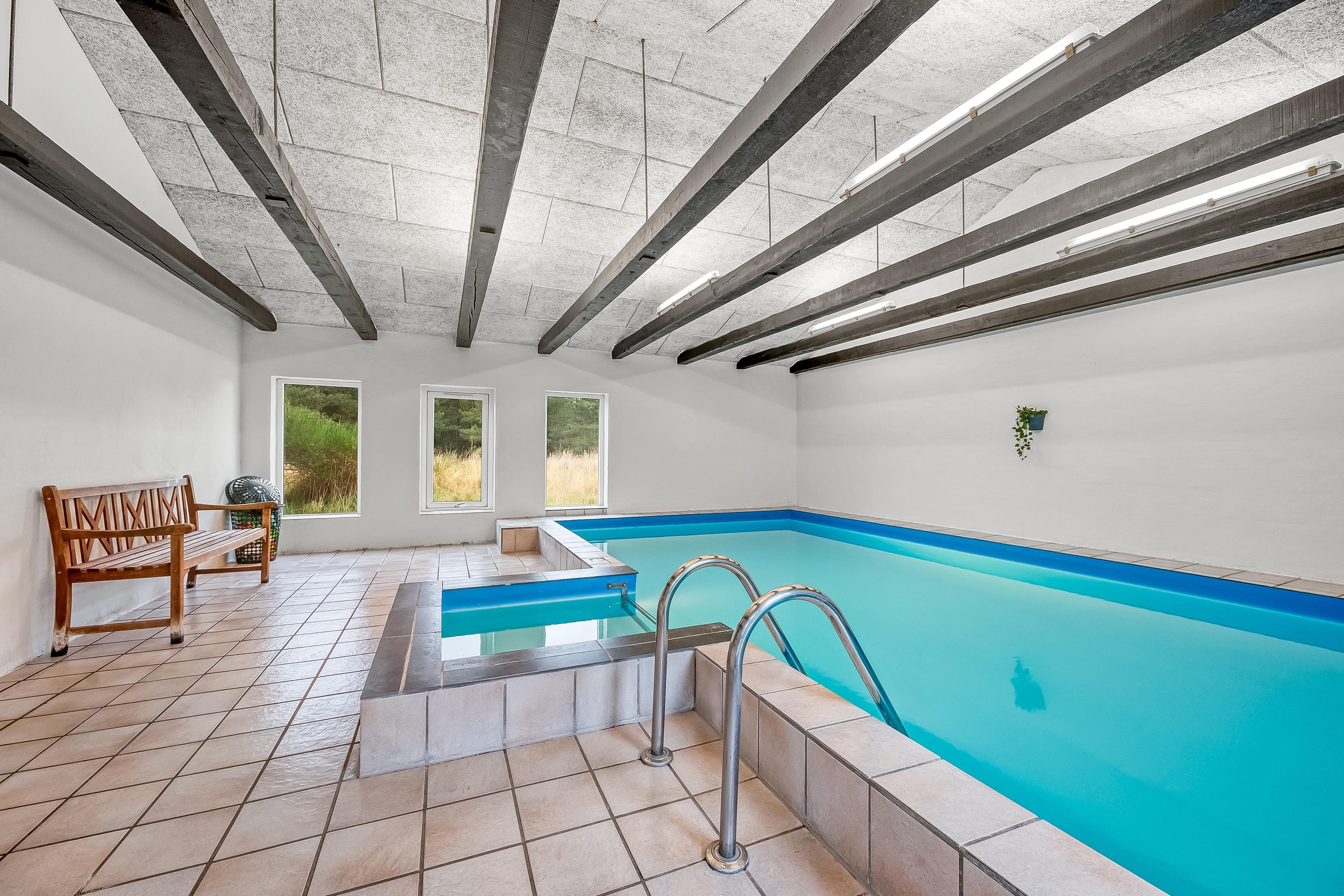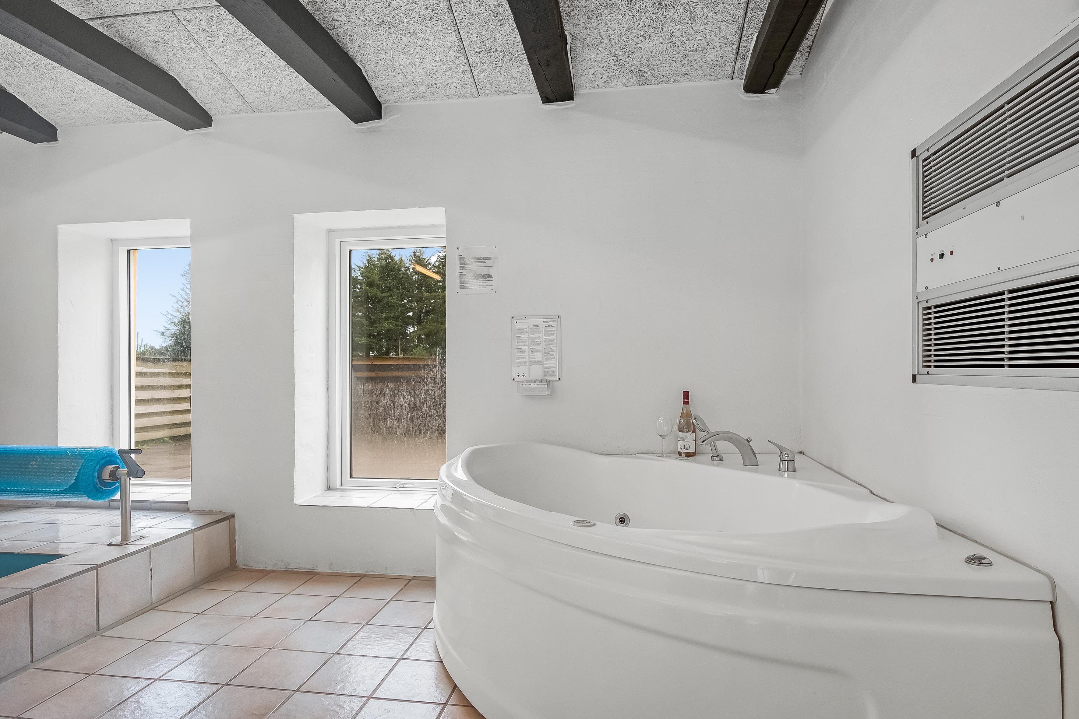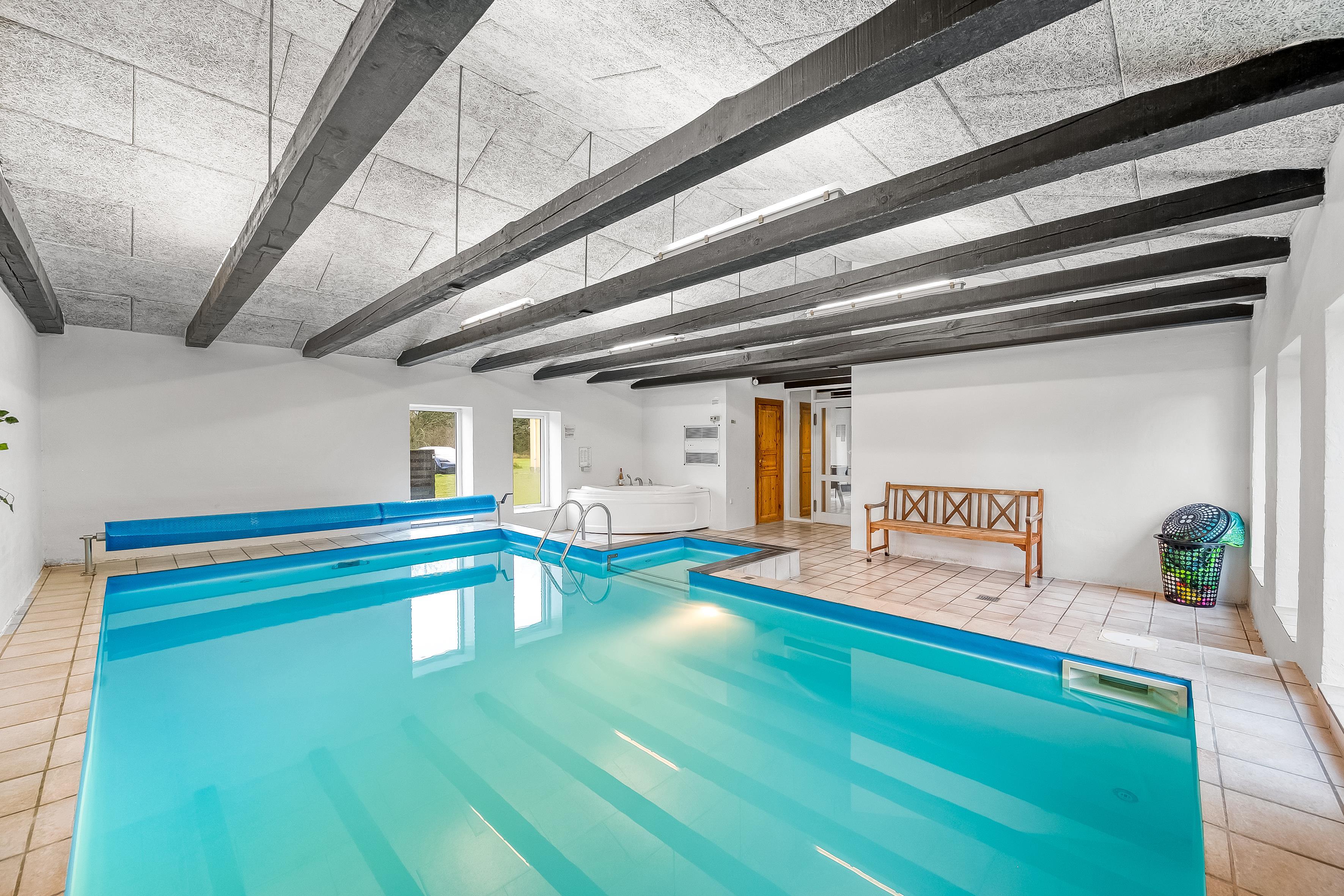 Feriehuset er udstyret med alt, hvad I behøver for at slappe af og nyde ferien. Den store swimmingpool (6,5 m x 3,5 m) indbyder til sjov og afslapning, mens den varme sauna og spaen til to personer, tilbyder det perfekte sted til at lade batterierne op, efter en dag i naturen. Her er også brændeovn, energivenlig varmepumpe og gulvvarme, som sørger for, at I altid har det behageligt.
