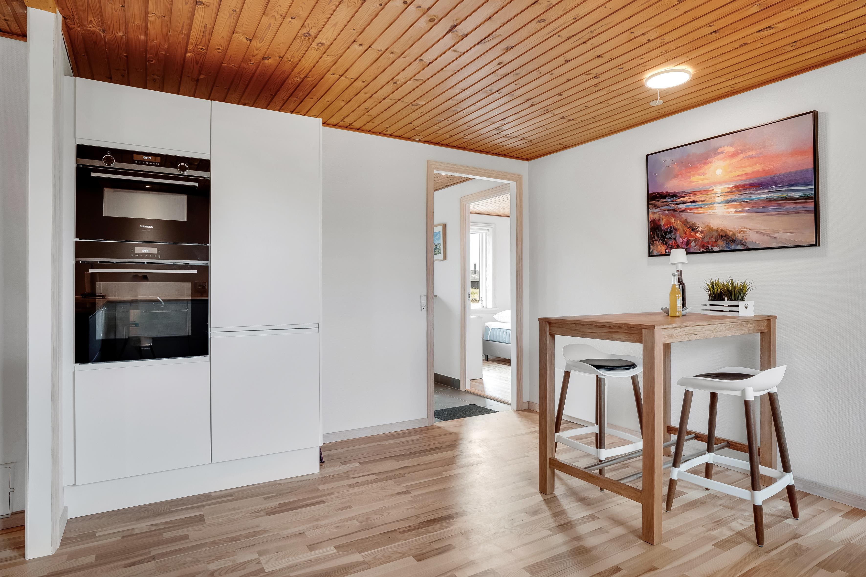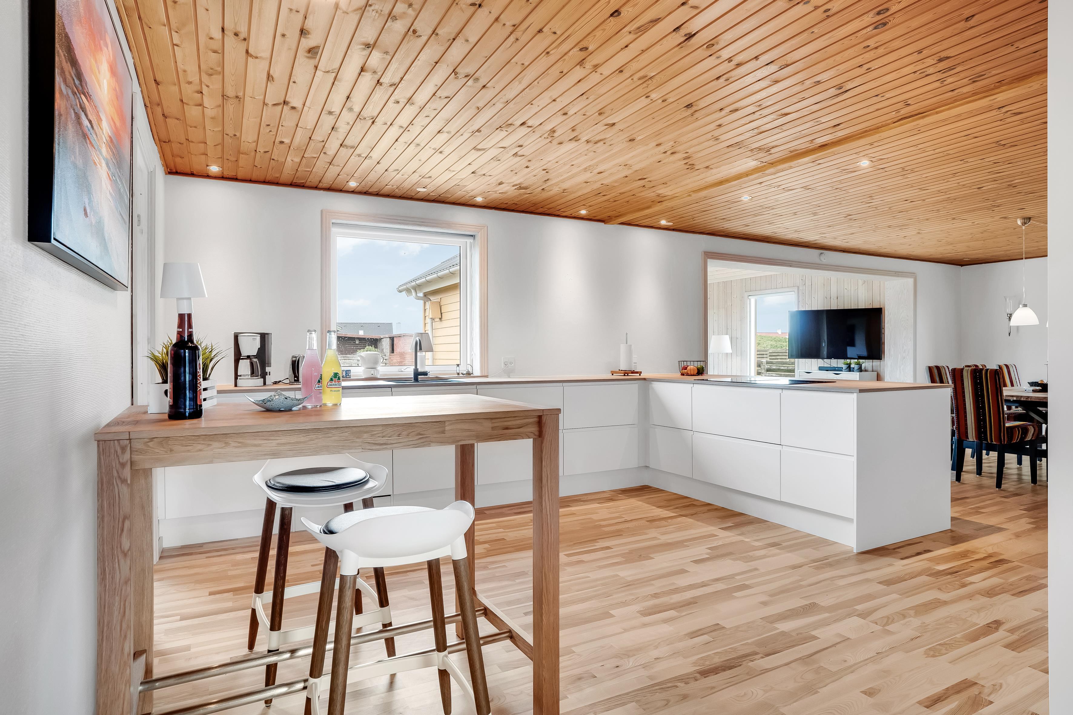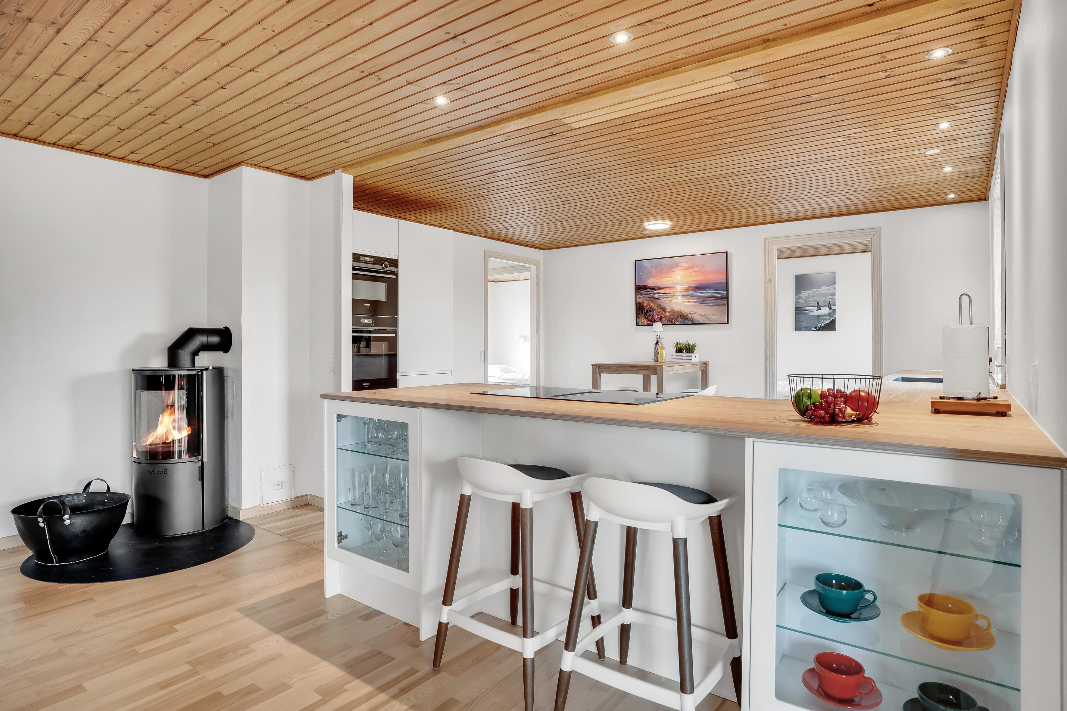 Køkkenet er fuldt udstyret med moderne apparater, herunder et induktionskomfur, ovn, mikrobølgeovn, opvaskemaskine, køleskab og fryser med en kapacitet på 50 liter. Det åbne køkken giver mulighed for socialt samvær, mens du forbereder måltider til familien. Der er også en vaskemaskine og tørretumbler til rådighed, hvilket gør det nemt at holde tøjet rent under dit ophold.