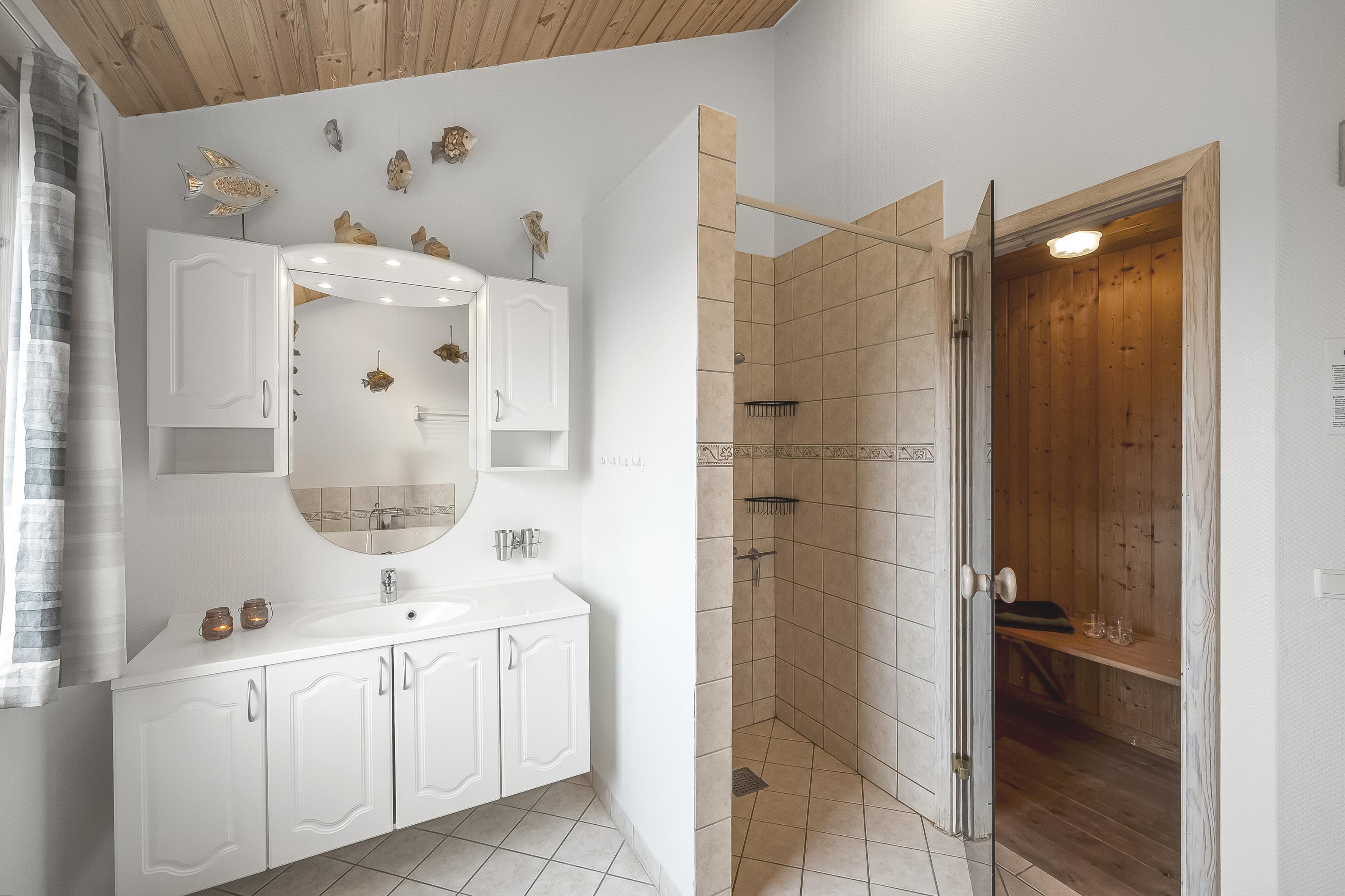 For dem, der elsker at lave mad, er køkkenet fuldt udstyret med alt, hvad I har brug for – herunder et køleskab, induktionskogeplader, varmluftovn, mikrobølgeovn og opvaskemaskine. Sommerhuset har både et badeværelse med bruseniche og et ekstra gæstetoilet. Efter en dag med friske havbriser kan I slappe af i saunaen eller den indendørs spa, som har plads til to personer.