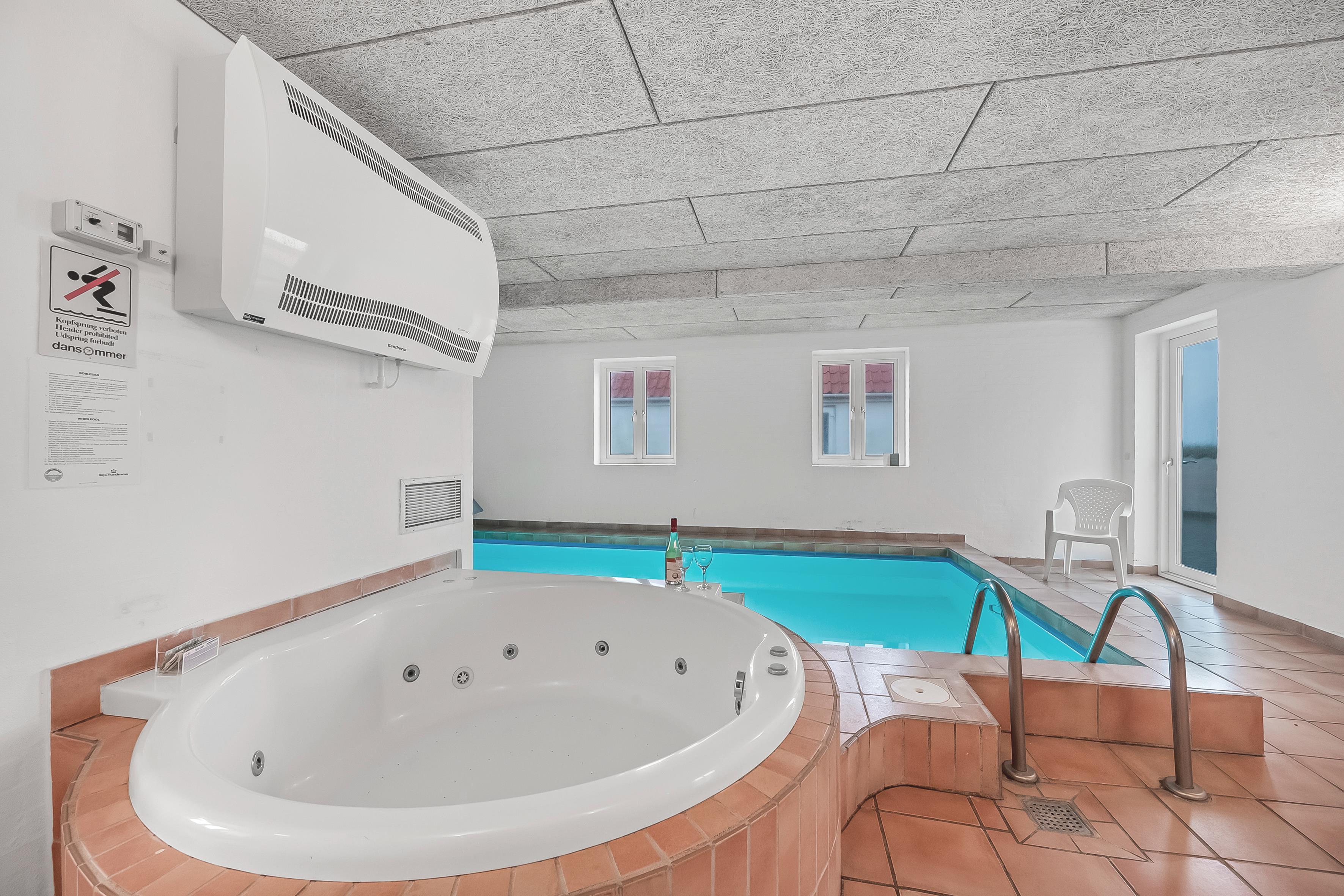Indendørs byder sommerhuset på en lækker swimmingpool, perfekt til leg og afslapning. Poolen måler 5 x 3 meter og er op til 1,3 meter dyb med en behagelig vandtemperatur. Modstrømsanlægget i poolen giver samtidig mulighed for en forfriskende svømmetur. Der er desuden gulvvarme i hele poolområdet.
