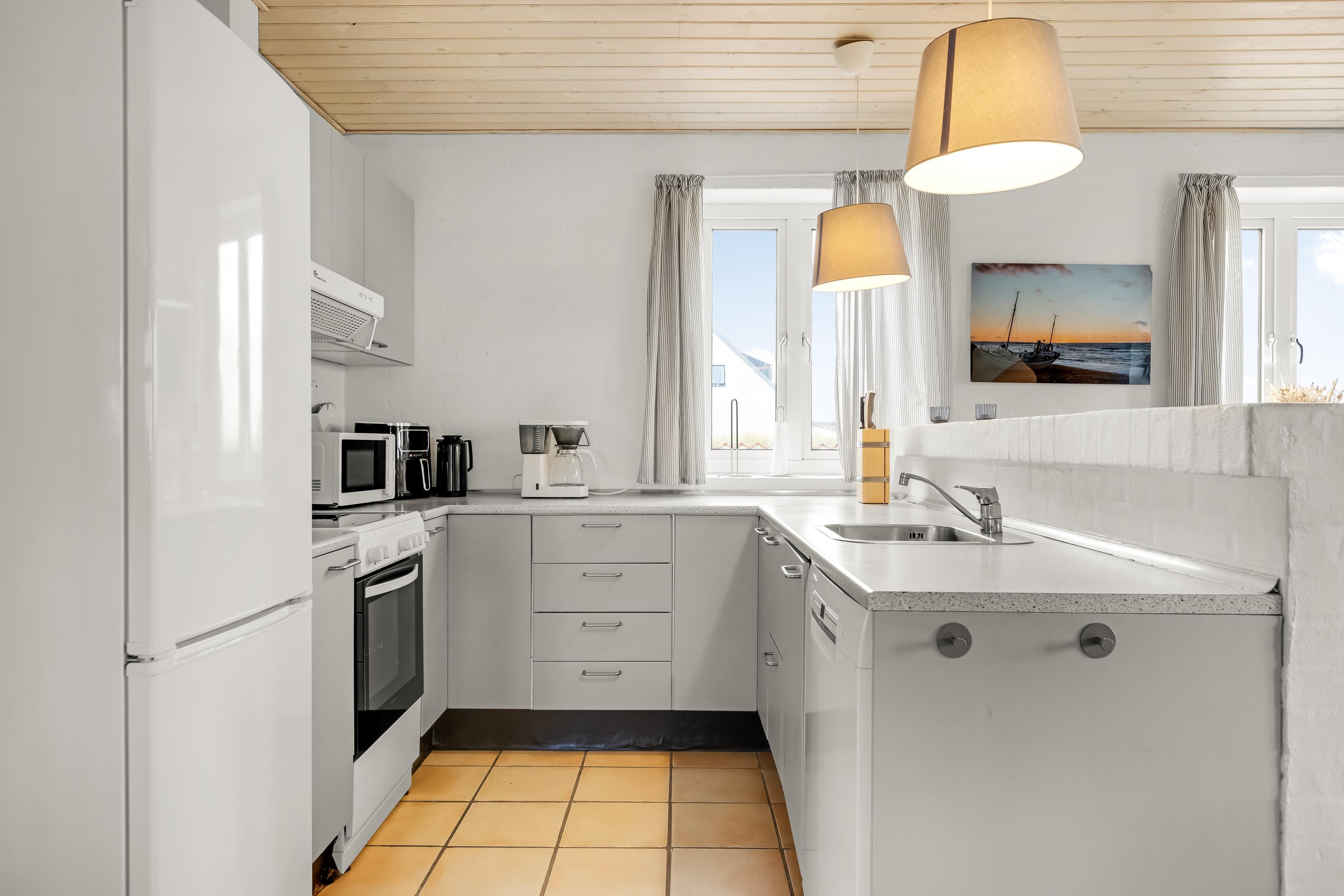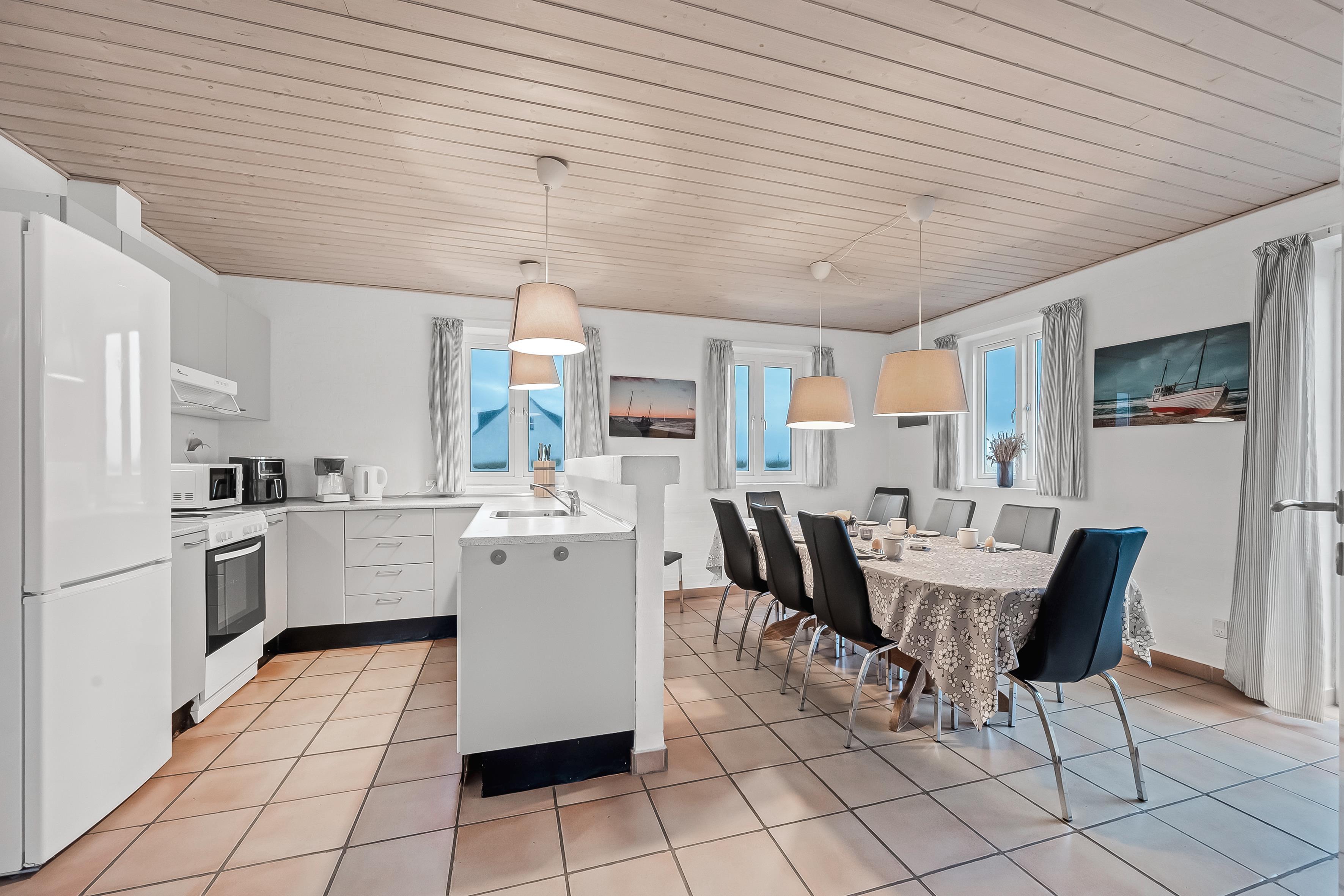 Der er fem komfortable soveværelser med dobbeltsenge i feriehuset. Køkkenet er fuldt udstyret med alt, hvad I har brug for, herunder køleskab med 60 liters fryser, keramiske kogeplader, varmluftovn, mikrobølgeovn og opvaskemaskine.