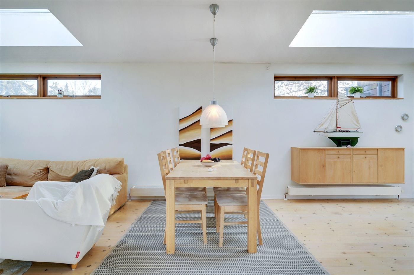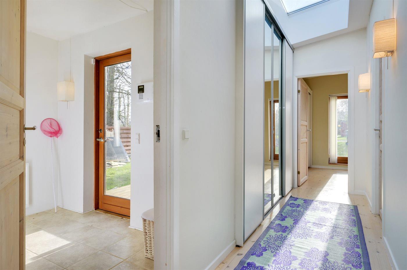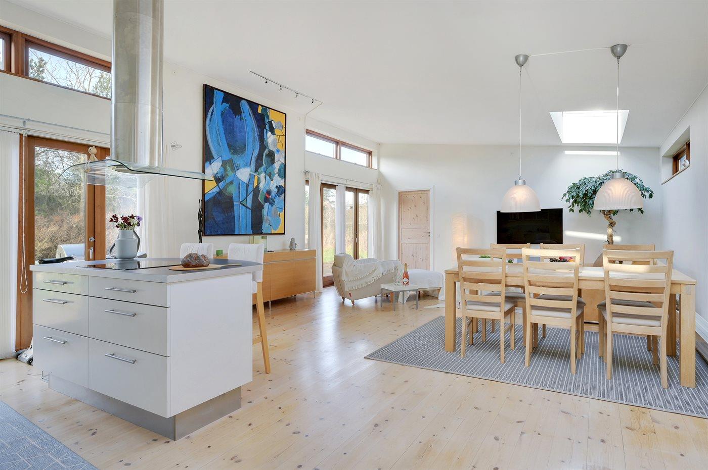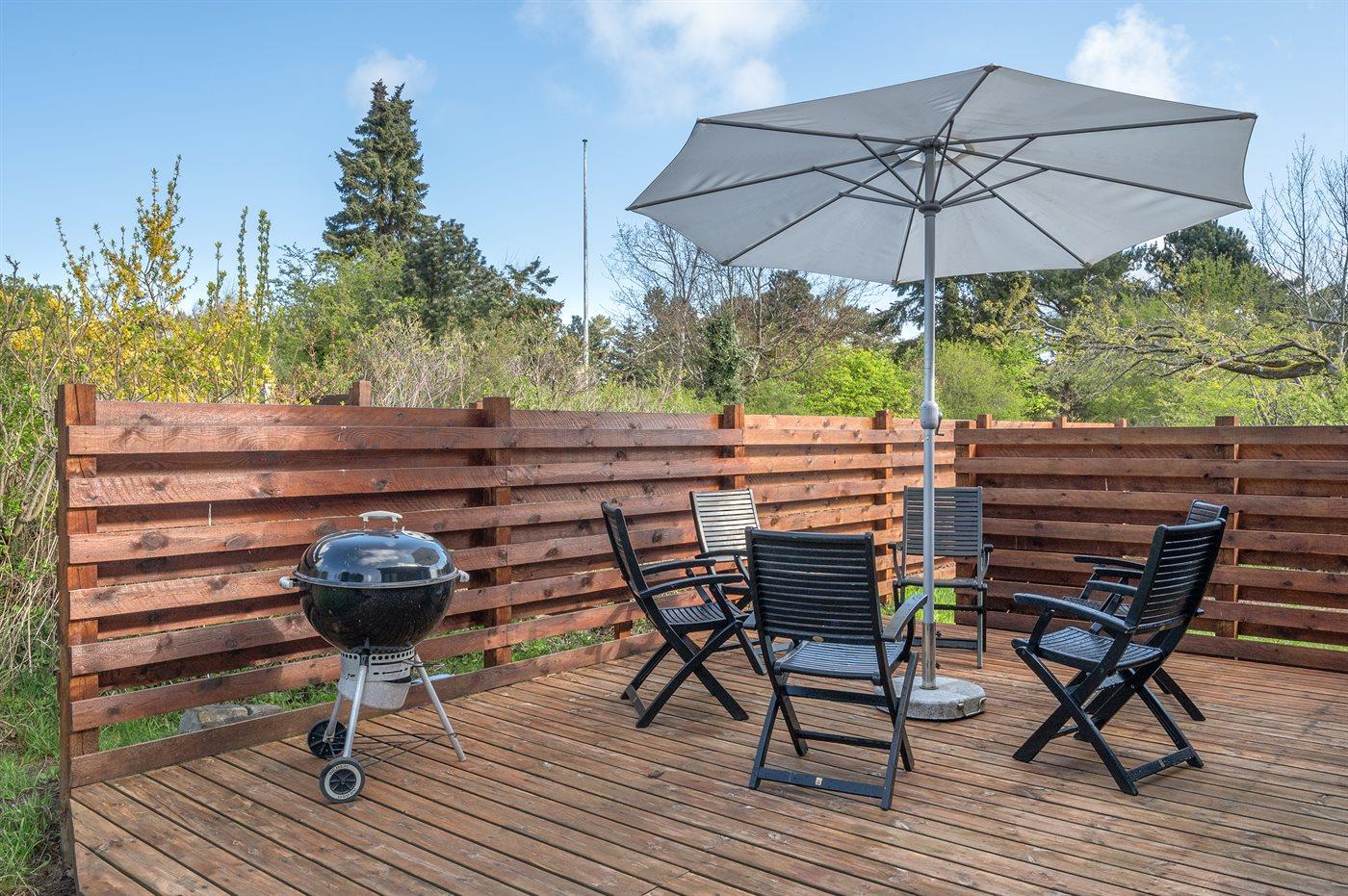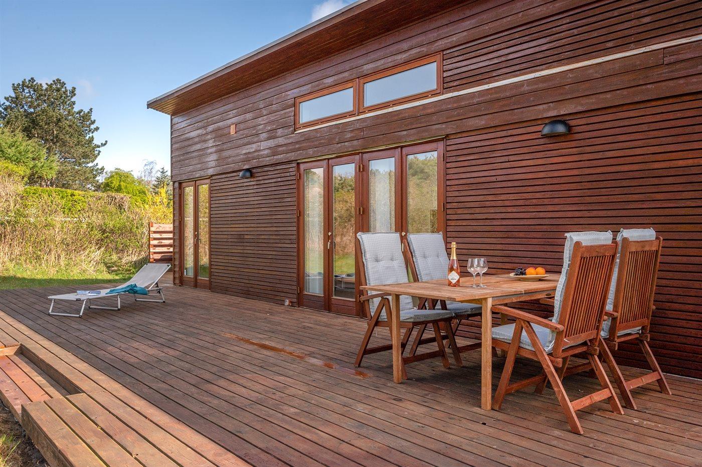 Lækkert, moderne og lyst sommerhus med udgang fra alle værelser til stor træterrasse. Huset er beliggende på en rolig vej i gåafstand til skøn badestrand.