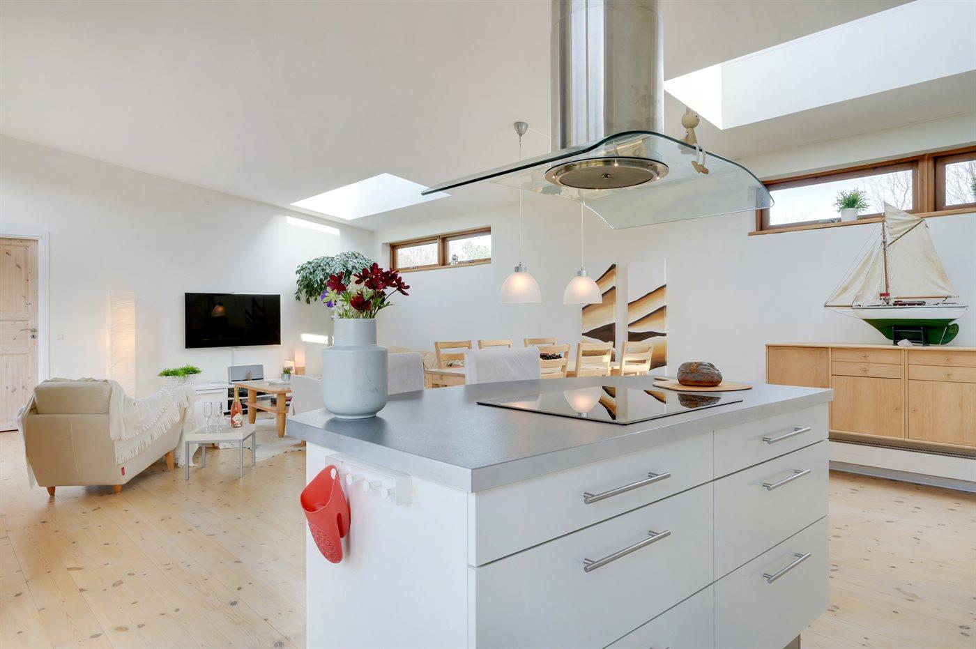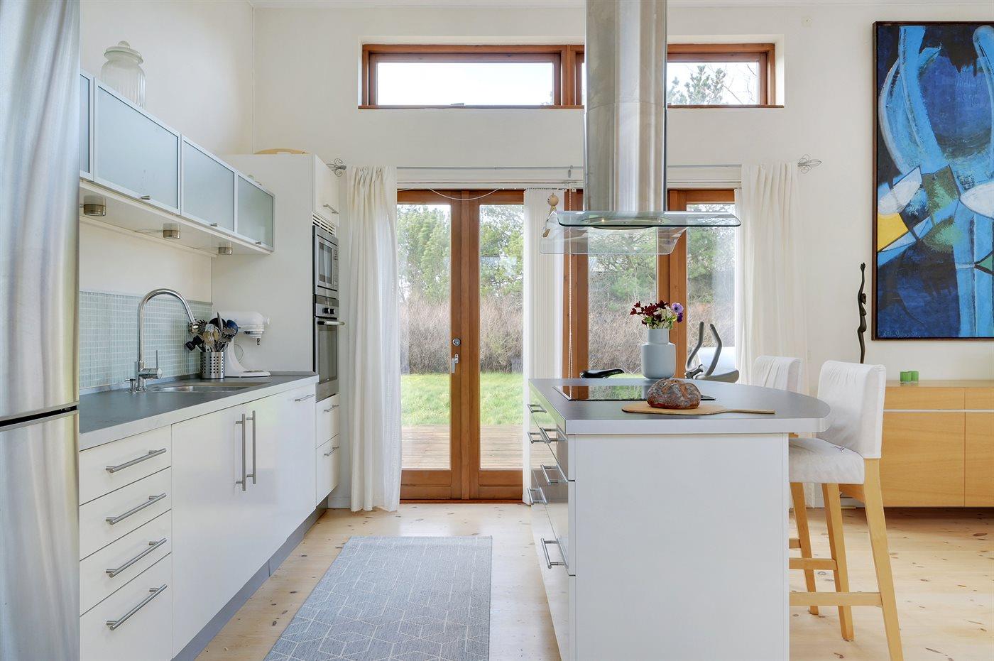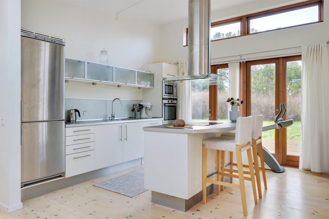 Køkkenet er udstyret med 1 køleskab. Der er 4 keramiske kogeplader, varmluftovn, mikrobølgeovn samt opvaskemaskine.