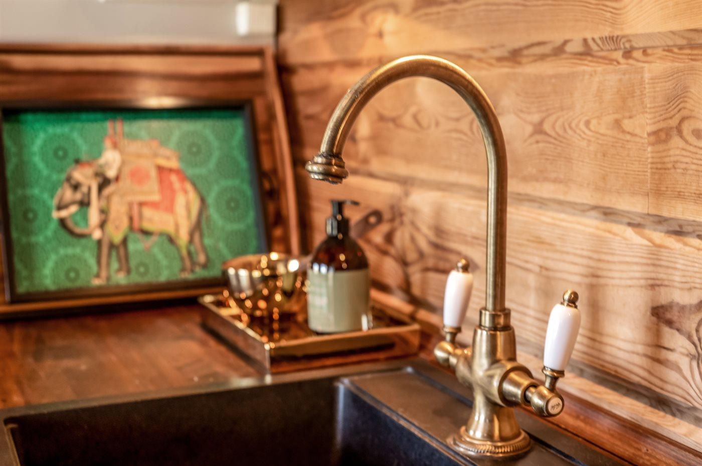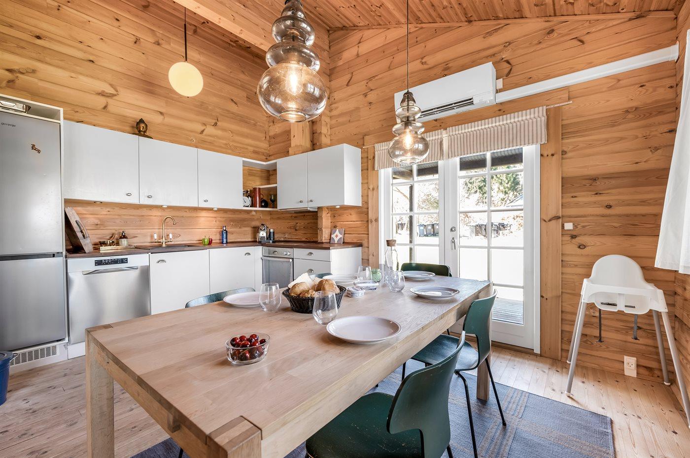 Køkkenet er udstyret med 1 køleskab. Der er 4 keramiske kogeplader, varmluftovn samt opvaskemaskine.