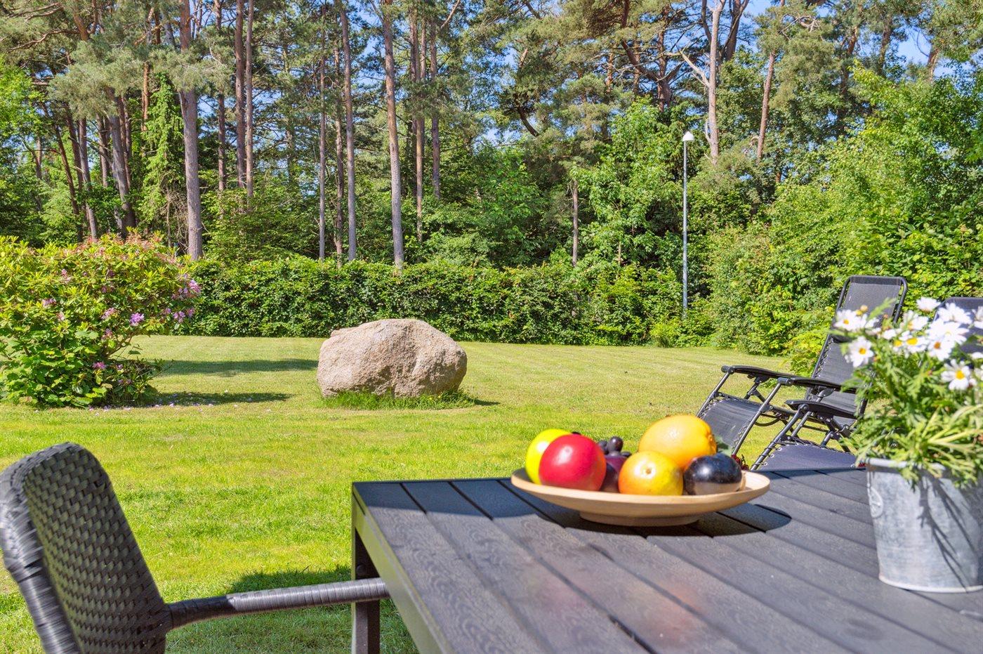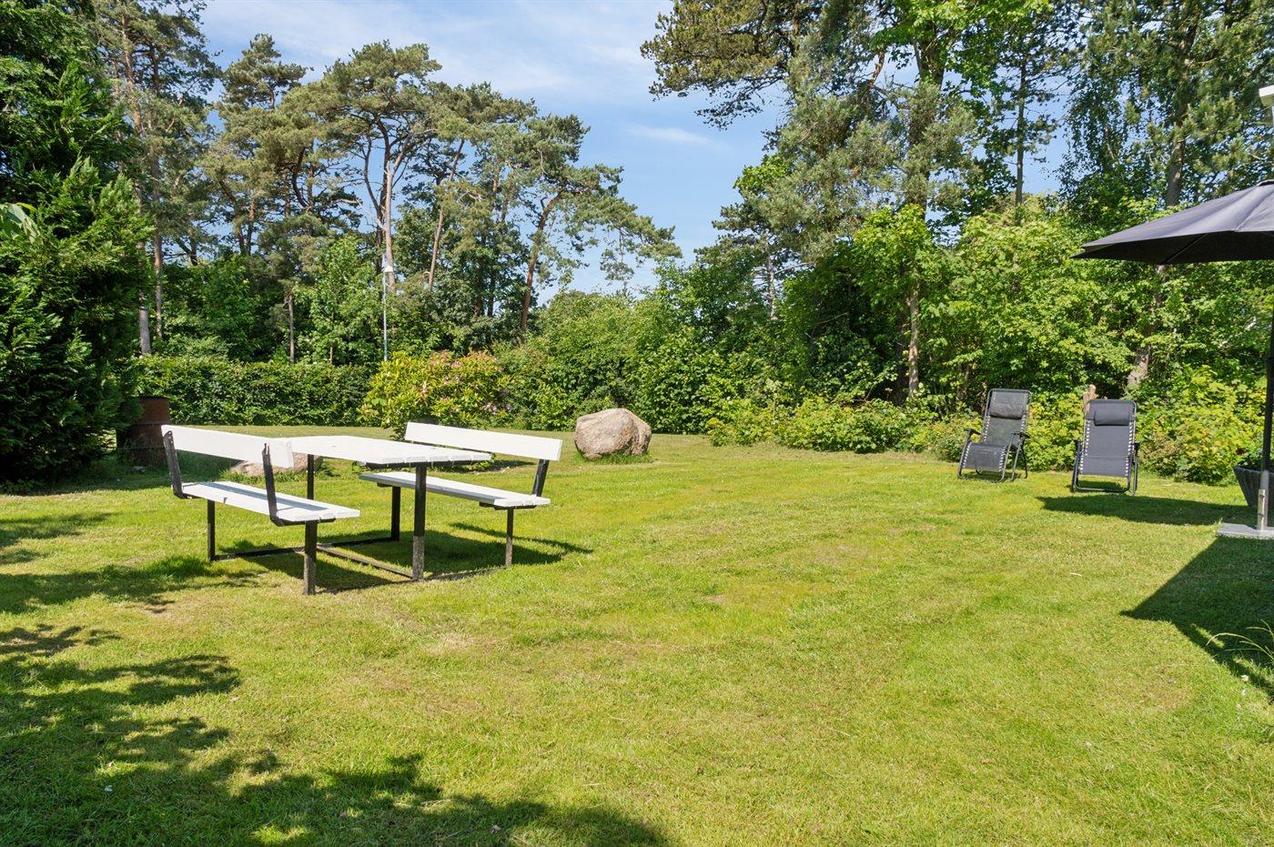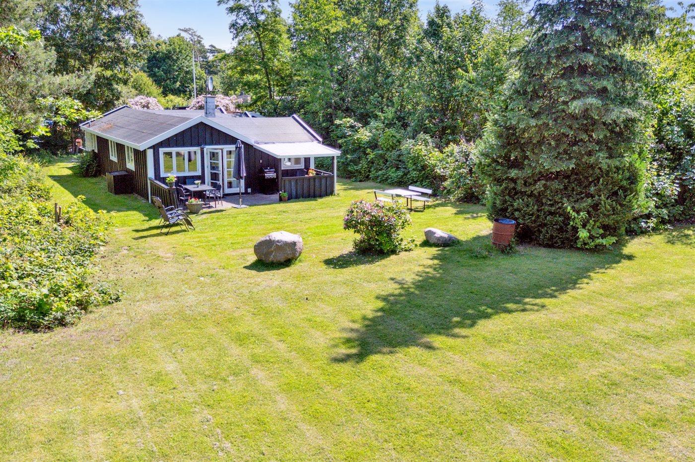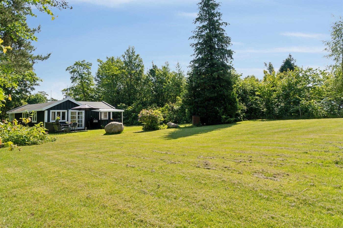 Grunden er indhegnet, hvilket gør det trygt for både børn og kæledyr at færdes frit. Sommerhuset er derfor også ideelt for børnefamilier, der ønsker en tryg og afslappende ferie i naturskønne omgivelser. Den store have indbyder til leg og aktiviteter – her er god plads til at spille både kroket og badminton.