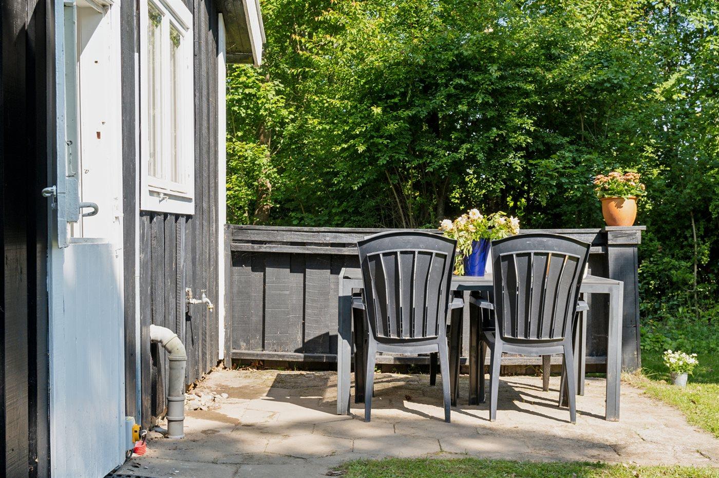 Ferieboligen er beliggende på en 1341 m² stor havegrund. Grunden er indhegnet. Der er 1000 m til havet. Nærmeste forretning er beliggende i en afstand af 800 m. Til ferieboligen hører åbent terrasseareal. Desuden er der overdækket terrasse. Der ligger en legeplads i en afstand af 900 m. Grill til rådighed. Parkering ved ferieboligen.