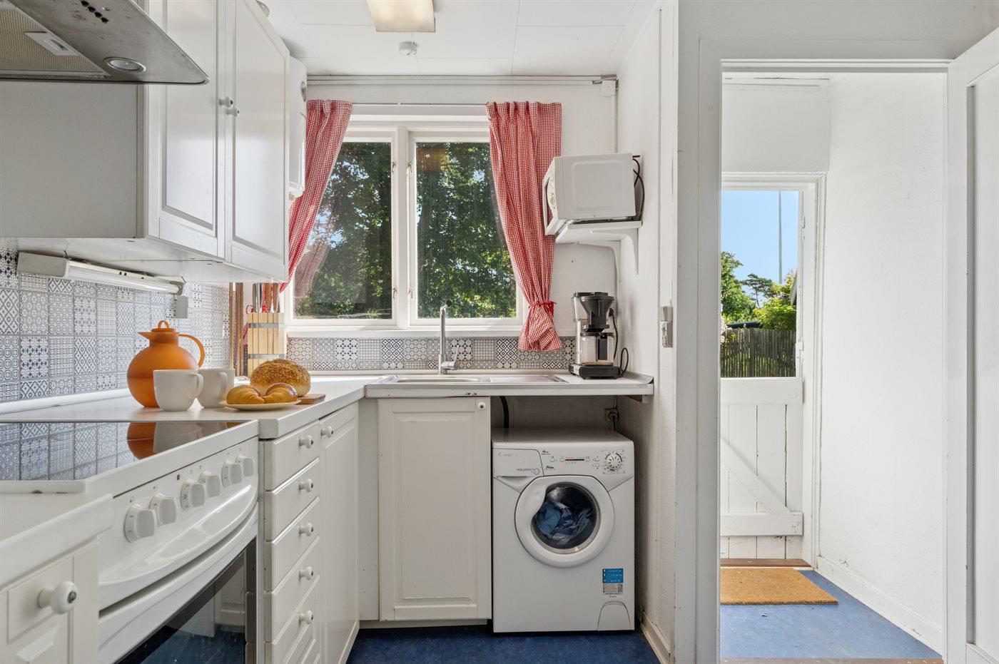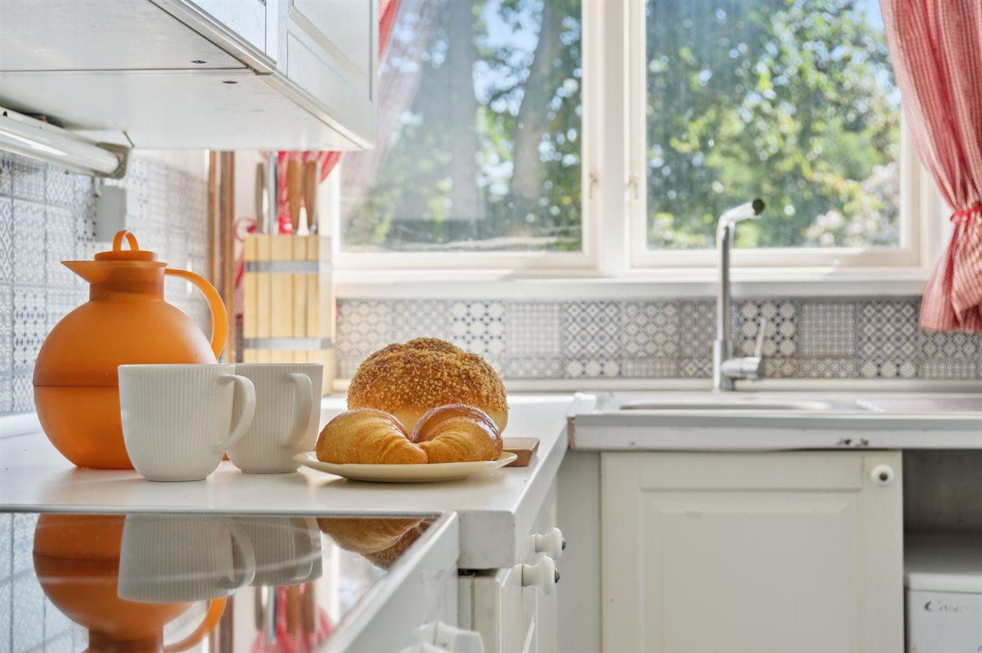 Køkkenet er udstyret med 1 køleskab. Der er 4 keramiske kogeplader, varmluftovn, mikrobølgeovn.