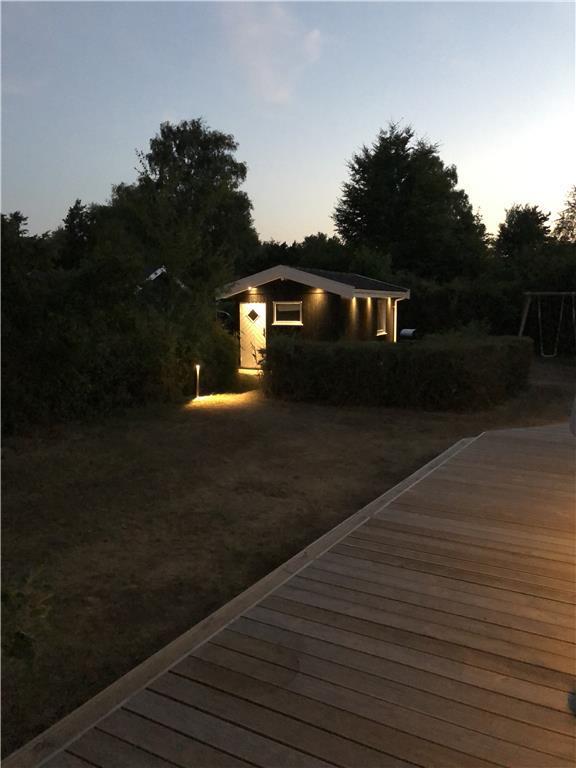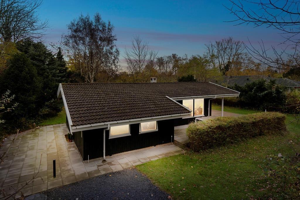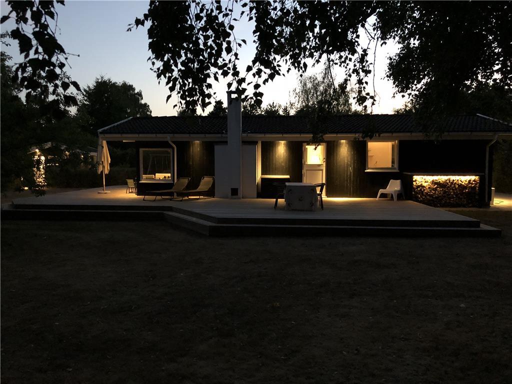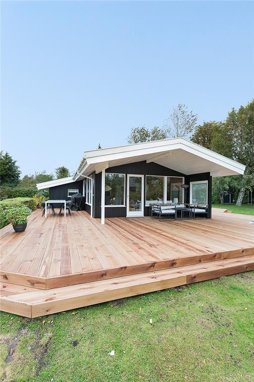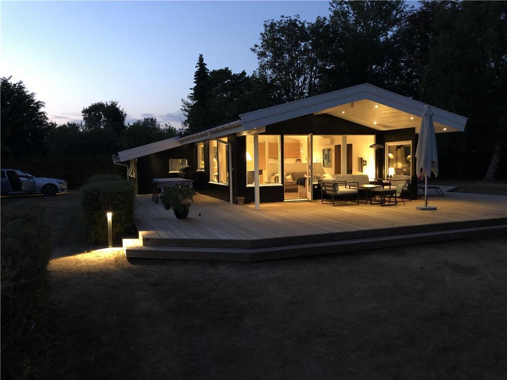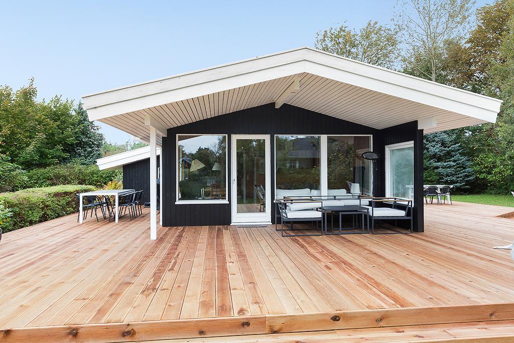Udenfor folder sommerhusets grønne omgivelser sig ud som en ugenert oase, hvor både store og små kan nyde ferielivet. Den store træterrasse snor sig omkring huset mod øst, syd og vest, og giver mulighed for at finde både sol og skygge i løbet af dagen. På den overdækkede del af terrassen står et indbydende loungesæt klar til stille morgenstunder og lange sommeraftener under åben himmel.