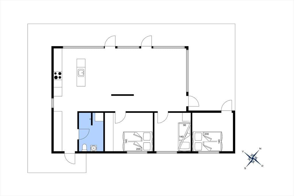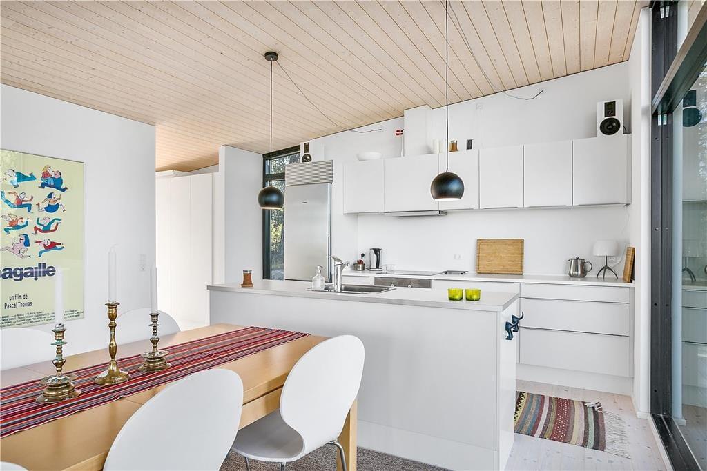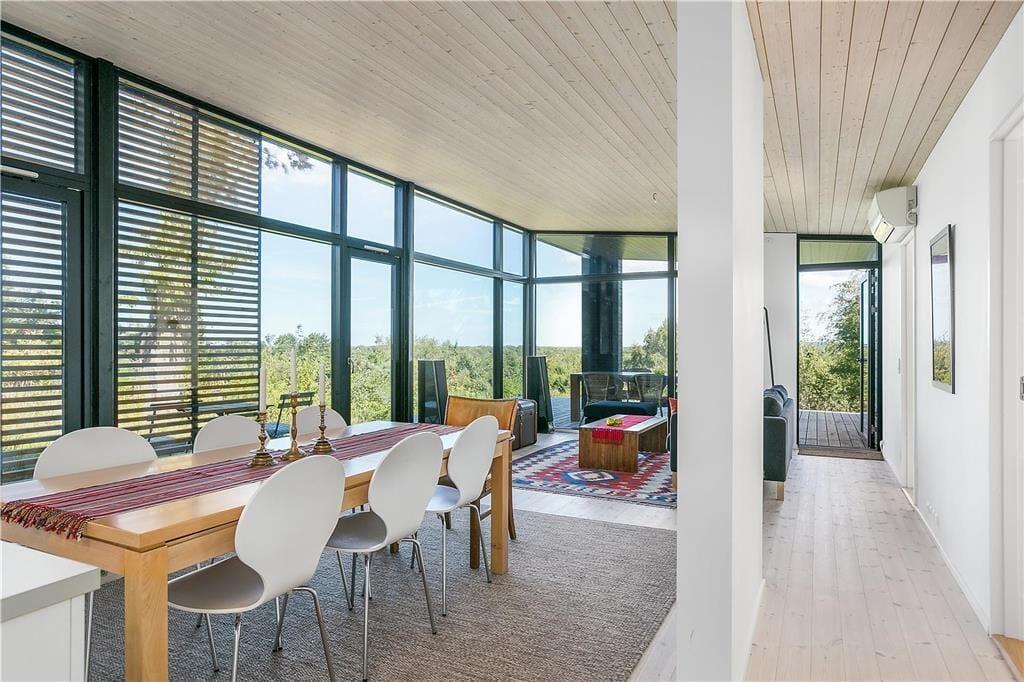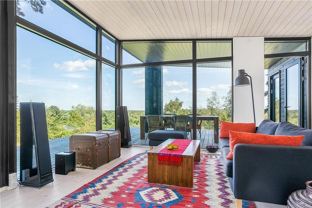 Sommerhuset byder på en rummelig opholdsstue i åben forbindelse med køkkenet. De store vinduer lukker masser af lys ind og giver en fortryllende panoramaudsigt, som du kan nyde, uanset hvor i rummet du opholder dig. Opholdsstuen skaber en varm og imødekommende atmosfære, der indbyder til hygge og samvær med familie eller venner. Her kan du tilbringe afslappende timer med en god bog, sjove brætspil eller blot nyde stilheden og udsigten til den omkringliggende natur. Køkkenet ligger centralt, så du nemt kan tilberede måltider og stadig være en del af samtalen.