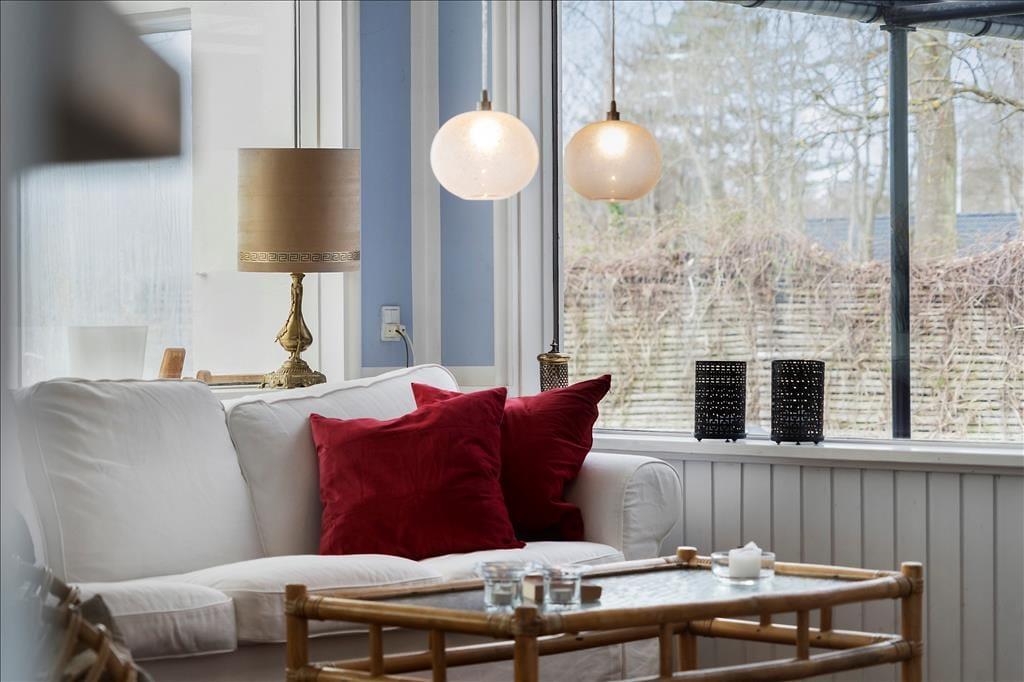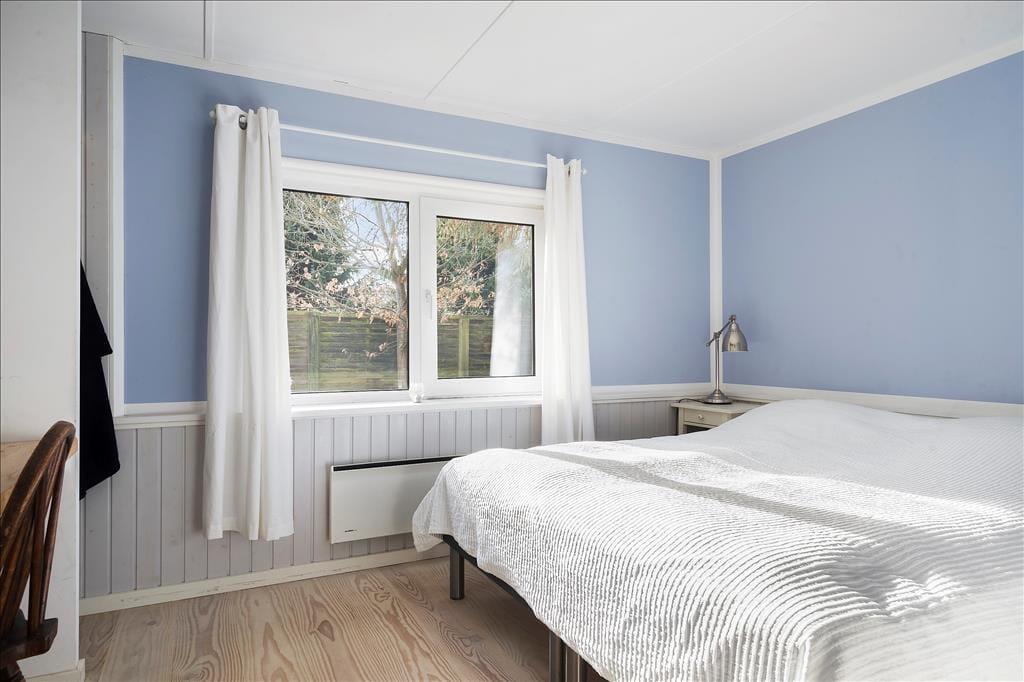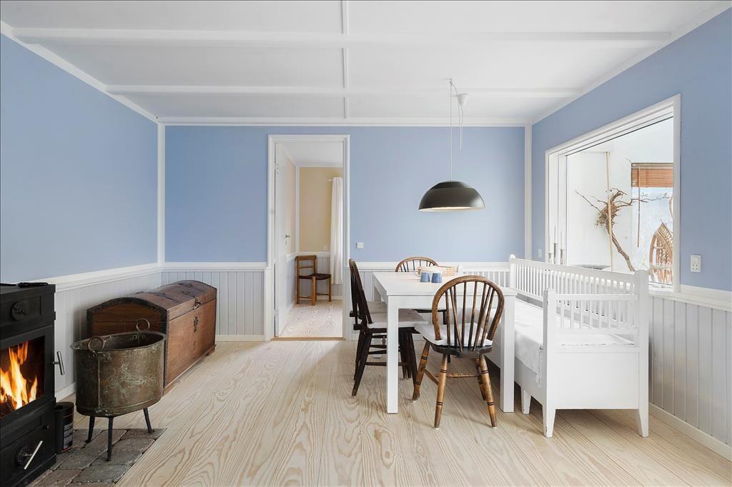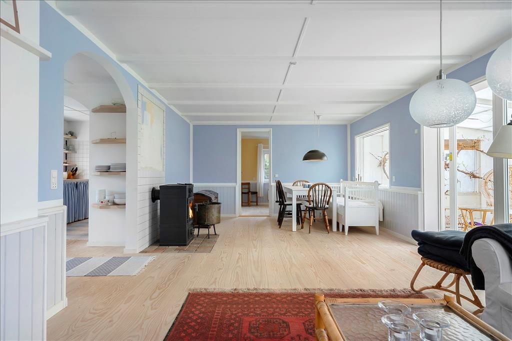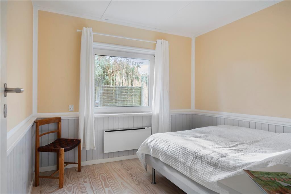 Entre. Stue med brændeovn, spiseplads og udgang til udestuen. Udestue med spiseplads og udgang til haven. Køkken med gode faciliteter. 2 soveværelser med dobbeltsenge. Badeværelse med bruser.