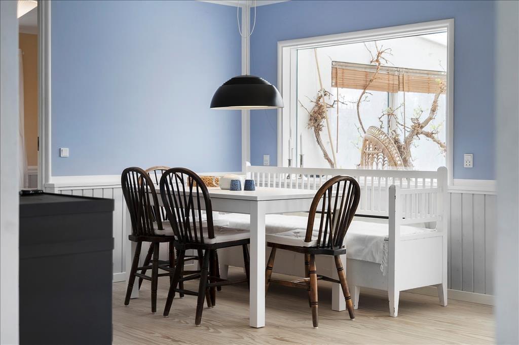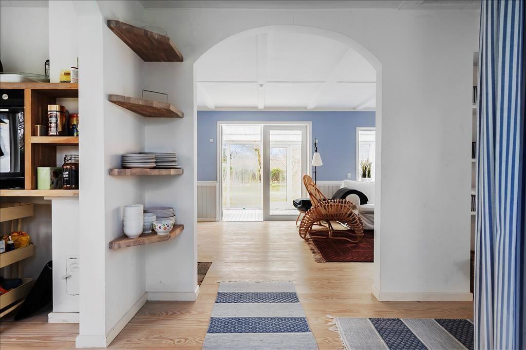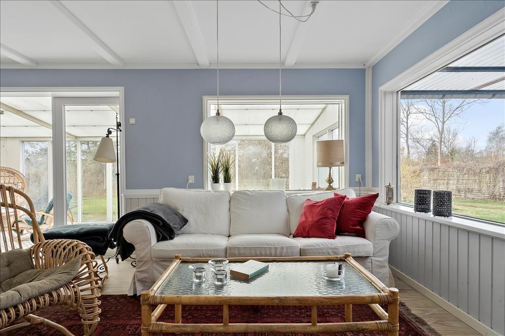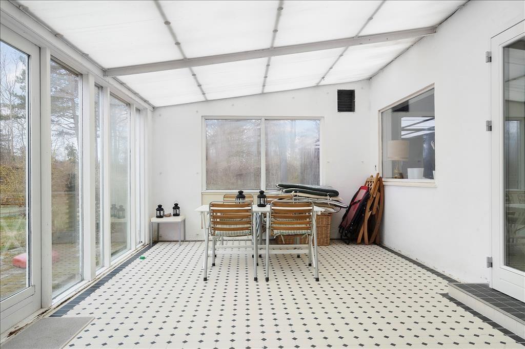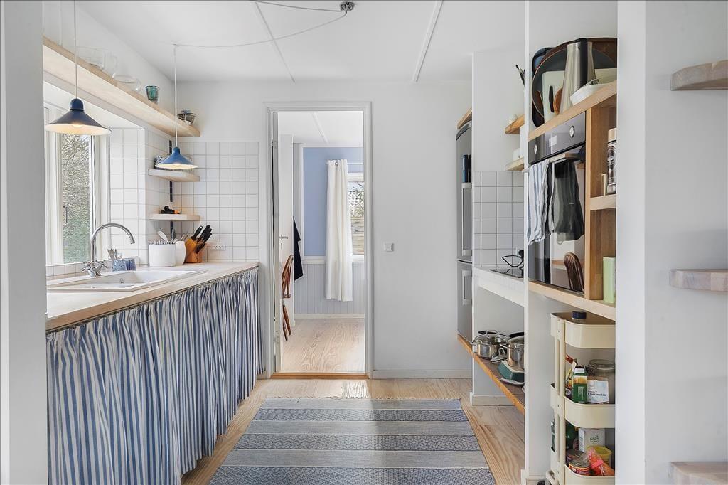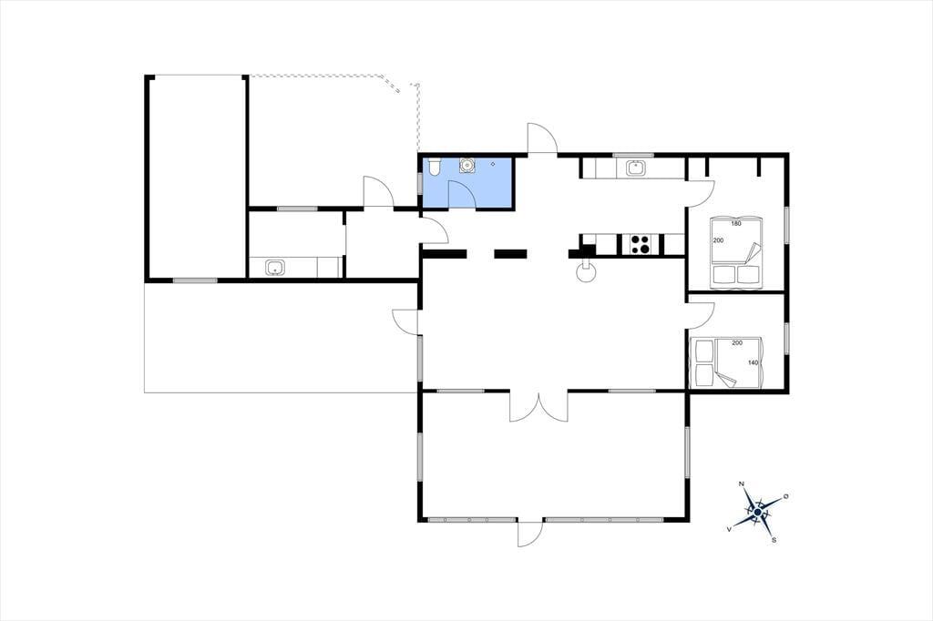Entre. Stue med brændeovn, spiseplads og udgang til udestuen. Udestue med spiseplads og udgang til haven. Køkken med gode faciliteter. 2 soveværelser med dobbeltsenge. Badeværelse med bruser.