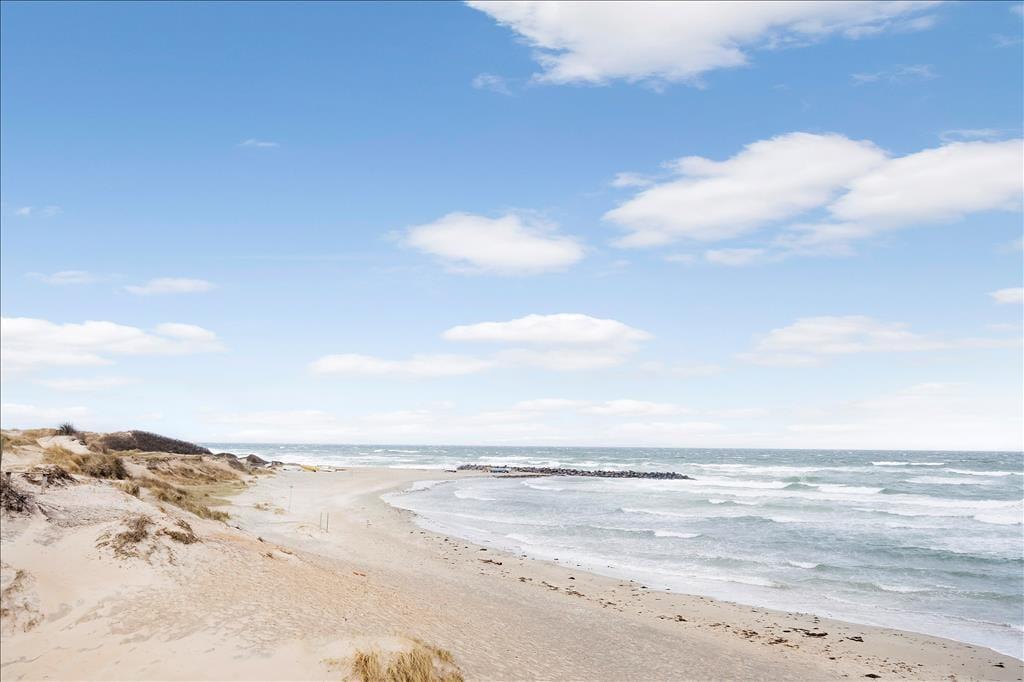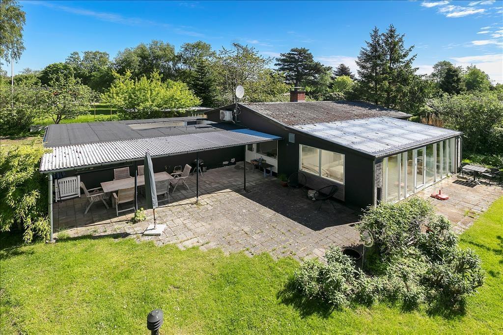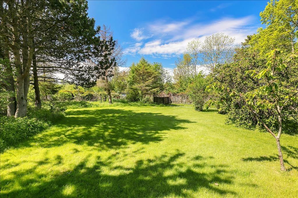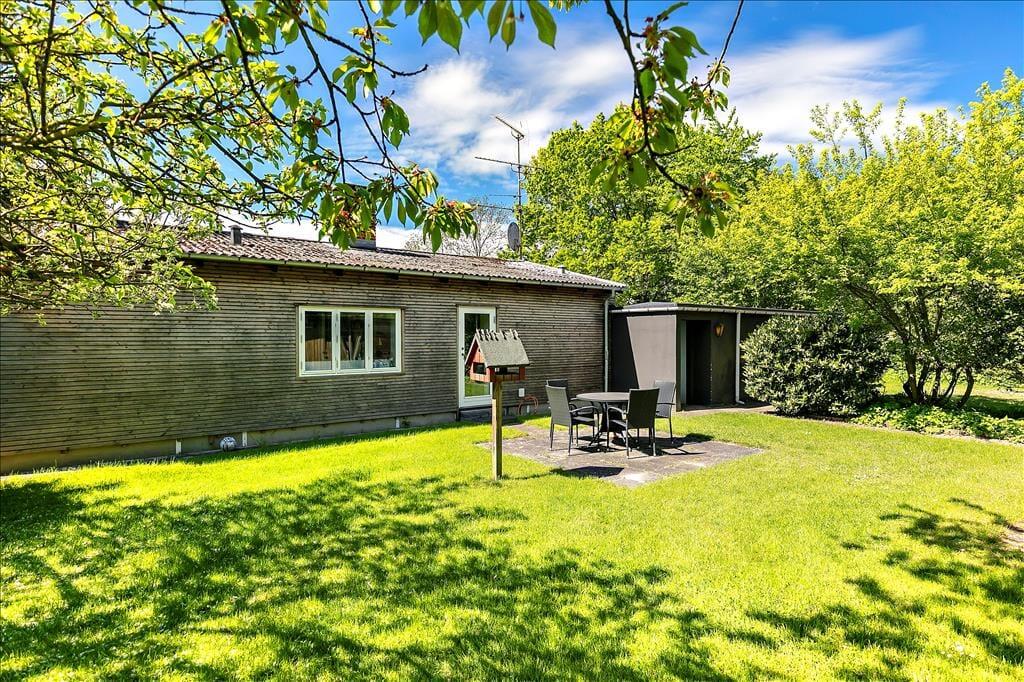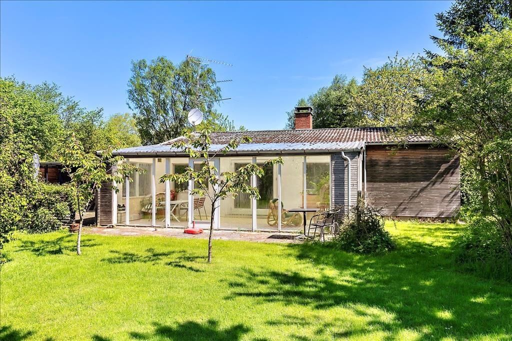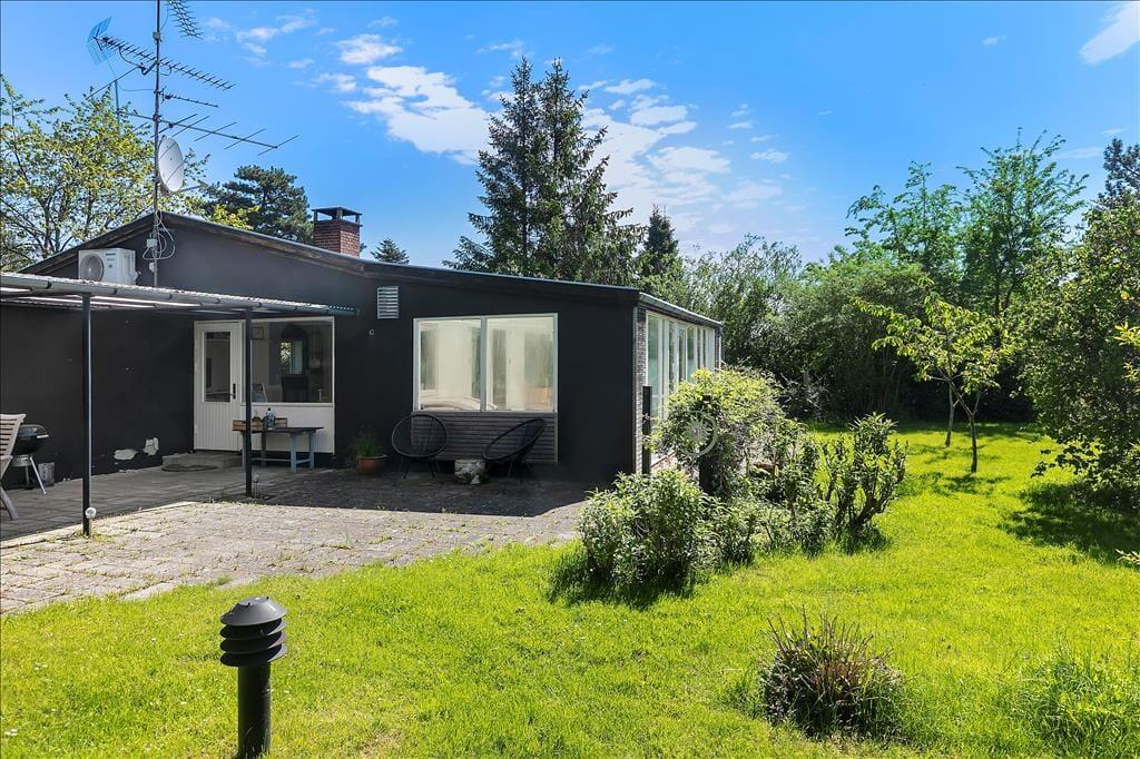 Sommerhuset er beliggende på en stor grund med græsplæne og flere terrasser og sidepladser. En terrasse på og delvist overdækket terrasse på bagsiden forsiden af huset.
