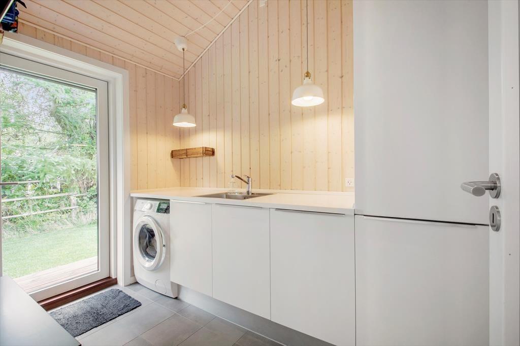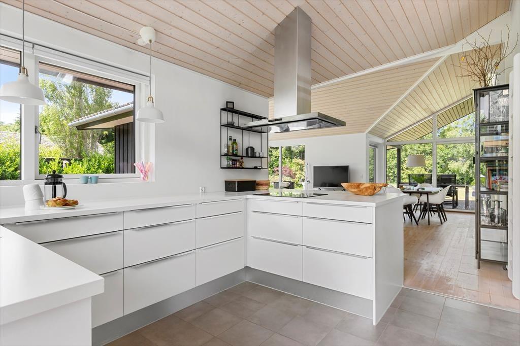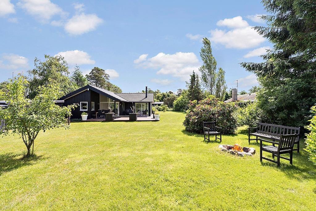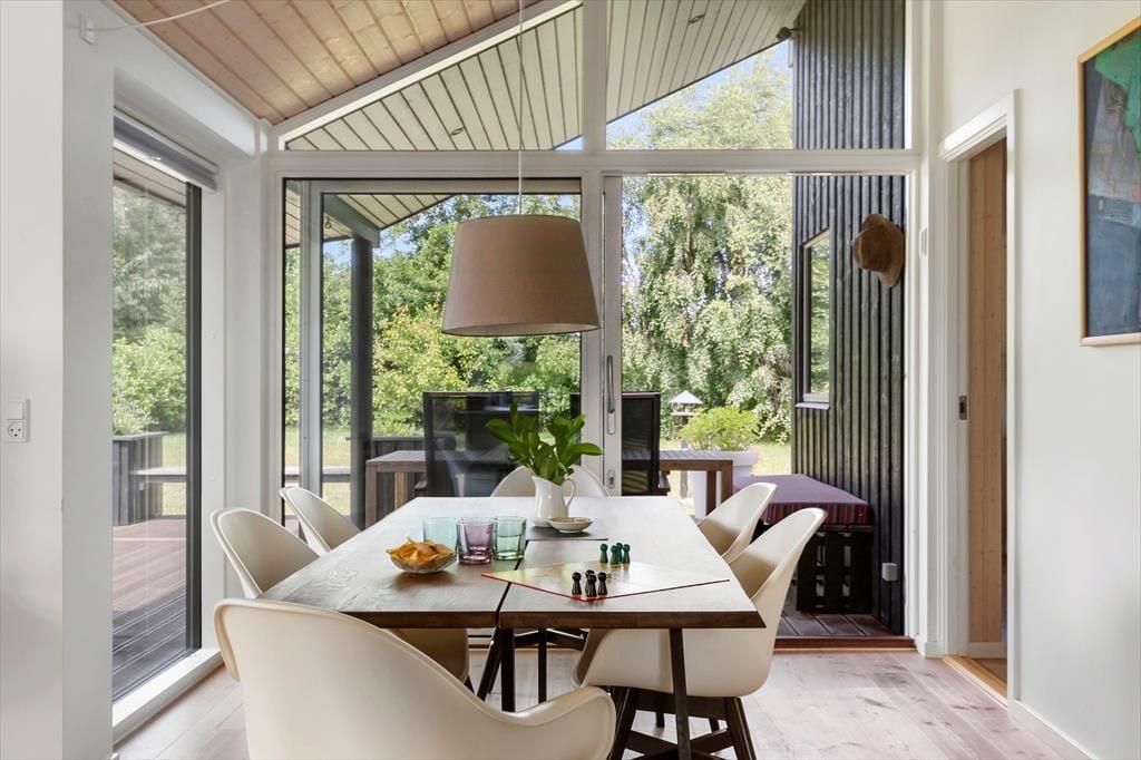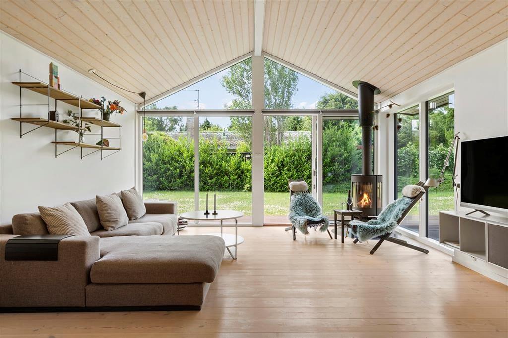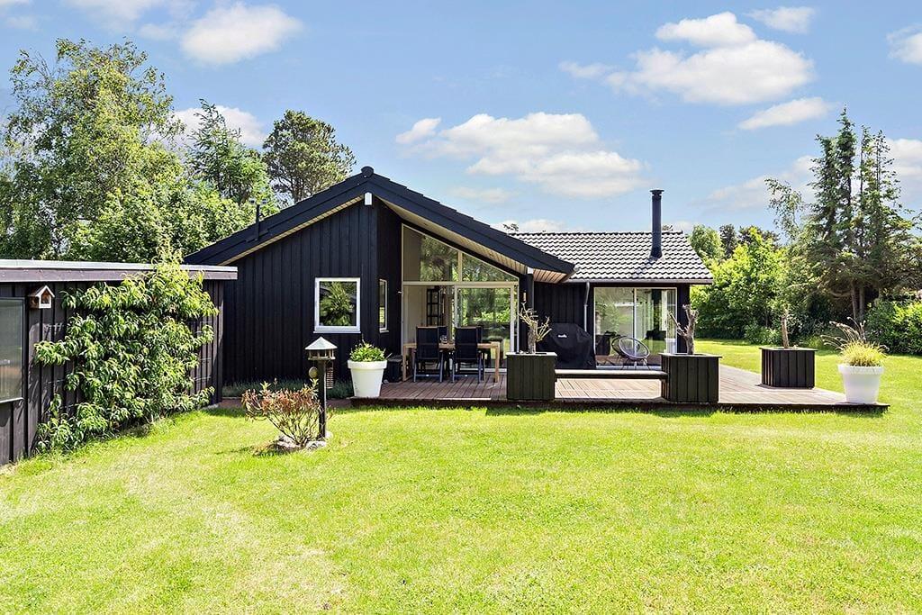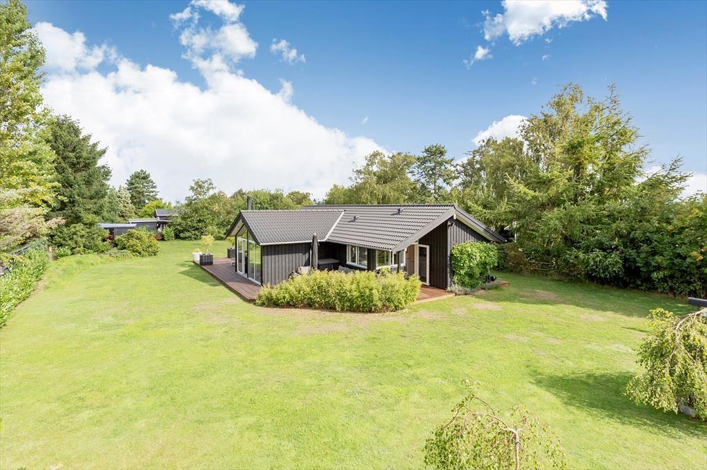 Til et lækkert og moderne sommerhus fra 2018, der indbyder til ren feriestemning. Sommerhuset har et dejligt lyst køkken-alrum, hvor familien kan samles til måltider og hyggelige stunder. Den rummelige opholdsstue er perfekt til afslapning med dens hyggelige brændeovn og udgang til terrassen, der lader naturen komme helt tæt på.