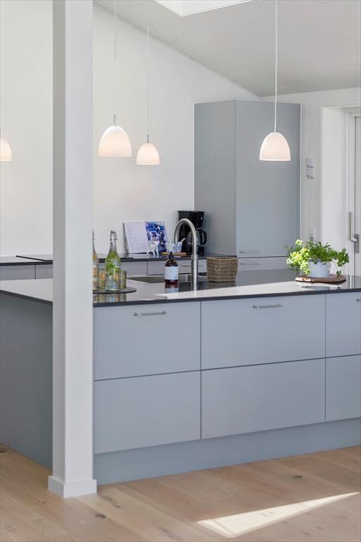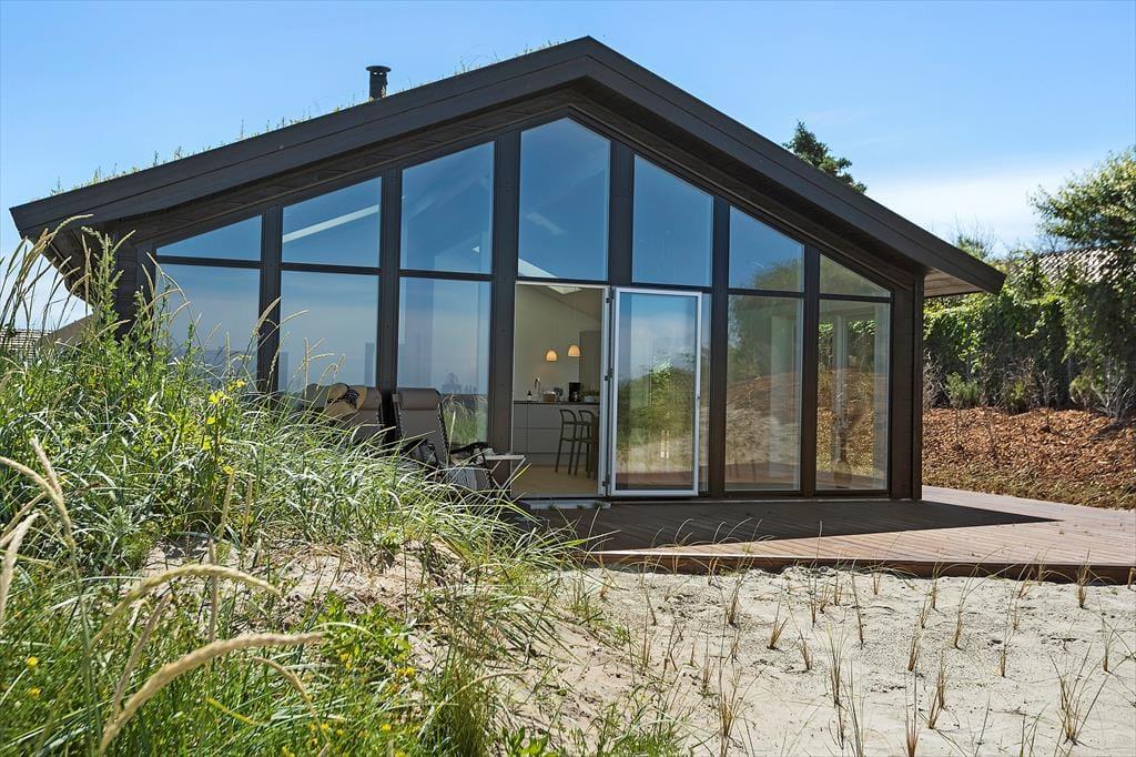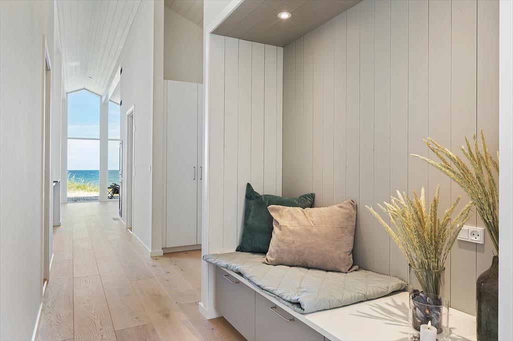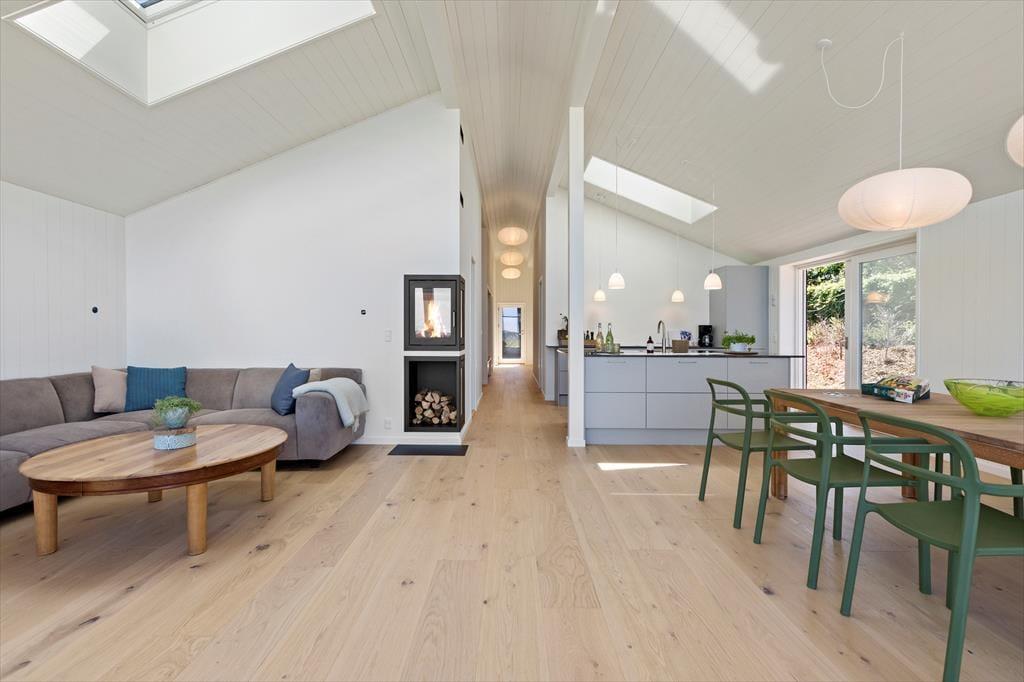 Velkommen til dette enestående nybyggede sommerhus på stranden i Liseleje. Når du træder indenfor, vil du straks bemærke den moderne og stilfulde indretning, der skaber en indbydende atmosfære. Huset er designet med store panoramavinduer, der lader den mest vidunderlige havudsigt strømme ind i stuen og videre gennem hele huset. Her kan du nyde den betagende udsigt fra den komfortable sofa i stuen eller mens du tilbereder måltider i det veludstyrede køkken. Hvert rum er indrettet med fokus på komfort og æstetik, hvilket skaber en perfekt ramme for hygge og afslapning.