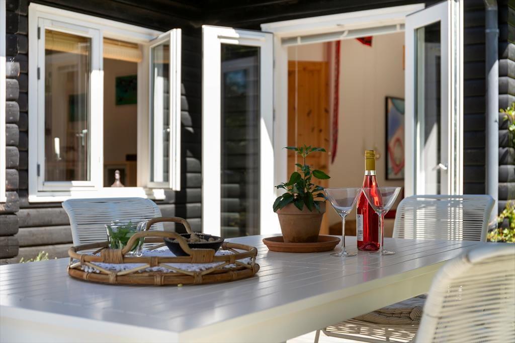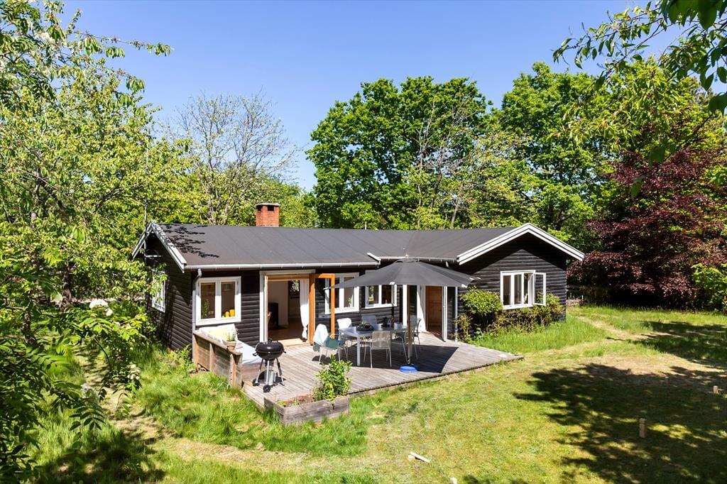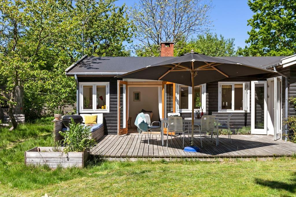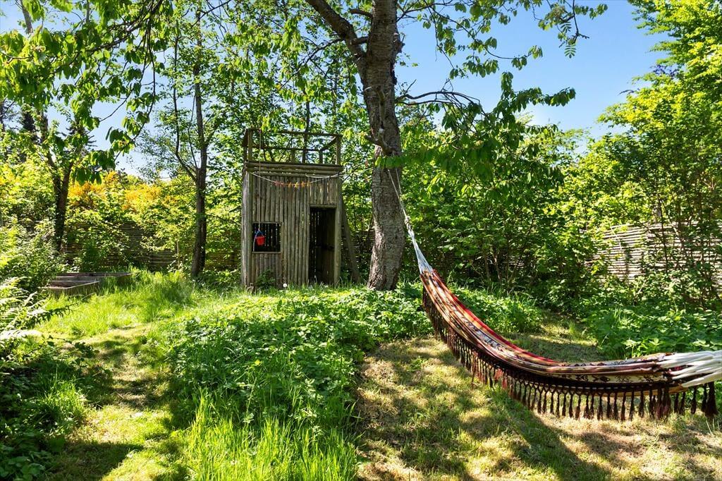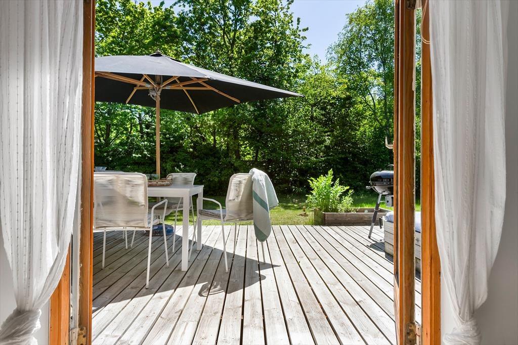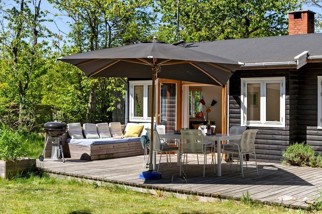 Udenfor venter en frodig, privat have, hvor fuglenes sang blander sig med lyden af brænde, der knitrer i bålstedet. Her er plads til at koble af og være til – måske med morgenkaffen under parasollen på terrassen, eller en lur i hængekøjen mellem træerne. Den store træterrasse er et naturligt samlingspunkt, hvor måltider kan nydes i det fri, og grillen får lov at danne ramme om de lange, lune sommeraftener. Når mørket falder på, og gløderne fra bålet lyser haven op, er det svært ikke at mærke ferieroen sænke sig.