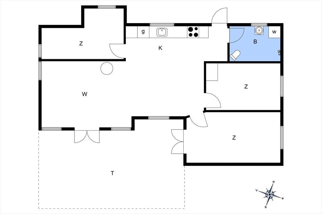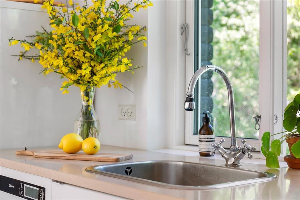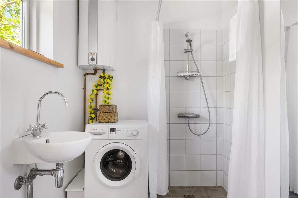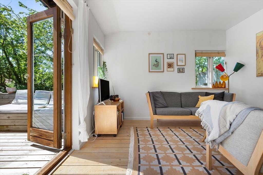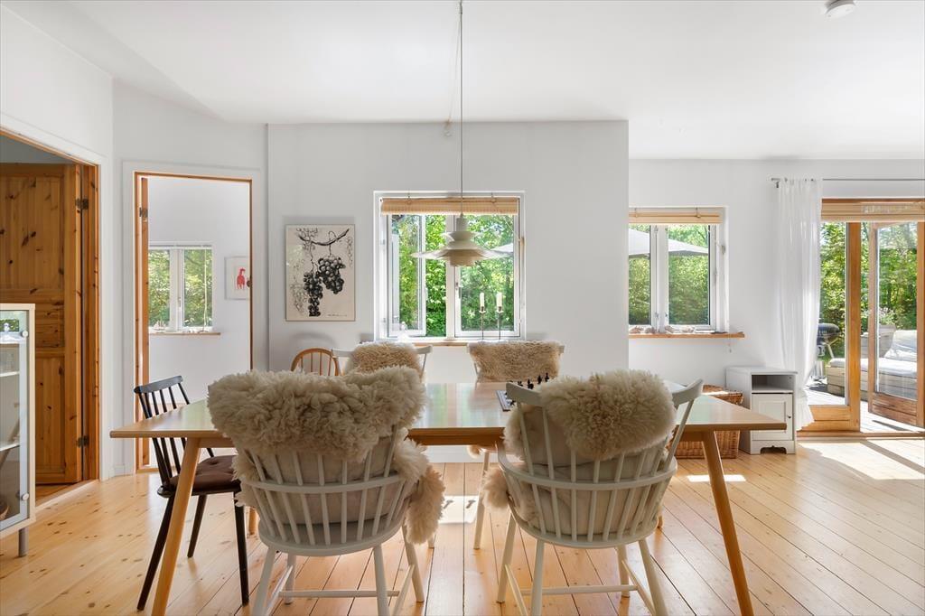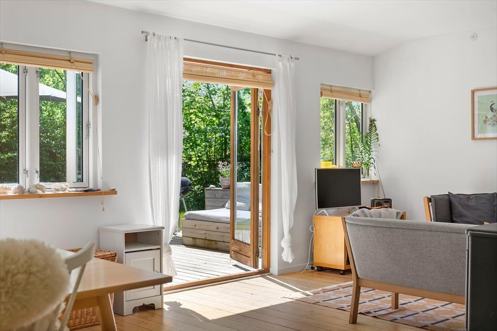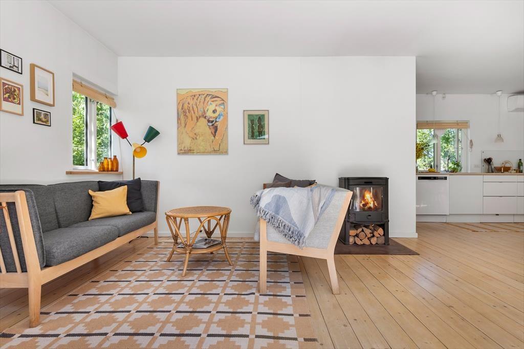Det første, du mærker, når du træder indenfor, er lyset. Store vinduespartier lukker solen ind og skaber en let og imødekommende stemning i den åbne opholdsstue, som ligger i direkte forbindelse med det funktionelle køkken. Her er plads til at være sammen – om madlavning, spil og snak. Stuen er indrettet med brændeovn, der varmer på de køligere aftener og inviterer til ægte sommerhushygge med tæpper og varme drikke.