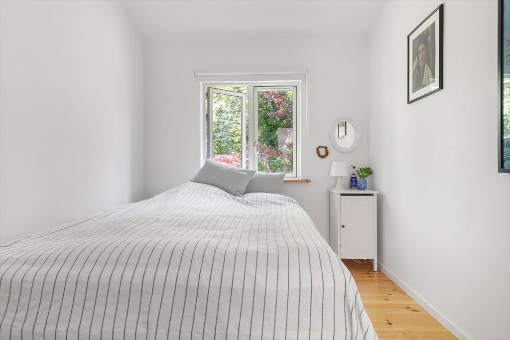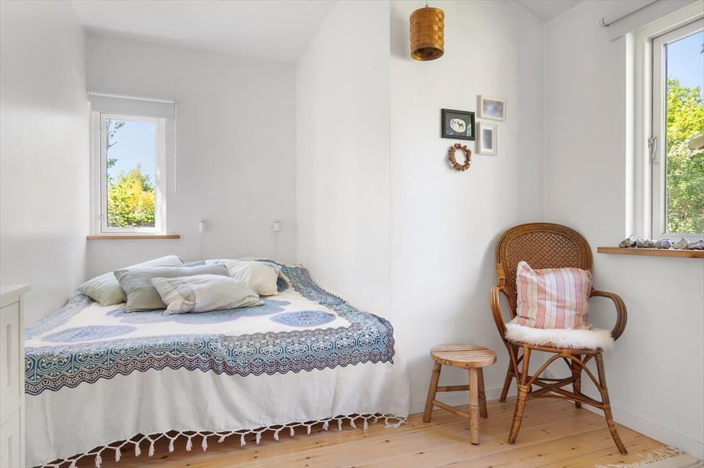 Når dagen går på hæld, fordeler man sig nemt i de tre soveværelser – to med dobbeltsenge og ét med to enkeltsenge – alle med vinduer ud til den grønne have, som giver ro og frisk luft til en god nats søvn.