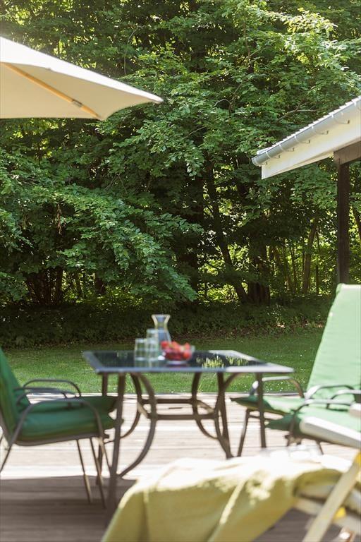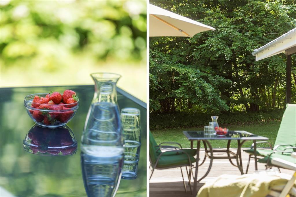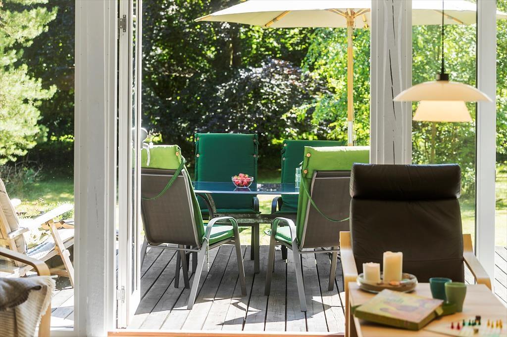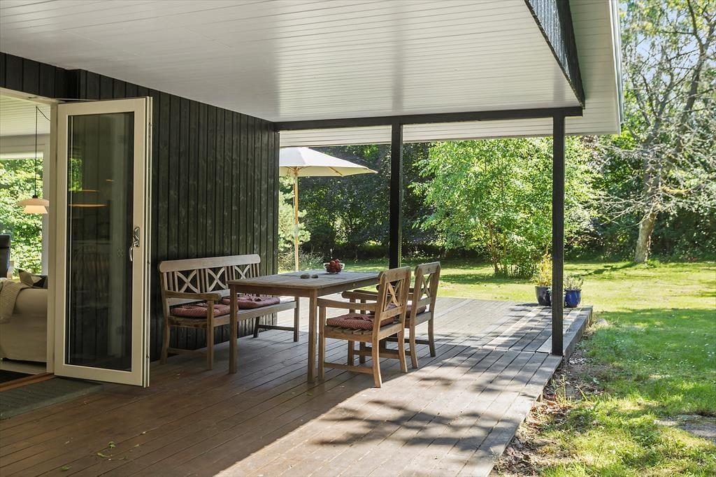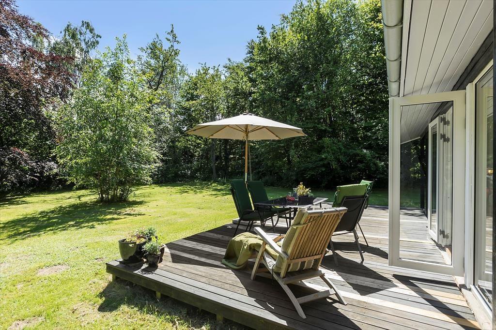 Udenfor strækker haven sig som et grønt paradis, hvor børnene kan lege frit og udforske. På terrassen kan du samles med familien, grille lækre måltider og nyde hinandens selskab under den beskyttende overdækning, eller du kan lade solens stråler kærtegne din hud fra en komfortabel liggestol.