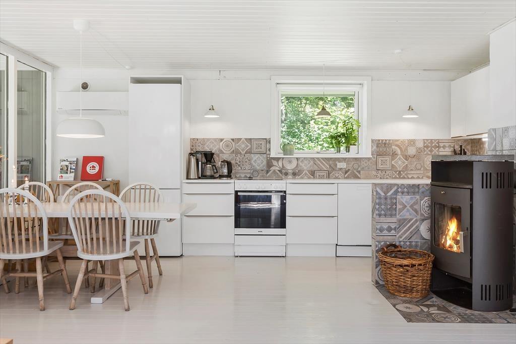 Centrum for hygge er den nyere brændeovn, der spreder varme og atmosfære i rummet, mens den blide hvirvel af en varmepumpe sikrer, at komforten er i top. Fra stuen fører en dør ud til træterrassen, som er delvist overdækket, hvor du kan lade tankerne flyde frit og trække frisk luft ind.