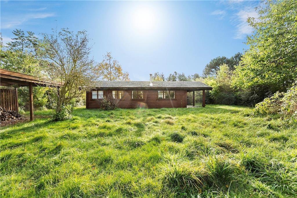 Der er overdækket terrasse, hvor man kan sidde med en kop kaffe og se børnene lege på plænen. Grunden er delvist lukket med buskads - både mod vej og mod naboer. Huset er beliggende i starten af lukket vej, hvor der kun er trafik til de øvrige huse på vejen.